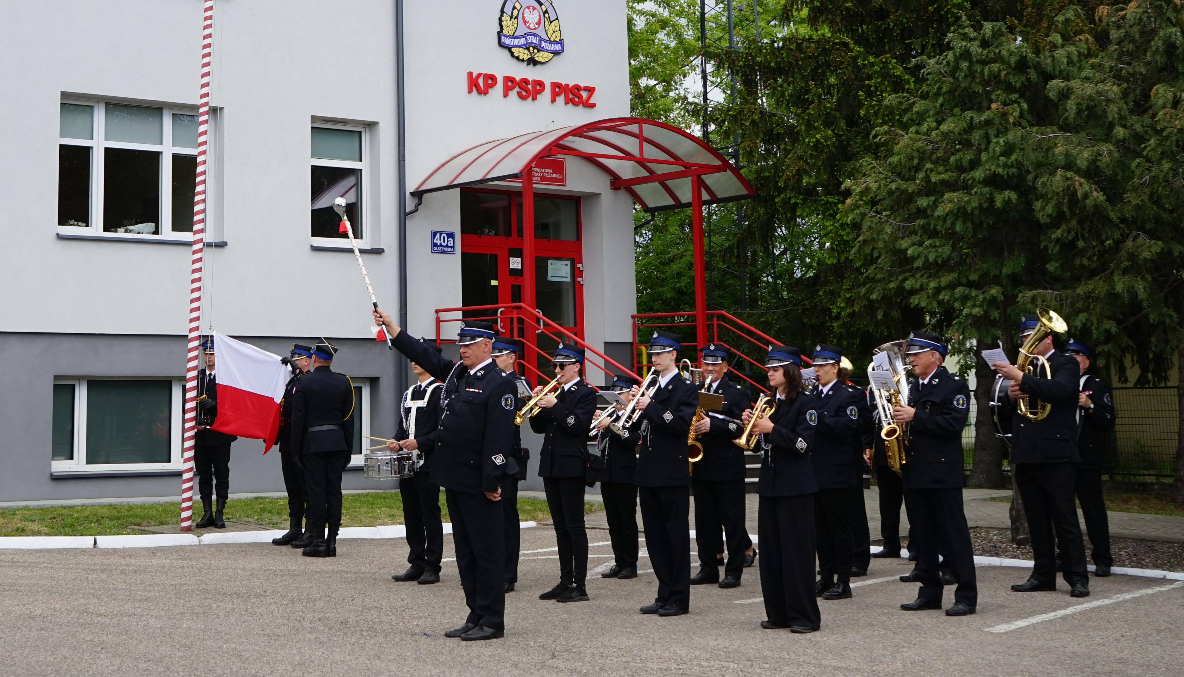 Jako pierwszy głos zabrał Komendant Powiatowy PSP w Piszu st. bryg. Paweł Pieńkosz, który przywitał gości, a następnie złożył życzenia wszystkim funkcjonariuszom oraz pracownikom Komendy Powiatowej, a także druhom ochotnikom powiatu piskiego. Nawiązał on również w swoim przemówieniu do 20 rocznicy wstąpienia Polski do UE. Przedstawił w kilku słowach, jak zmieniało się wyposażenie piskiej komendy w ciągu tych 20 lat, sprawiając, iż z jednostki posiadającej ówcześnie wysłużone samochody staliśmy się nowoczesną jednostką, wyposażoną w najnowsze pojazdy oraz najwyższej jakości sprzęt ratowniczy.