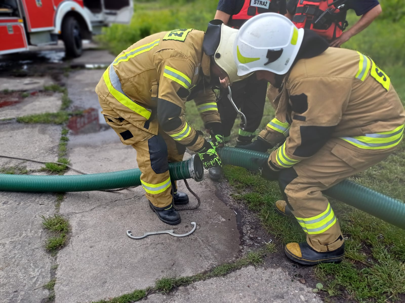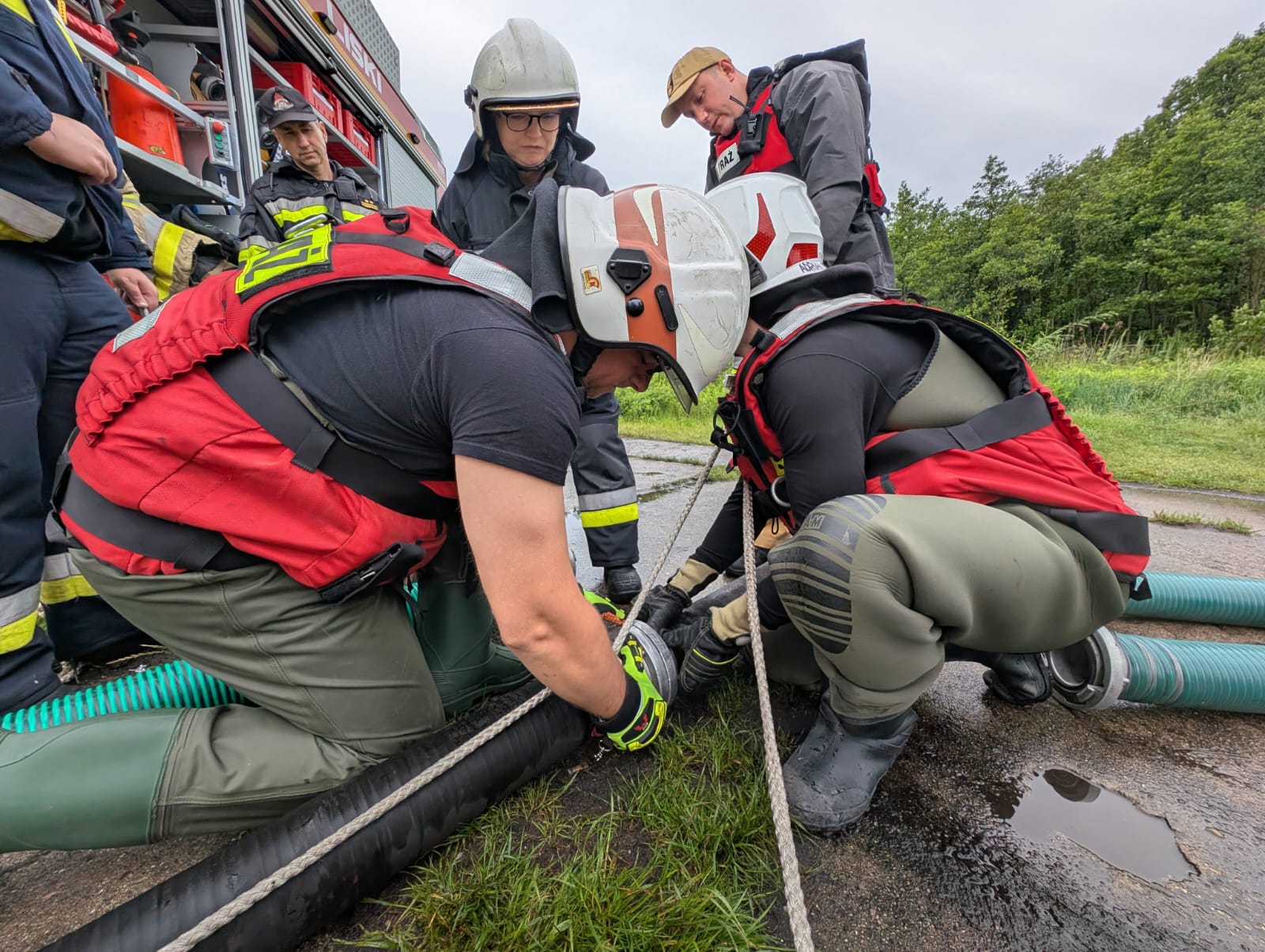 - Gaszenie pożaru lasu – tankowanie geodezyjne ze zbiornika naturalnego (rzeka Pisa). Zadaniem strażaków było podanie dwóch skutecznych prądów gaśniczych na palący się las.