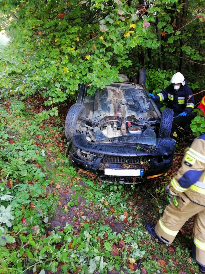 Dachowanie pojazdu osobowego na drodze krajowej nr 58.