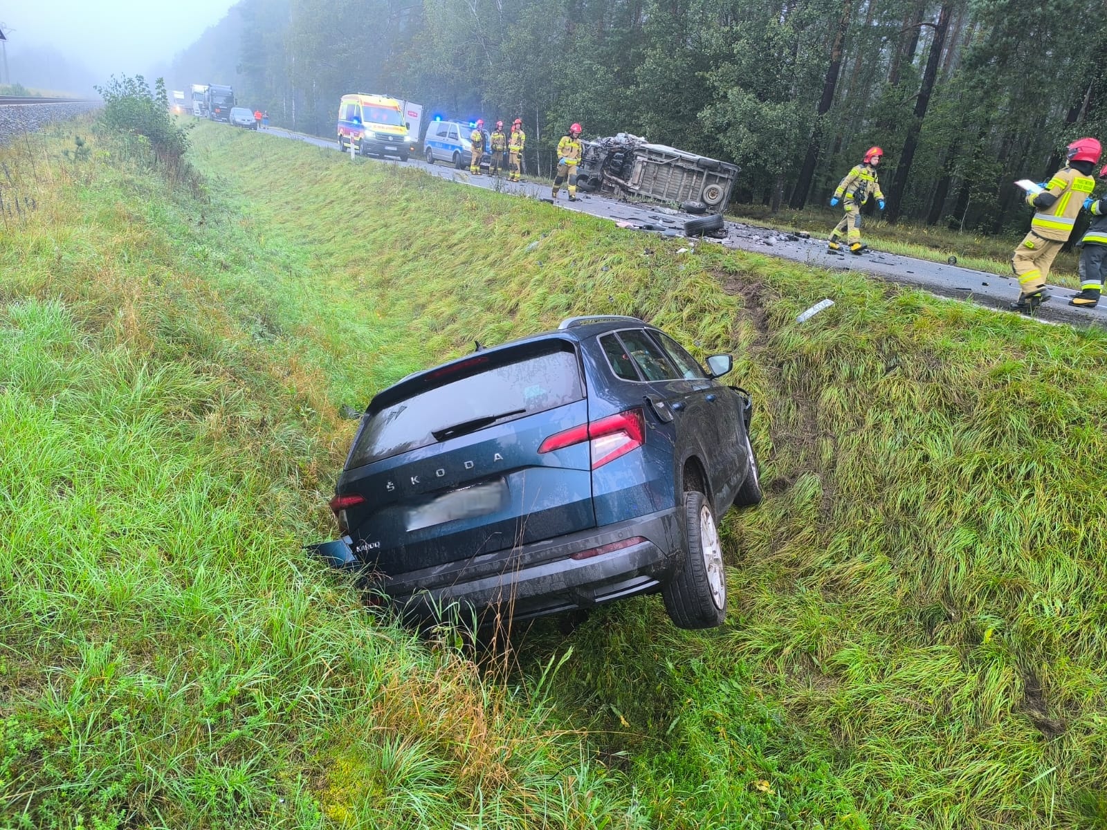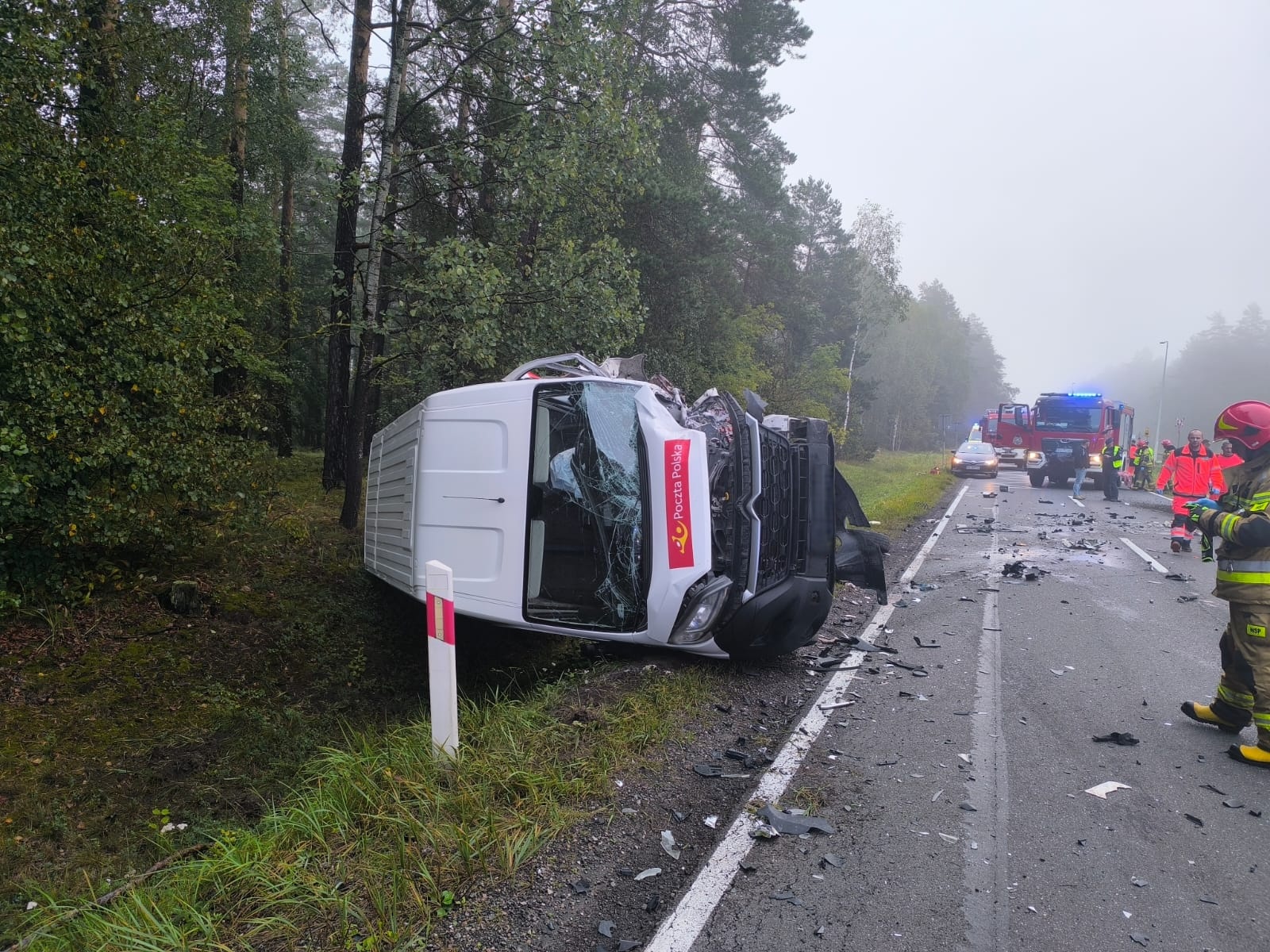 W dniu 12.09.2025 o godz. 07:02 do Stanowiska Kierowania Komendanta Powiatowego PSP w Piszu wpłynęło zgłoszenie o zderzeniu dwóch samochodów osobowych na drodze krajowej 58 na trasie Ruciane-Nida - Pisz. Po dojeździe na miejsce zdarzenia zastępów Straży Pożarnej Kierujący Działaniem Ratowniczym (KDR) zastał rozbite dwa samochody osobowe, które znajdowały się w rowie. Działania polegały na zabezpieczeniu miejsca zdarzenia, pomocy osobom poszkodowanym w wyjściu z pojazdów (nie byli zakleszczeni), pomocy w kierowaniu ruchem drogowym oraz odłączeniu akumulatorów w pojazdach. W trakcie działań KDR ustalił, że w zdarzeniu brała udział również ciężarówka (uszkodzona naczepa pojazdu), która była oddalona od miejsca zdarzenia około 100 metrów, kierowcy nic się nie stało, nie potrzebował pomocy medycznej. Dwie osoby po przebadaniu przez ratowników medycznych zostały zabrane do szpitala na dalsze obserwacje. Na czas działań droga była całkowicie zablokowana.