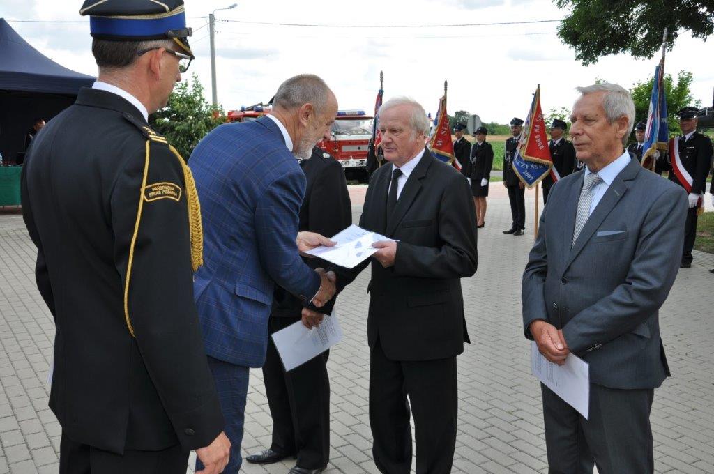 Ten wspaniały jubileusz był również okazją do wręczenia druhom decyzji o przyznaniu świadczenia ratowniczego. Wręczenia dokonali Poseł na Sejm RP Jan Mosiński wraz z zastępcą Komendanta Powiatowego Państwowej Straży Pożarnej w Pleszewie bryg. Waldemarem Barańskim.