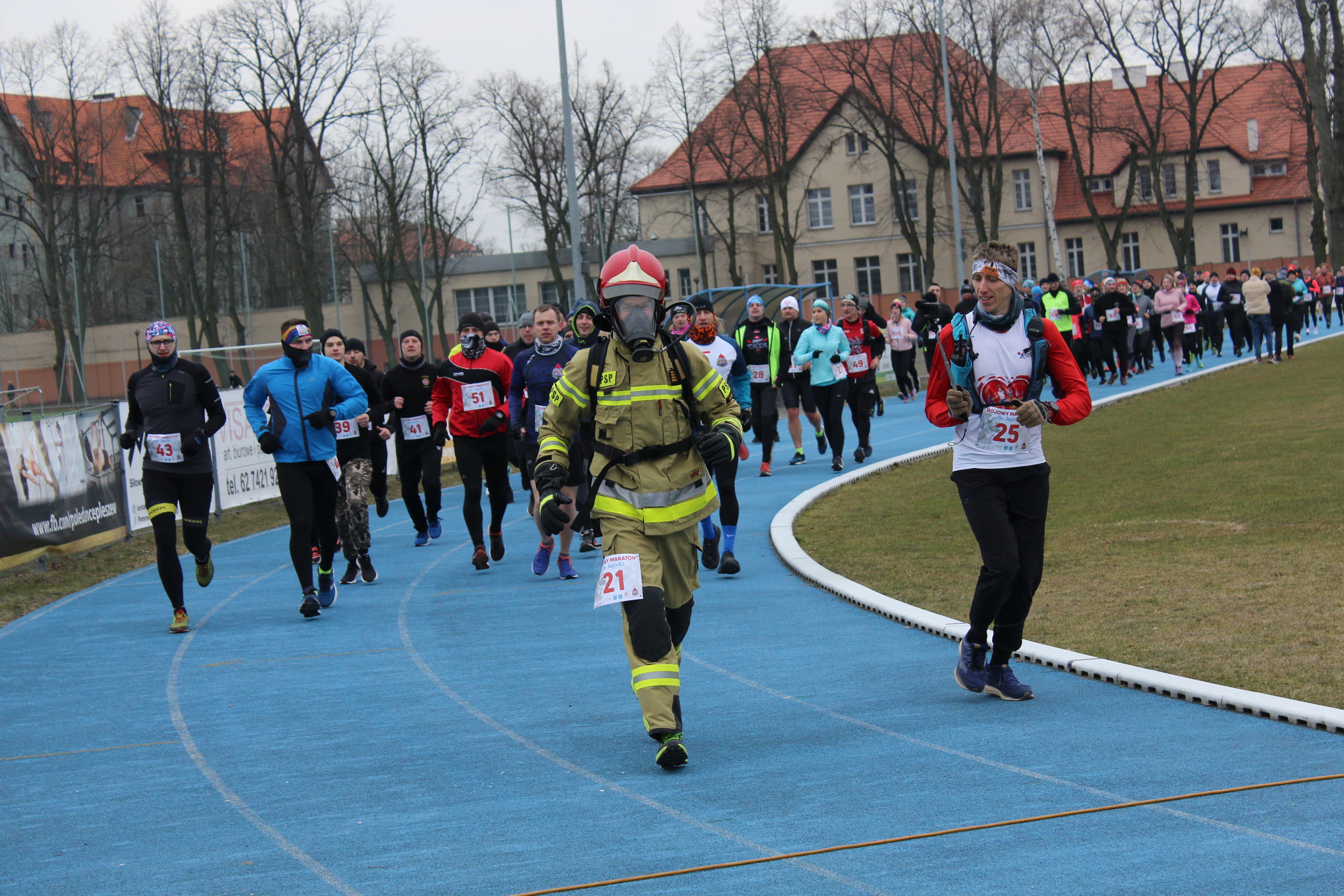 Głównym pomysłodawcą imprezy był mł. ogn. Paweł Milczarek, który w ubraniu specjalnym i aparacie ochrony dróg oddechowych przebiegł pełny maraton – 42 kilometry! Oprócz niego jedynie ośmiu startujących zdołało pokonać taki dystans.