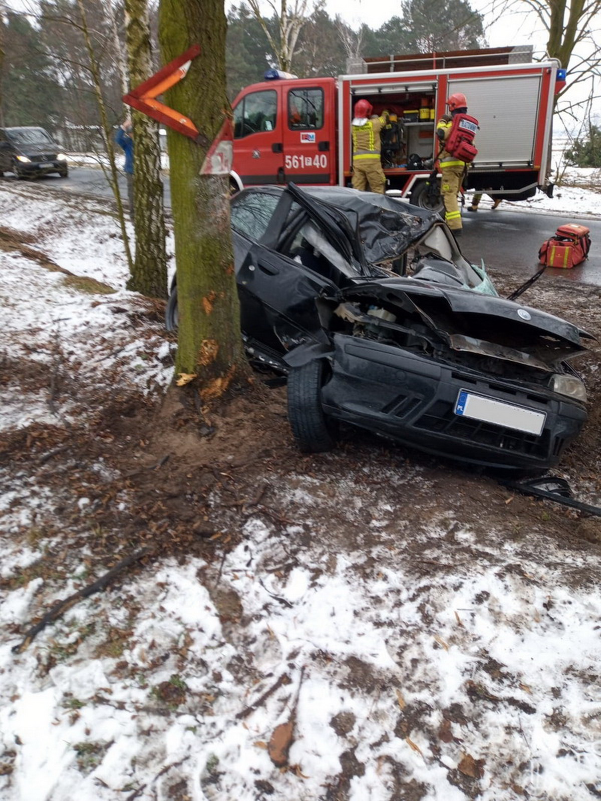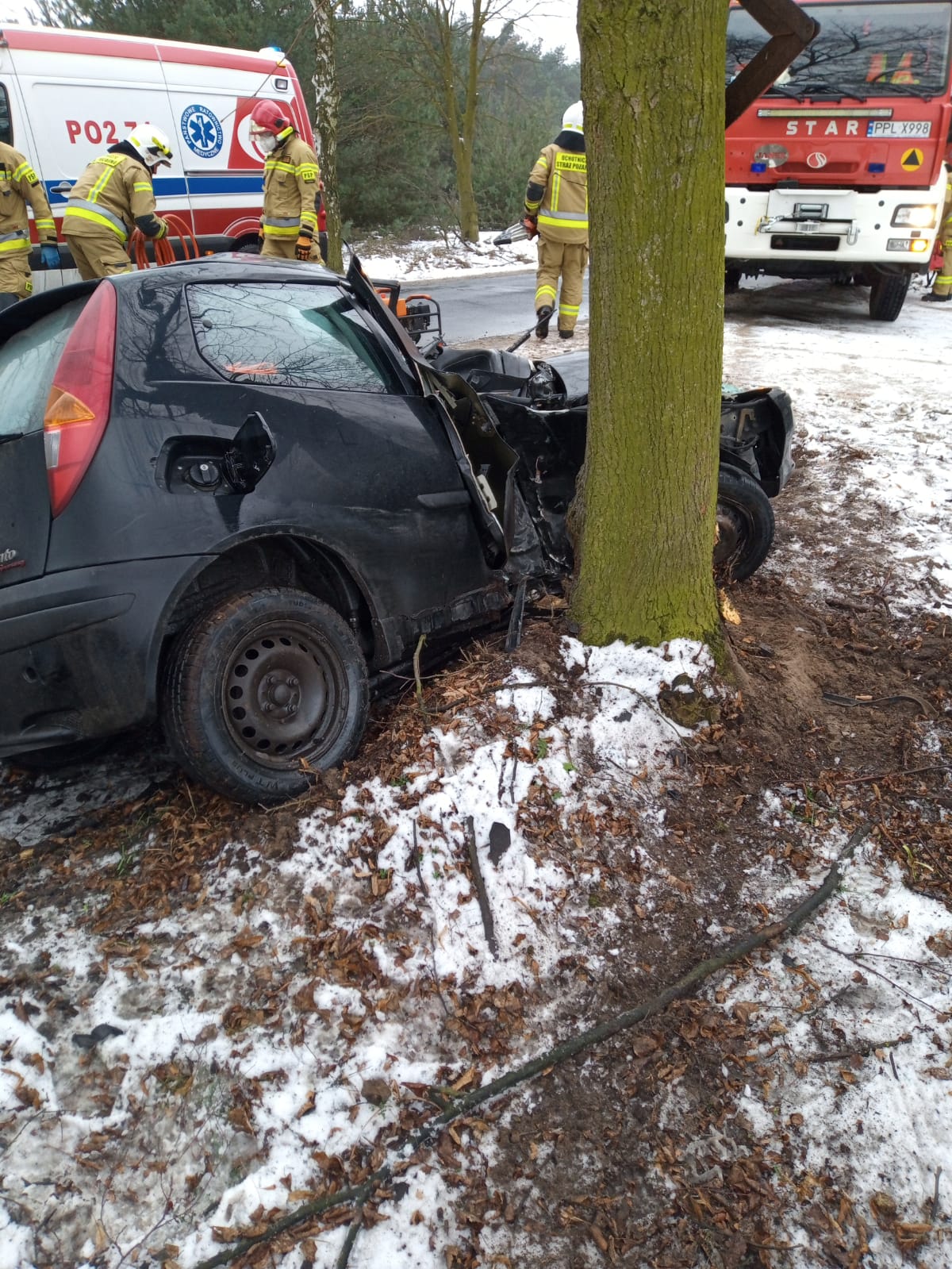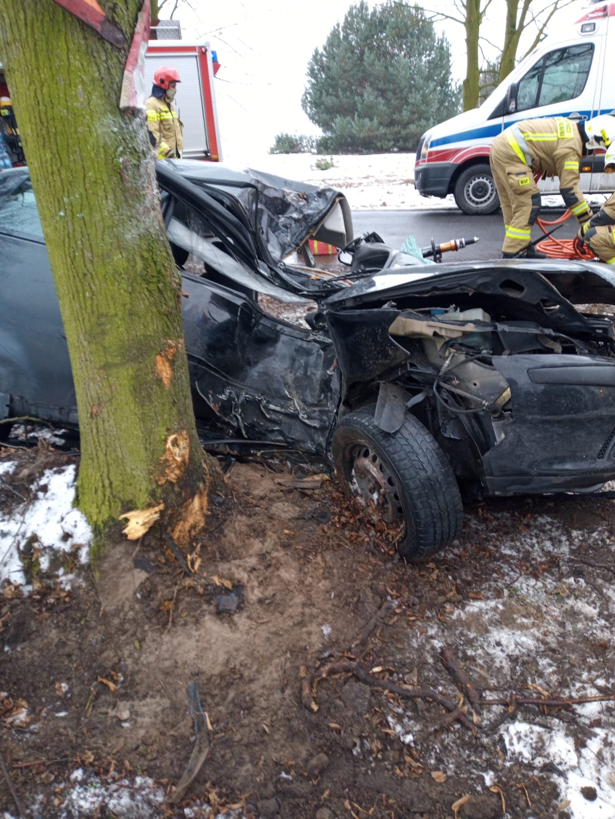Pierwszy wypadek zgłoszono do dyspozytora Stanowiska Kierowania Komendanta Powiatowego PSP w Pleszewie kilka minut przed godziną trzynastą. W okolicach miejscowości Nowy Olesiec (gm. Chocz), samochód osobowy wypadł z drogi i uderzył w drzewo. Ze zgłoszenia wynikało, że jadąca tym autem osoba została uwięziona w rozbitym pojeździe.. Na miejsce wypadku natychmiast zadysponowane zostały dwa zastępy z Jednostki Ratowniczo – Gaśniczej w Pleszewie oraz zastęp z Ochotniczej Straży Pożarnej w Choczu. Na miejsce udał się także zespół ratownictwa medycznego i policja. Strażacy zabezpieczyli teren akcji wraz z rozbitym autem. Jednocześnie rozpoczęto wykonywanie dostępu do poszkodowanej, nieprzytomnej kobiety. Za pomocą specjalistycznego sprzętu hydraulicznego usunięto drzwi pojazdu i wydobyto poszkodowaną na zewnątrz. Natychmiast udzielono jej pierwszej pomocy, a następnie przekazano ją przybyłemu na miejsce zespołowi Lotniczego Pogotowia Ratunkowego, który przetransportował poszkodowaną do szpitala.