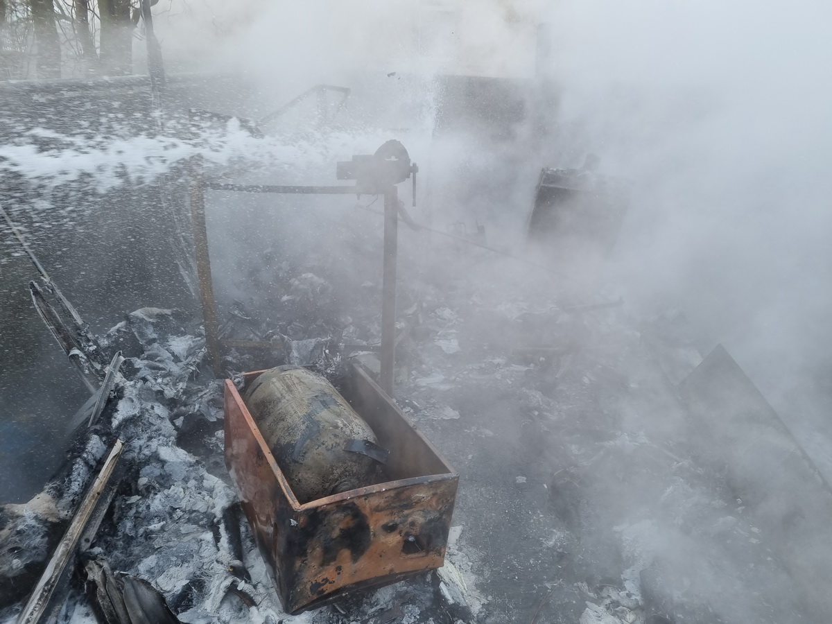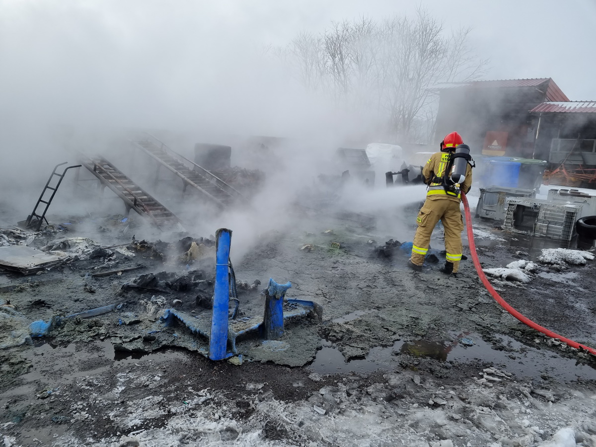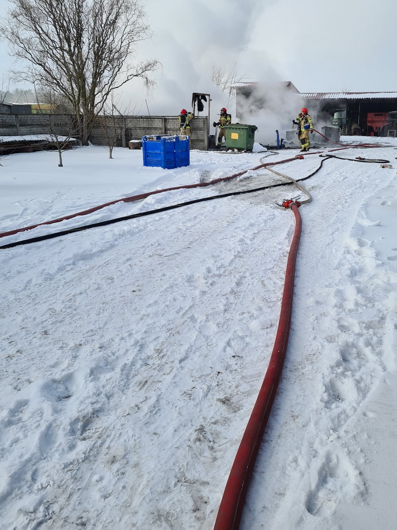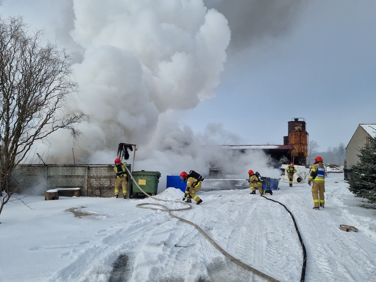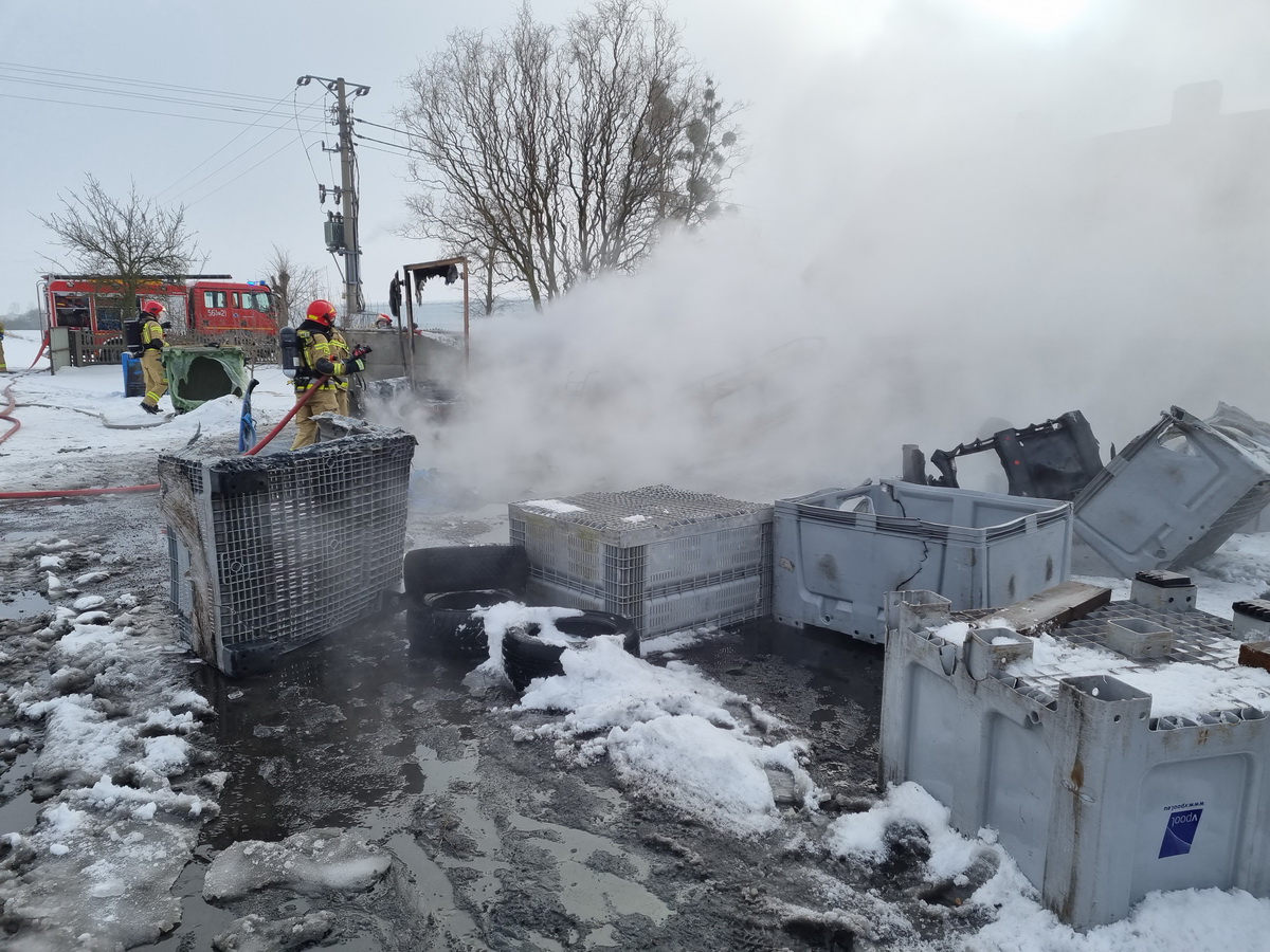 Po przybyciu pierwszych wozów bojowych, okazało się, że palą się kontenery kompozytowe i przyległe do nich skrzyniopalety. Bezpośrednio zagrożono przez ogień była również wiata pod którą stały maszyny rolnicze. Strażacy podali jeden prąd piany gaśniczej na palące się materiały i jeden prąd wody w obronie wiaty. Jednocześnie wydobyto i zabezpieczono znajdującą się w ogniu butlę z gazem. Dzięki błyskawicznie podjętym działaniom gaśniczym ogień nie zdołał się rozprzestrzenić, co niewątpliwie znacznie zwiększyłoby straty. Na zakończenie strażacy za pomocą kamery termowizyjnej dokładnie sprawdzili miejsce pożaru i sąsiednie pomieszczenia.