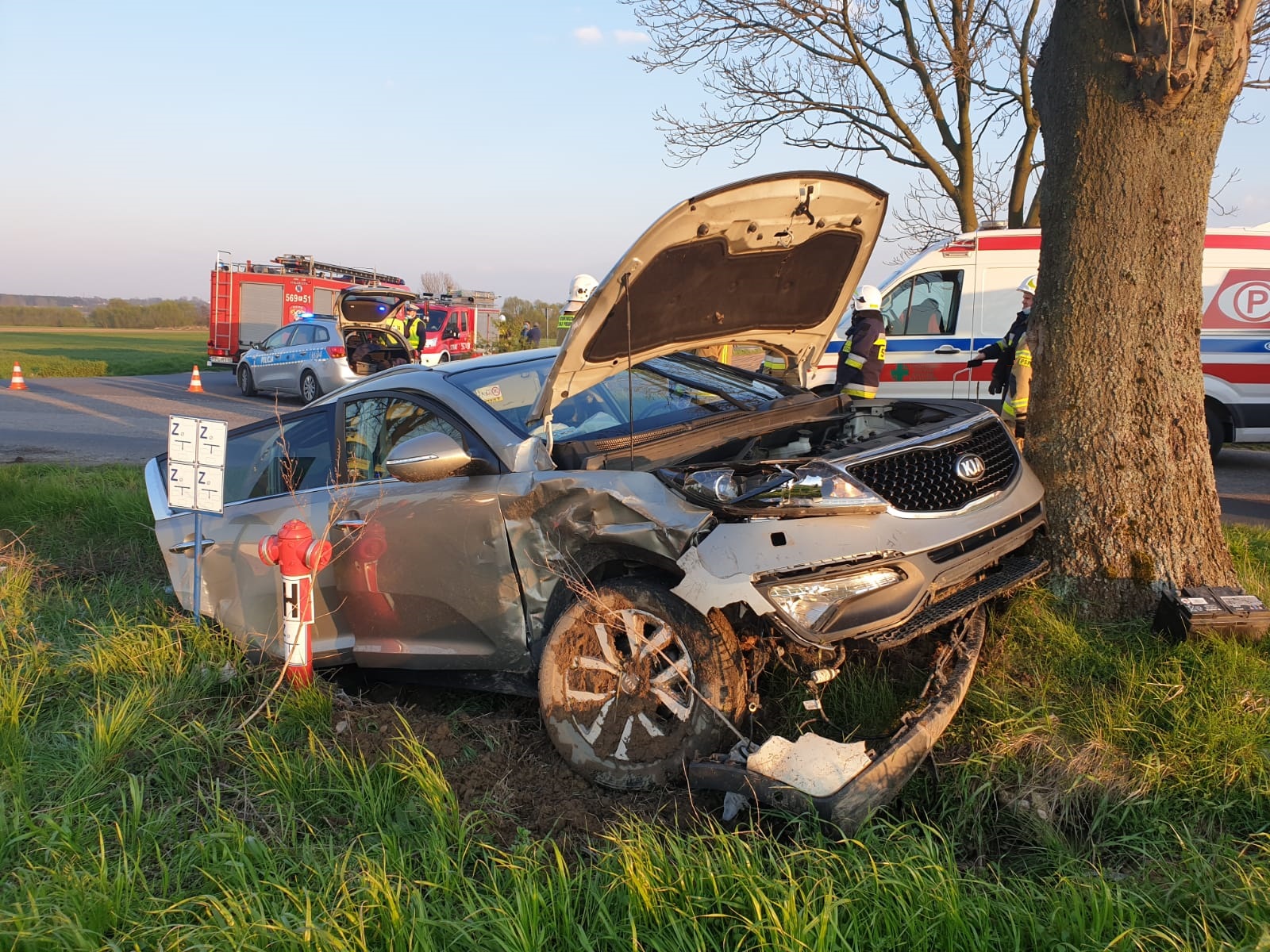 Około godziny 18:30, na skrzyżowaniu zderzyły się dwa samochody osobowe. Uderzenie było tak silne, że jedno z aut uderzyło w przydrożne drzewo, a drugie wjechało ok. 10 metrów w pole. Na pomoc poszkodowanym natychmiast wyruszyli strażacy z pleszewskiej Jednostki Ratowniczo-Gaśniczej, Ochotniczej Straży Pożarnej w Gołuchowie i Kucharach oraz zespoły ratownictwa medycznego i policja. Pierwsi na miejscu wypadku zjawili się strażacy, którzy zabezpieczyli teren działań i rozbite auta. Jednocześnie rozpoczęto udzielanie pierwszej pomocy uczestnikom wypadku, którym opatrzono liczne rany. Aby uspokoić biorące udział w wypadku dzieci, podarowano im pluszowe maskotki. Następnie poszkodowanych przekazano przybyłym na miejsce ratownikom medycznym, którzy zdecydowali o przewiezieniu czwórki z nich do szpitala.