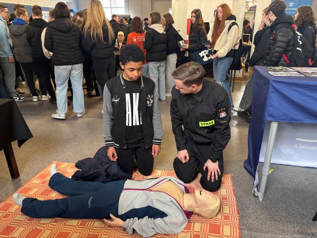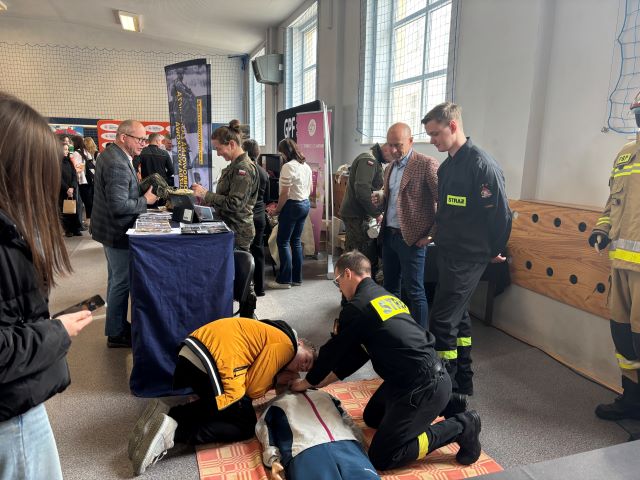 Przedstawiciele pleszewskich strażaków, na czele z Komendantem Powiatowym PSP w Pleszewie bryg. Rolandem Egiertem omawiali specyfikę pracy strażaka, procedury kwalifikacyjne oraz wymogi, jakie należy spełnić, aby zostać strażakiem. Przy tej okazji odwiedzający strażackie stoisko mogli także poznać zasady właściwego reagowania i zachowania się w sytuacjach zagrożenia i podstawy udzielania pierwszej pomocy.