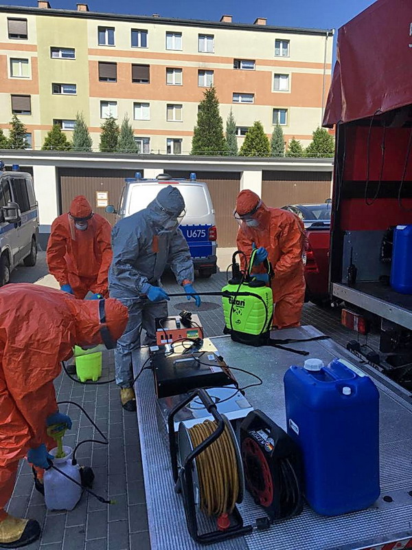 Na prośbę sanepidu zastęp medyczny pleszewskich strażaków, który od początku pandemii włączył się do działań wspierających służbę zdrowia, pobrał przy tej okazji od policjantów i strażacką karetką przetransportował do analizy próbki konieczne do przeprowadzenia testów na obecność wirusa SARS-CoV-2. Celem tych działań było zwiększenie bezpieczeństwa funkcjonariuszy policji i pracowników Komendy oraz zmniejszenie ryzyka przenoszenia się wirusa. Pomieszczenia zostały dokładnie zdezynfekowane metodą opryskową, a także poprzez ozonowanie. Ozonowanie pomieszczeń to skuteczna metoda dezynfekcji dzięki silnym właściwościom biobójczych i utleniających ozonu. To bardzo dobry sposób usuwania wirusów i bakterii, który nie wymaga użycia środków bakteriobójczych. Ponadto ozon nie pozostawia po sobie toksycznych produktów rozpadu, ponieważ samoczynnie rozpada się do tlenu, co sprawia, że jest ekologiczny i przyjazny środowisku.