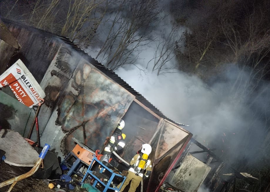 Po przybyciu pierwszych wozów bojowych, okazało się, że w płoną drewniane budynki gospodarcze i garaż, w którym znajduje się samochód osobowy. Strażacy niezwłocznie podali dwa prądy wody objęte pożarem obiekty. Jednocześnie, aby nie dopuścić do rozprzestrzenienia się ognia, podano kolejny prąd wody w obronie bezpośrednio zagrożonego lasu sosnowego. Po opanowaniu ognia rozebrano elementy zniszczonych budynków i dokładnie je dogaszono. Niestety, zarówno auta, jak i znajdującego się w pomieszczeniach wyposażenia nie udało się ocalić.