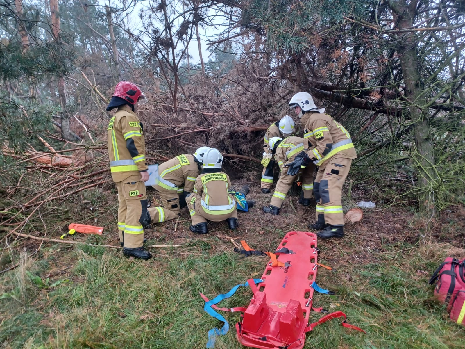 Drugie ćwiczenie zostało przeprowadzone w miejscowości Józefów, gdzie strażacy musieli udzielić pomocy trzem osobom. Podczas silnego wiatru na jedną z dwóch osób przebywających w lesie przewróciło się drzewo przygniatając ją. Druga z tych osób nie mogąc wyciągnąć poszkodowanego postanowiła pobiec po pomoc. Przebiegając przez drogę wpadła pod jadący samochód i została potrącona. Kierujący pojazdem chcąc uniknąć zderzenia przewrócił samochód na bok i stracił przytomność.