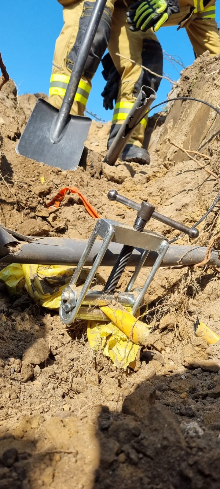 Informację o pierwszym zdarzeniu - uszkodzeniu gazociągu na ulicy Bolesława Chrobrego w Kowalewie dyspozytor pleszewskiego Stanowiska Kierowania Komendanta Powiatowego PSP otrzymał kilka minut przed godziną jedenastą. Na miejsce natychmiast zadysponowano cztery zastępy straży pożarnej, do akcji dołączyło też pogotowie gazowe i policja. Okazało się, że uszkodzona zastała linia gazociągu średniego ciśnienia. Na szczęście nie doszło do zapalenia się, ani też wybuchu gazu. Strażacy natychmiast rozpoczęli zabezpieczanie uszkodzenia. Jednocześnie, ze względów bezpieczeństwa, ewakuowano 7 osób z bloku mieszkalnego i 394 osoby ze szkoły podstawowej - budynków znajdujących się w strefie bezpośredniego zagrożenia oraz zamknięto cały obszar. Na szczęście strażakom bardzo szybko udało się zacisnąć uszkodzony gazociąg i powstrzymać emisję gazu, jednak teren działań zabezpieczany był aż do całkowitego usunięcia awarii. W trwających prawie dwie godziny działaniach wzięło udział 15 strażaków z pleszewskiej Jednostki Ratowniczo – Gaśniczej oraz Ochotniczej Straży Pożarnej z Kowalewa.