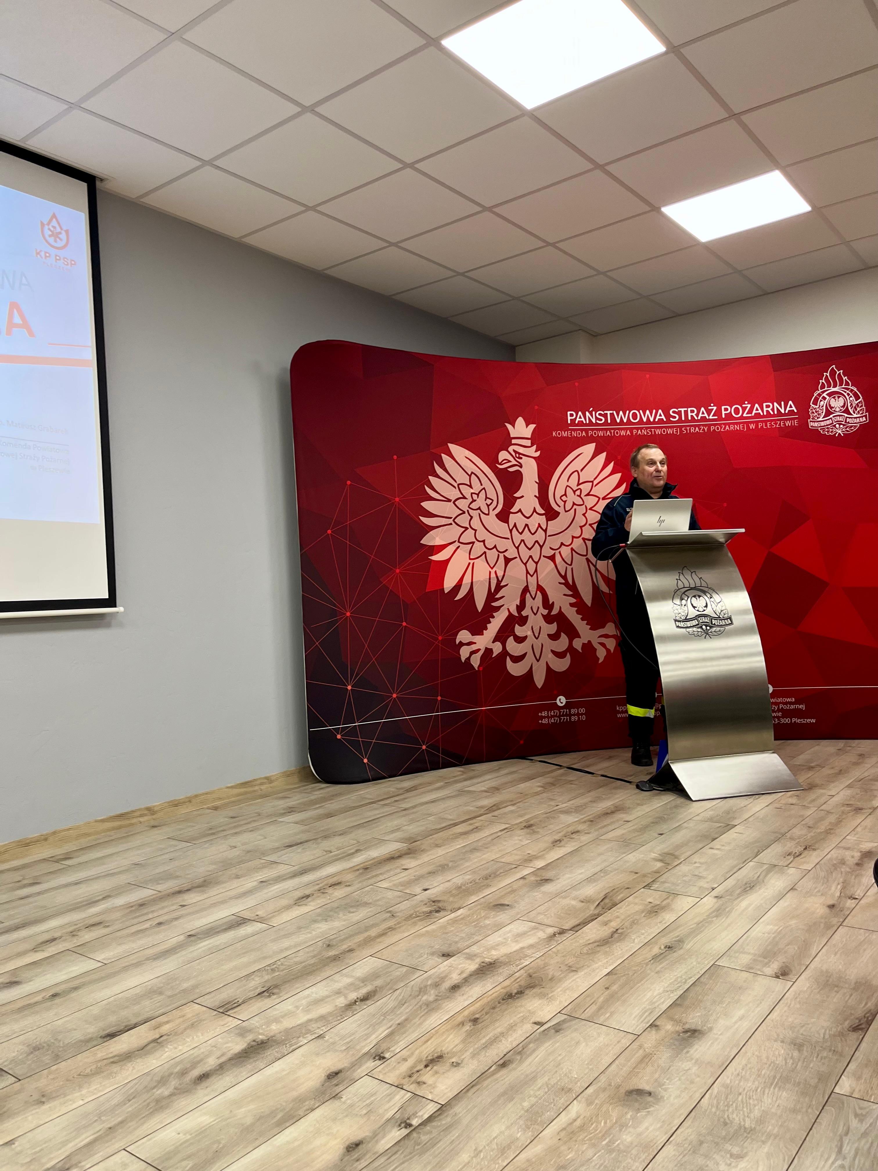 Następnie mł. asp. Mateusz Grabarek przedstawił podsumowanie działalności operacyjnej i szkoleniowej w 2025 roku. W trakcie wystąpienia omówiono wyjazdowość jednostek, przeprowadzone szkolenia i ćwiczenia, a także charakterystyczne zdarzenia odnotowane na terenie powiatu pleszewskiego.