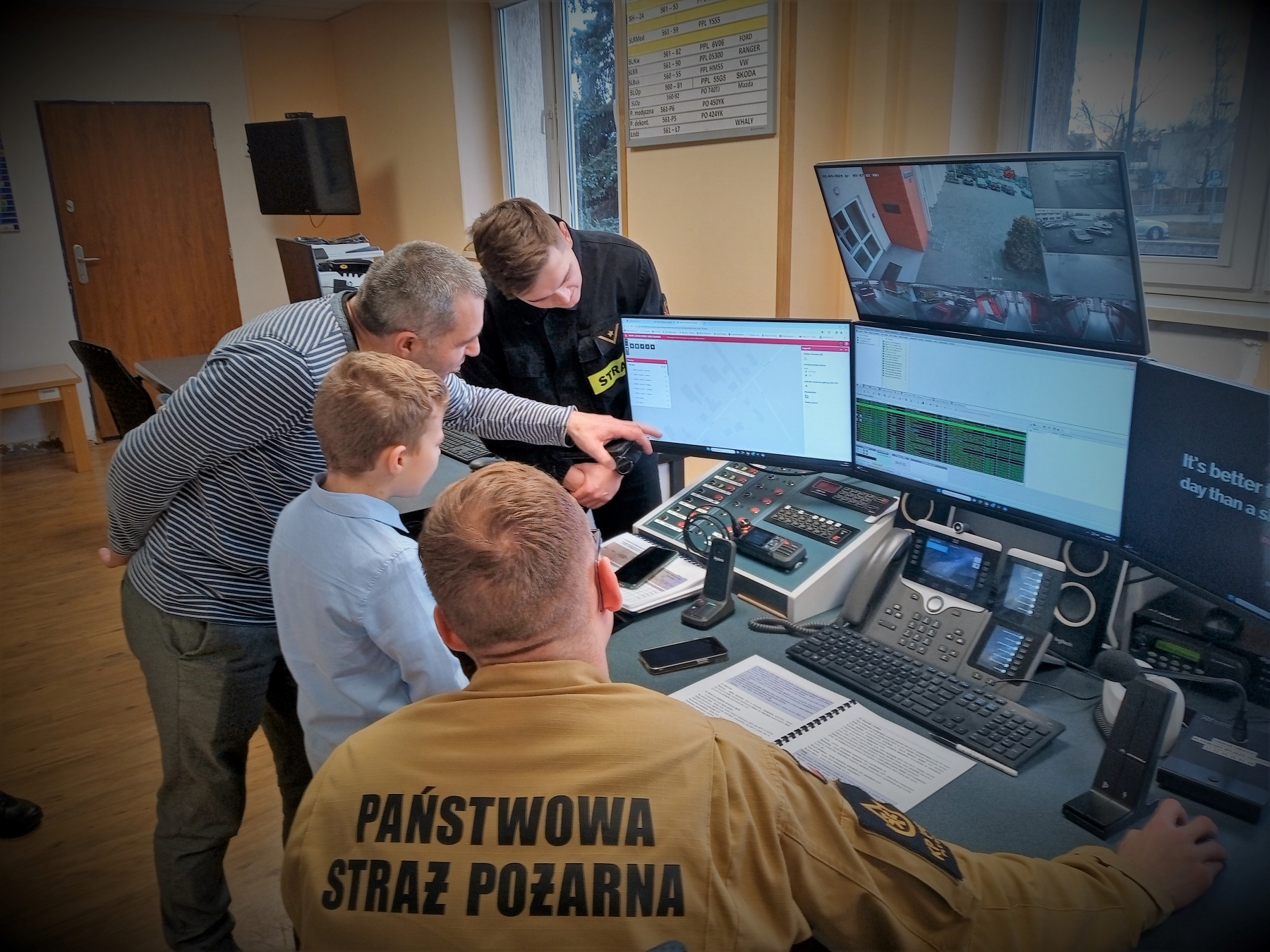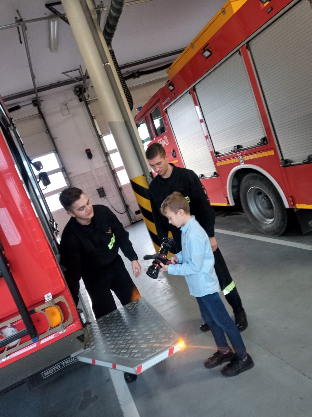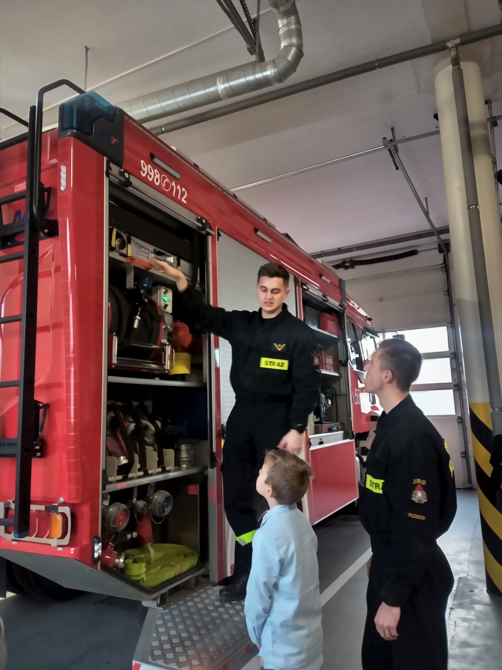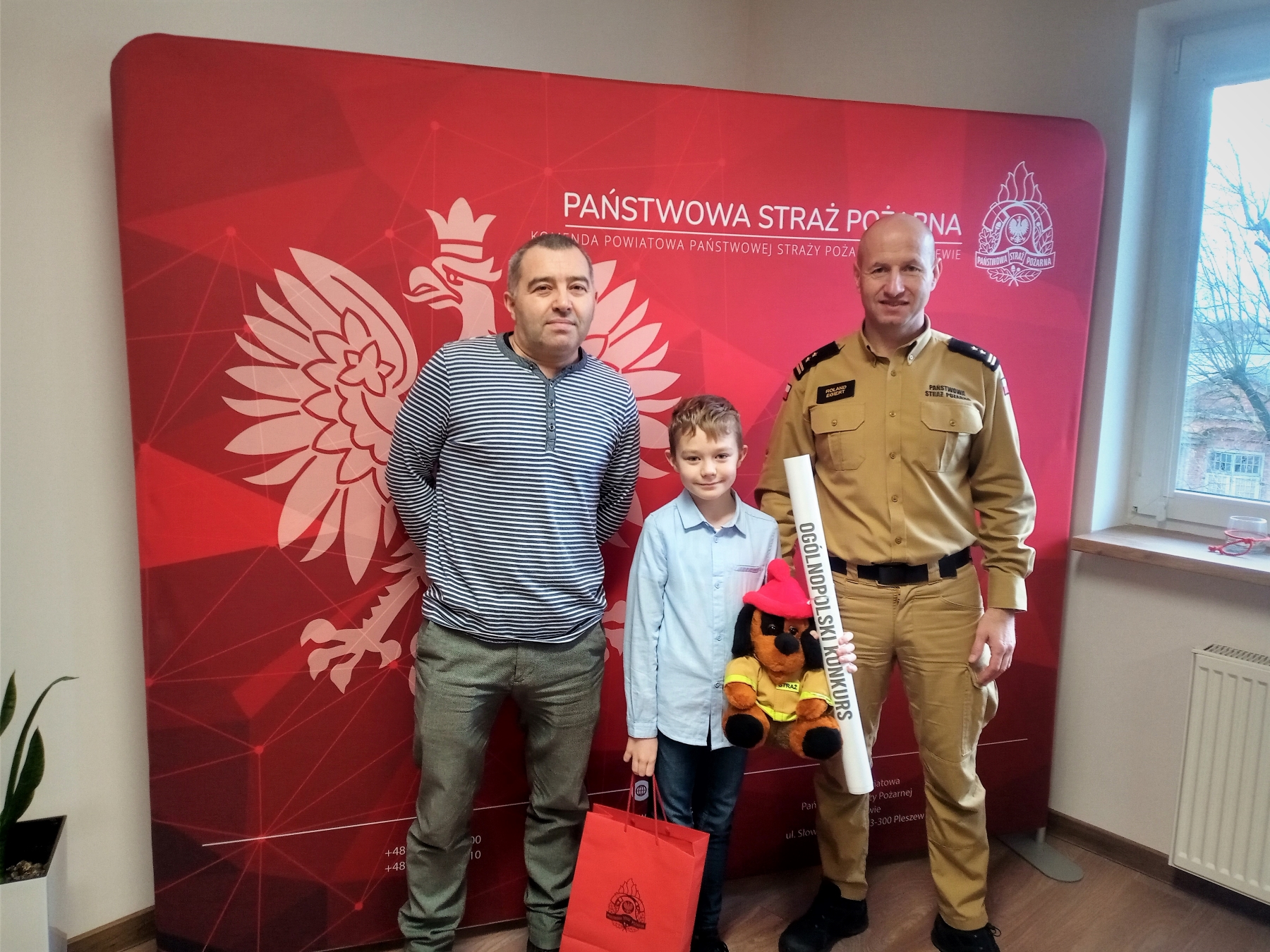 Skierowany do mieszkańców miasta i gminy Pleszew konkurs polegał na przygotowaniu i wrzuceniu do specjalnie przygotowanej skrzynki życzeń świątecznych skierowanych do swoich sąsiadów. Wśród ponad setki przygotowanych kartek znalazły się również życzenia dla pleszewskich strażaków. Przygotował ja właśnie Kamil Sikora, który w zamian, wraz z tatą, został zaproszony do pleszewskiej komendy Państwowej Straży Pożarnej. Naszego gościa przyjął Komendant Powiatowy PSP w Pleszewie bryg. Roland Egiert, który zaprosił chłopca do zajęcia na chwilę swojego miejsca. Kamil miał również okazję zwiedzić całą komendę oraz jednostkę ratowniczo – gaśniczą, gdzie strażacy pokazali i opowiedzieli o sprzęcie służącym do działań ratowniczych i gaśniczych. Spore zainteresowanie wzbudziło również Stanowisko Kierowania Komendanta Powiatowego PSP i pełniona tam służba. Na pamiątkę tego przemiłego spotkania chłopiec został obdarowany pluszowym misiem i strażackimi gadżetami.