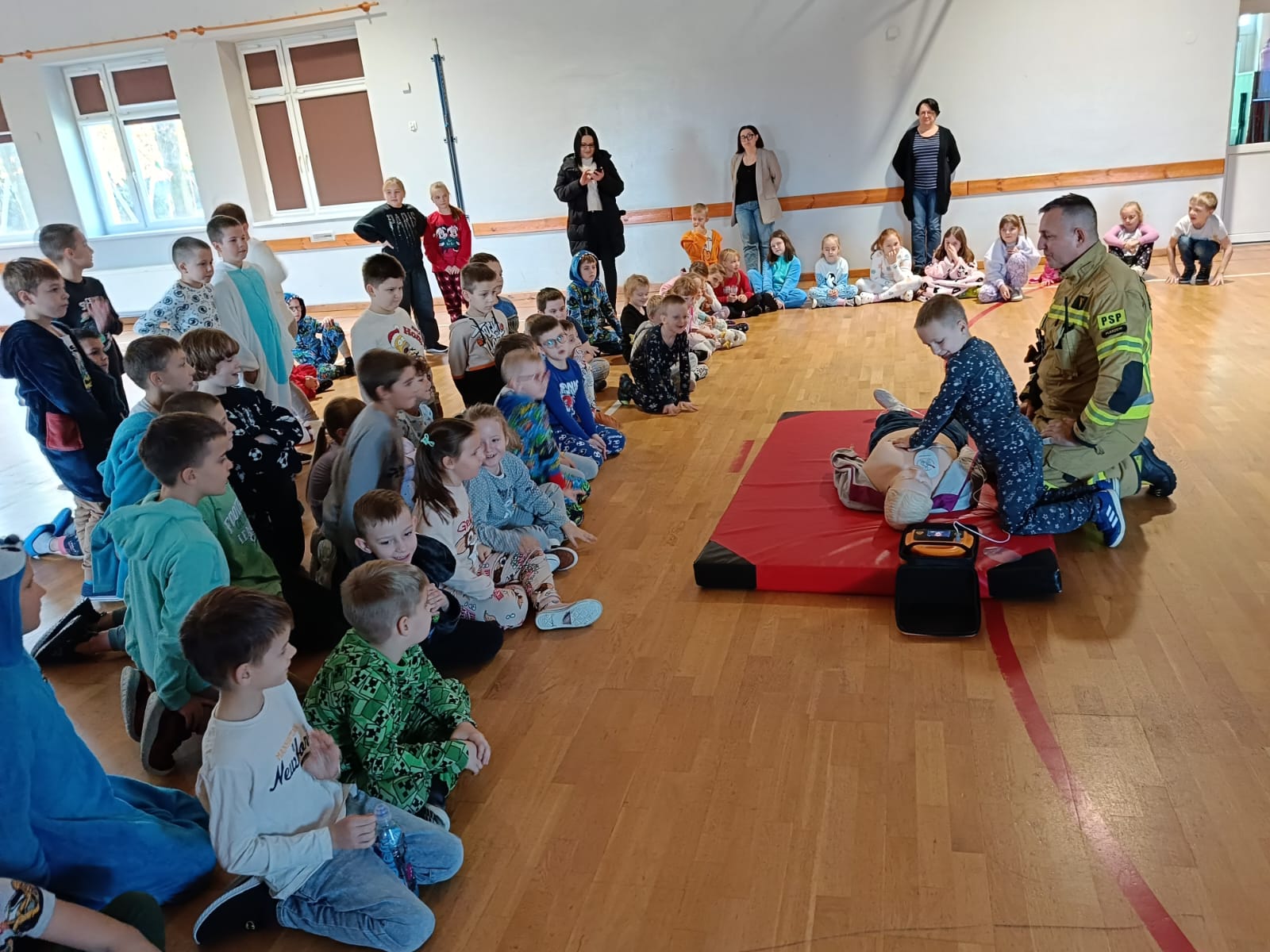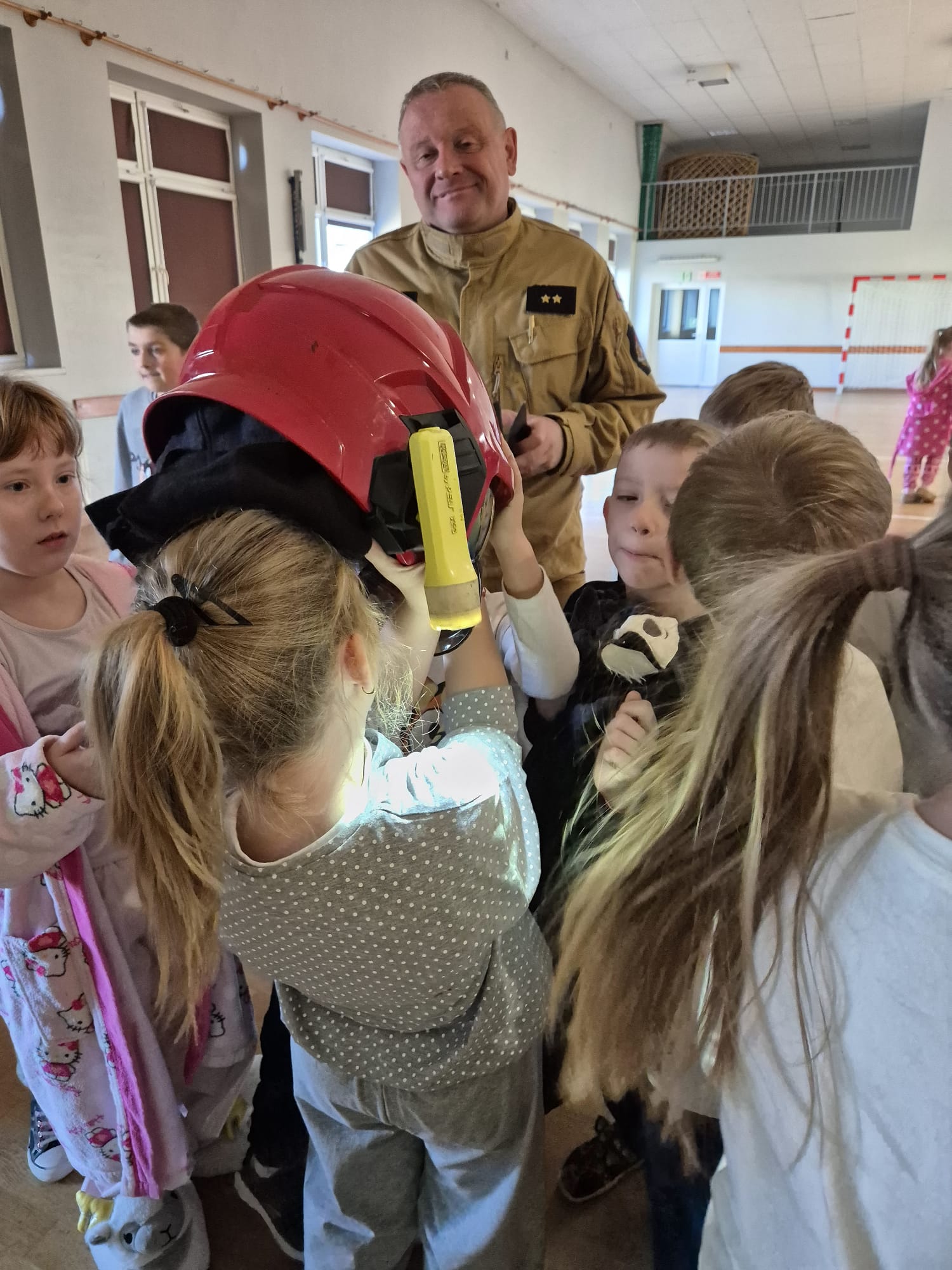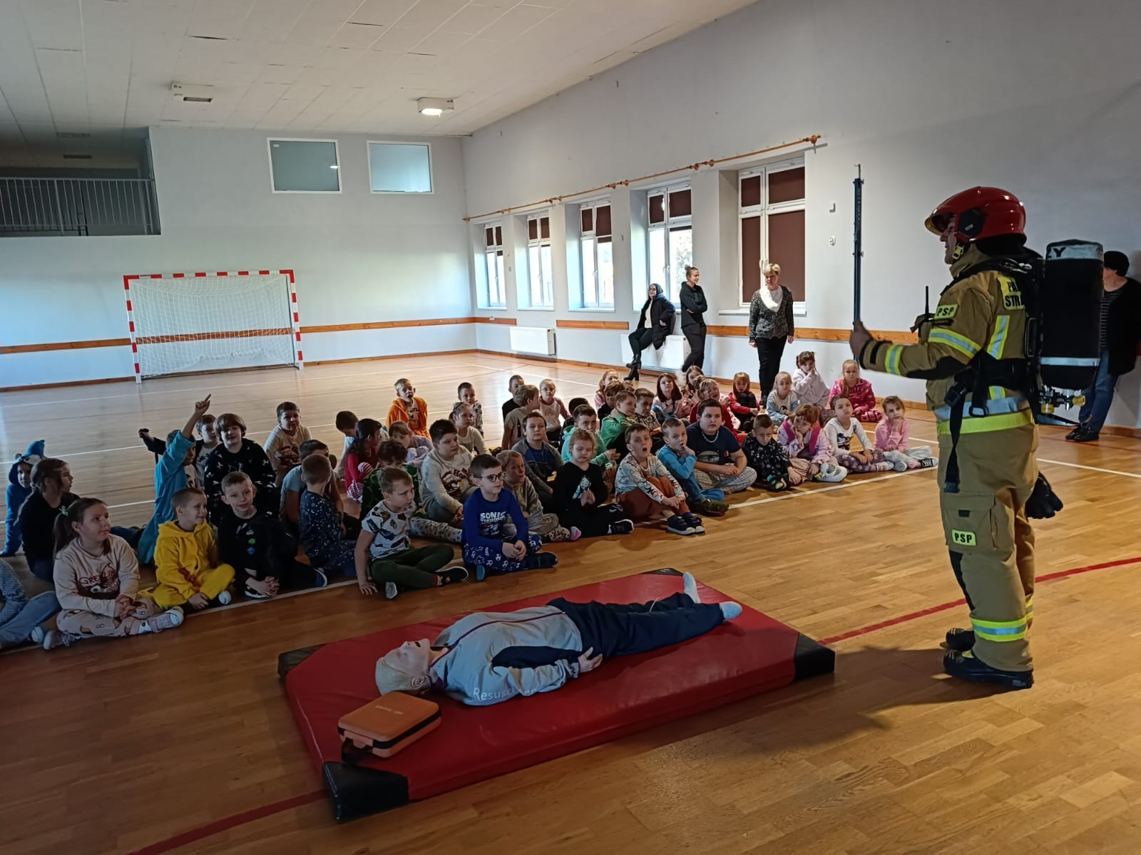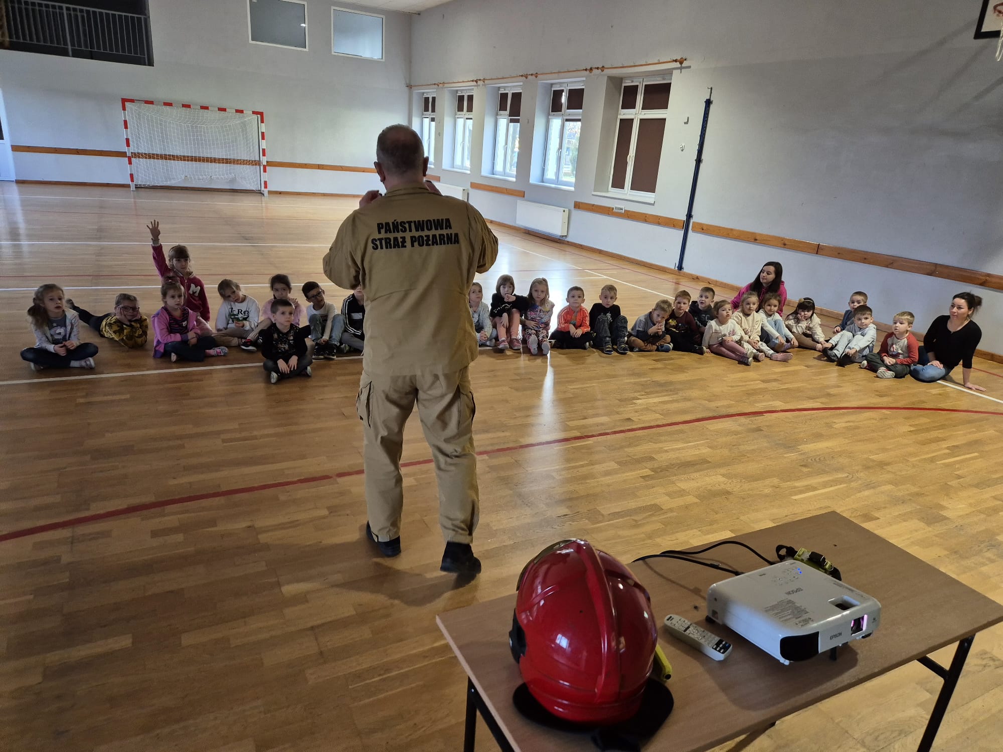 Strażacy uświadomili dzieciom jak zachowywać się w sytuacjach różnych zagrożeń, w tym związanych z okresem grzewczym oraz jak powiadomić służby ratownicze i udzielać pierwszej pomocy. Przedszkolaki i uczniowie bardzo aktywnie i żywiołowo uczestniczyli w spotkaniu, podczas którego mogły poznać specyfikę pracy strażaków, umundurowanie strażackie oraz niektóre sprzęty jakimi strażacy dysponują. Dzieci dowiedziały się, że strażacy nie tylko gaszą pożary, ale również są wzywani do wypadków samochodowych, do zalanych domów, powalonych drzew, a także ratują zwierzęta.