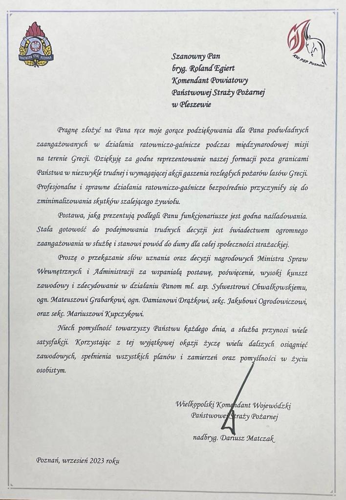 Na ręce Komendanta Powiatowego Państwowej Straży Pożarnej w Pleszewie bryg. Rolanda Egierta wpłynął również List Gratulacyjny od Wielkopolskiego Komendanta Wojewódzkiego Państwowej Straży Pożarnej nadbryg. Dariusza Matczaka, który podczas spotkania został uroczyście odczytany.