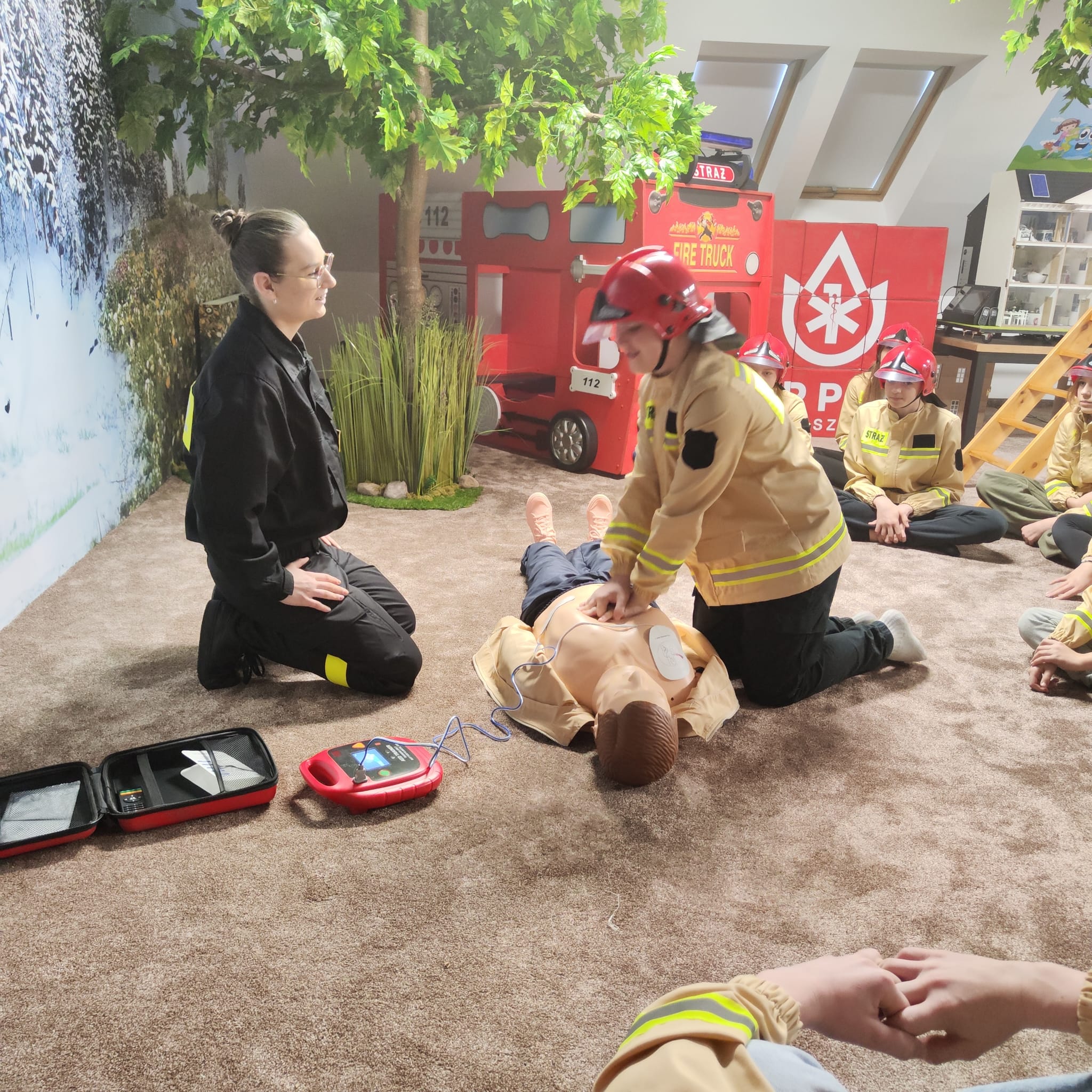 - Zasady pierwszej pomocy z użyciem treningowego fantomu i defibrylatora automatycznego.