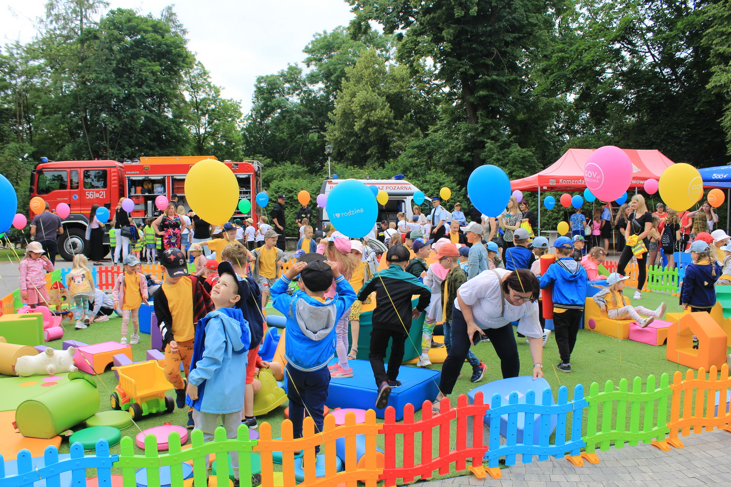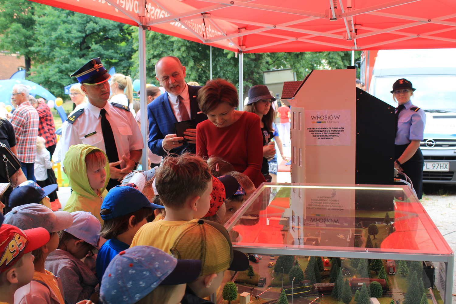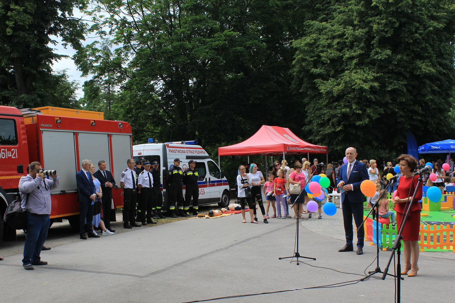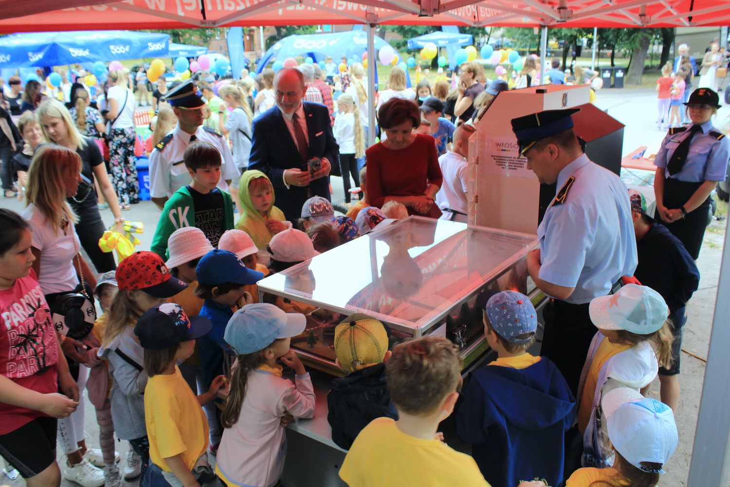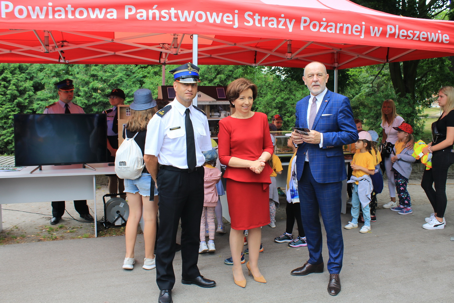 Trasa ta, rozpoczęła się w Pleszewie, który został laureatem tego konkursu w kategorii gmin miejsko-wiejskich. Tego dnia Pani Minister zaprosiła dzieci i rodziców do pleszewskiego parku miejskiego na piknik rodzinny, podczas którego dzieci mogły bawić się w „Miasteczku Rodzina 500+”. Obok wielu przygotowanych tego dnia atrakcji na dzieci czekały również stoiska przygotowane przez Komendę Powiatową Państwowej Straży Pożarnej w Pleszewie. Najmłodsi mogli poznać tam zasady właściwego reagowania i zachowania się w sytuacjach zagrożenia, zobaczyć sprzęt, którego na co dzień używają strażacy, wziąć udział a „akcji gaśniczej”, czy poznać podstawy udzielania pierwszej pomocy. Miejscem, które wzbudziło najwięcej zainteresowania i emocji było stoisko z mobilnym symulatorem zagrożeń jakie możemy spotkać w naszych domach wraz z modułem „jezioro – las”, gdzie z kolei dzieci mogły poznać niebezpieczeństwa jakie czyhają na nie podczas wakacji. Nasze stoiska odwiedzili również specjalni goście tego pikniku – Pani Minister Marlena Maląg oraz Pan Poseł na Sejm RP Pan Jan Mosiński, którzy nie kryli wrażenia jakie wywarł na nich nasz symulator oraz praca edukacyjna i profilaktyczna, którą realizują strażacy pleszewskiej Komendy, a o której opowiedział im Komendant Powiatowy PSP w Pleszewie mł. bryg. Roland Egiert.
