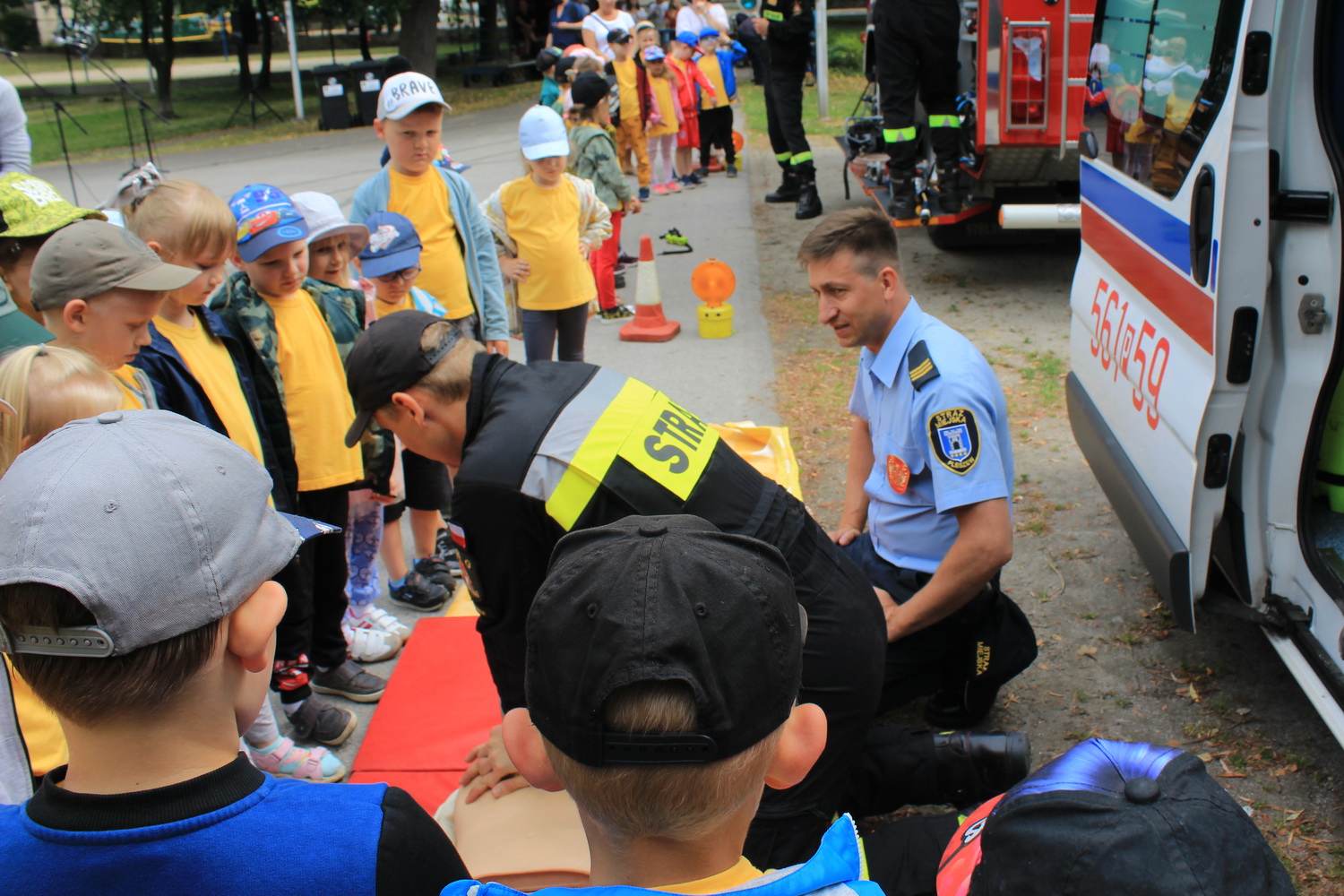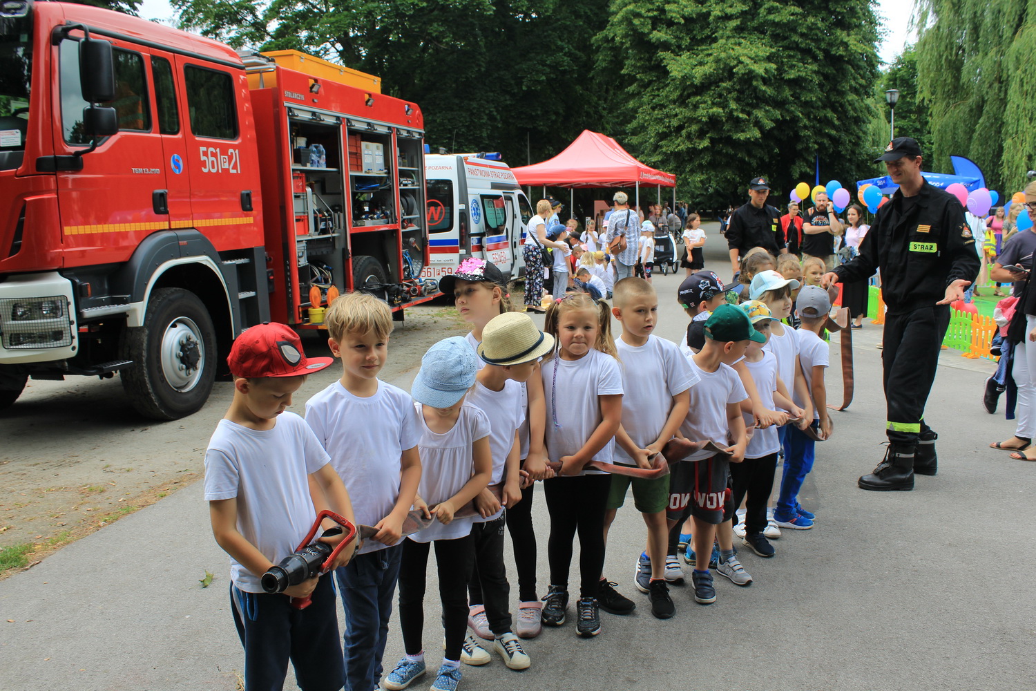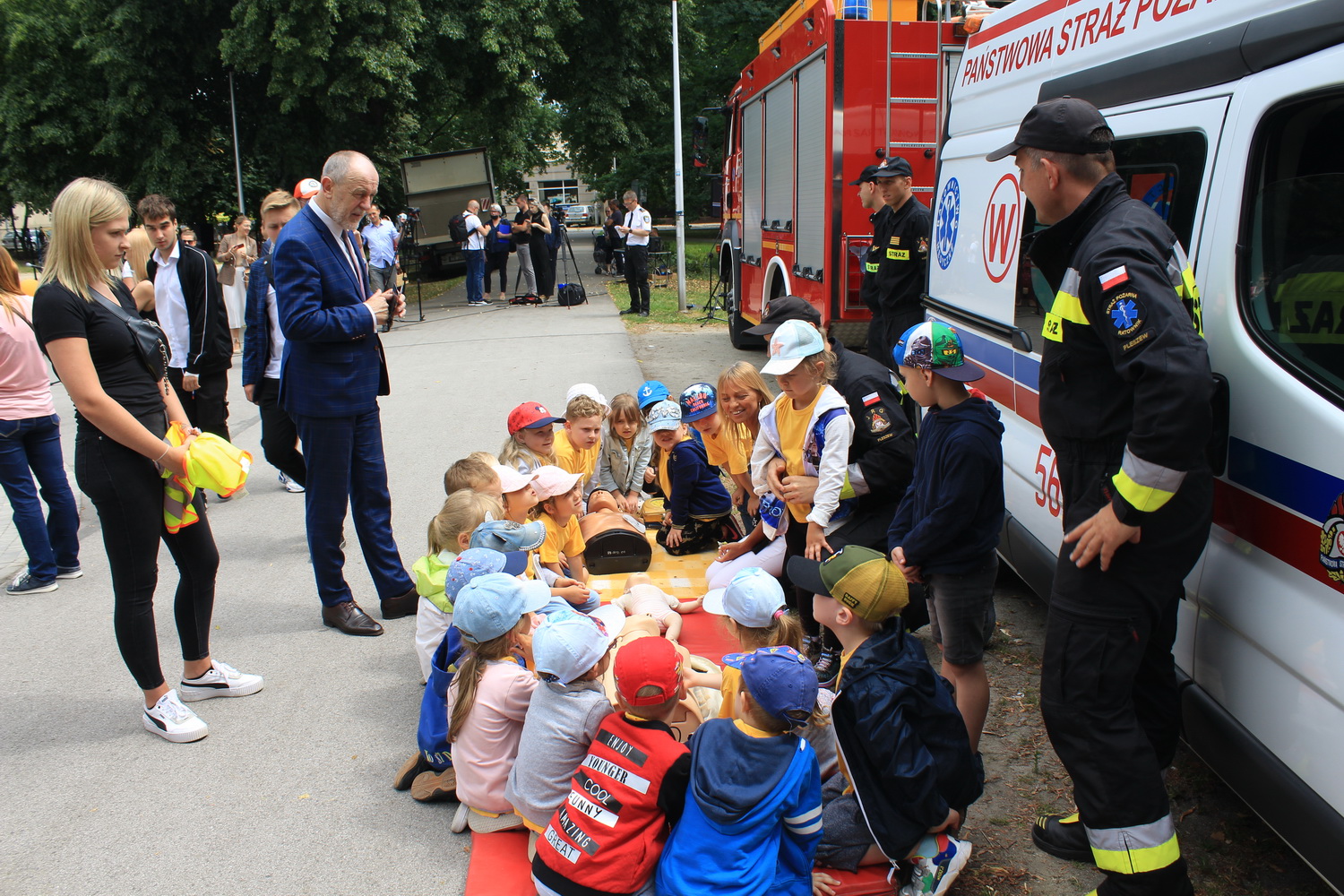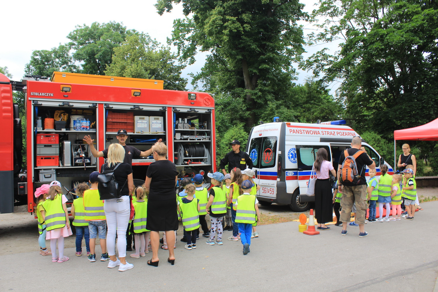 Trasa ta, rozpoczęła się w Pleszewie, który został laureatem tego konkursu w kategorii gmin miejsko-wiejskich. Tego dnia Pani Minister zaprosiła dzieci i rodziców do pleszewskiego parku miejskiego na piknik rodzinny, podczas którego dzieci mogły bawić się w „Miasteczku Rodzina 500+”. Obok wielu przygotowanych tego dnia atrakcji na dzieci czekały również stoiska przygotowane przez Komendę Powiatową Państwowej Straży Pożarnej w Pleszewie. Najmłodsi mogli poznać tam zasady właściwego reagowania i zachowania się w sytuacjach zagrożenia, zobaczyć sprzęt, którego na co dzień używają strażacy, wziąć udział a „akcji gaśniczej”, czy poznać podstawy udzielania pierwszej pomocy. Miejscem, które wzbudziło najwięcej zainteresowania i emocji było stoisko z mobilnym symulatorem zagrożeń jakie możemy spotkać w naszych domach wraz z modułem „jezioro – las”, gdzie z kolei dzieci mogły poznać niebezpieczeństwa jakie czyhają na nie podczas wakacji. Nasze stoiska odwiedzili również specjalni goście tego pikniku – Pani Minister Marlena Maląg oraz Pan Poseł na Sejm RP Pan Jan Mosiński, którzy nie kryli wrażenia jakie wywarł na nich nasz symulator oraz praca edukacyjna i profilaktyczna, którą realizują strażacy pleszewskiej Komendy, a o której opowiedział im Komendant Powiatowy PSP w Pleszewie mł. bryg. Roland Egiert.