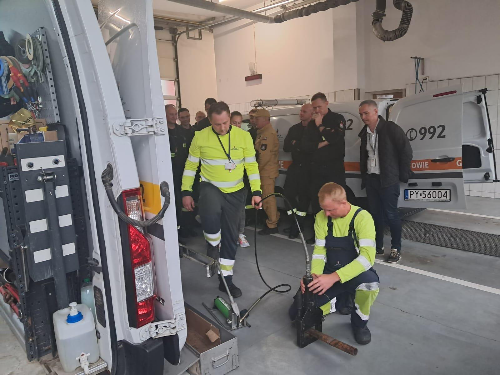 Podczas części praktycznej spotkania pleszewscy strażacy mogli zapoznać się ze sprzętem używanym przez pracowników pogotowia gazowego.