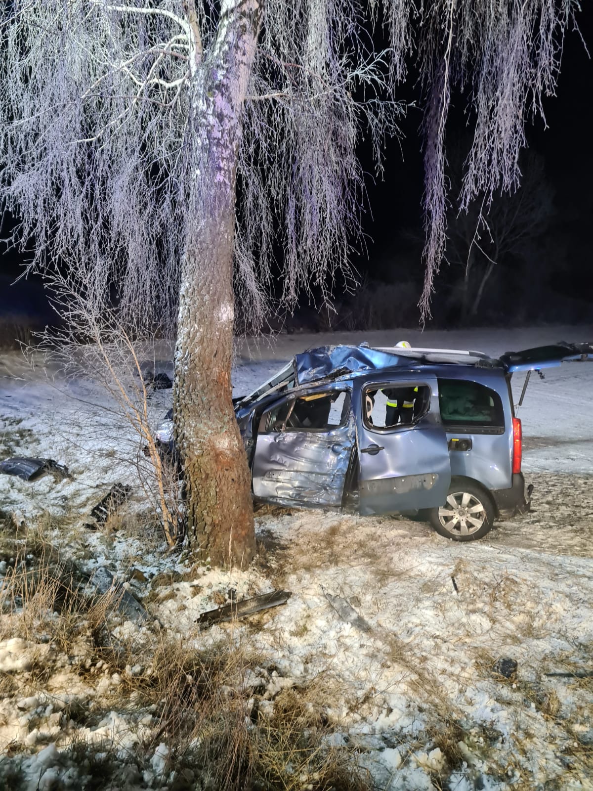 Kolejny wypadek miał miejsce kilka minut przed godziną dwudziestą trzecią w miejscowości Karmin (gm. Dobrzyca). Podobnie jak poprzednio samochód osobowy uderzył w przydrożne drzewo. Tym razem jednak w wyniku wypadku poszkodowane zostały cztery młode osoby. Strażacy zabezpieczyli teren działań i natychmiast rozpoczęli udzielanie im pomocy medycznej opatrując rany oraz zabezpieczając przed utratą ciepła. Następnie poszkodowanych przekazano przybyłym na miejsce ratownikom medycznym, którzy zdecydowali o przewiozły ich do szpitala.