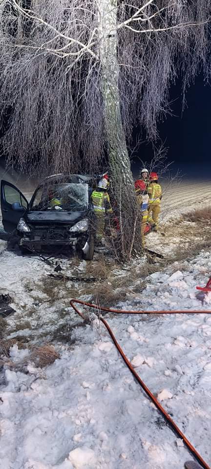 Pierwszy wypadek zgłoszono do dyspozytora Stanowiska Kierowania Komendanta Powiatowego PSP w Pleszewie kilka minut po godzinie czternastej. W okolicach miejscowości Orlina Mała osobowy mercedes wypadł z drogi i uderzył w drzewo. Na miejsce wypadku natychmiast zadysponowane zostały zastępy z Jednostki Ratowniczo – Gaśniczej w Pleszewie oraz zastęp z Ochotniczych Straży Pożarnych w Białobłotach i Gizałkach. Na miejsce udał się także zespół ratownictwa medycznego i policja. Strażacy zabezpieczyli teren akcji wraz z rozbitym autem. Na szczęście jadąca autem osoba nie odniosła poważniejszych obrażeń.