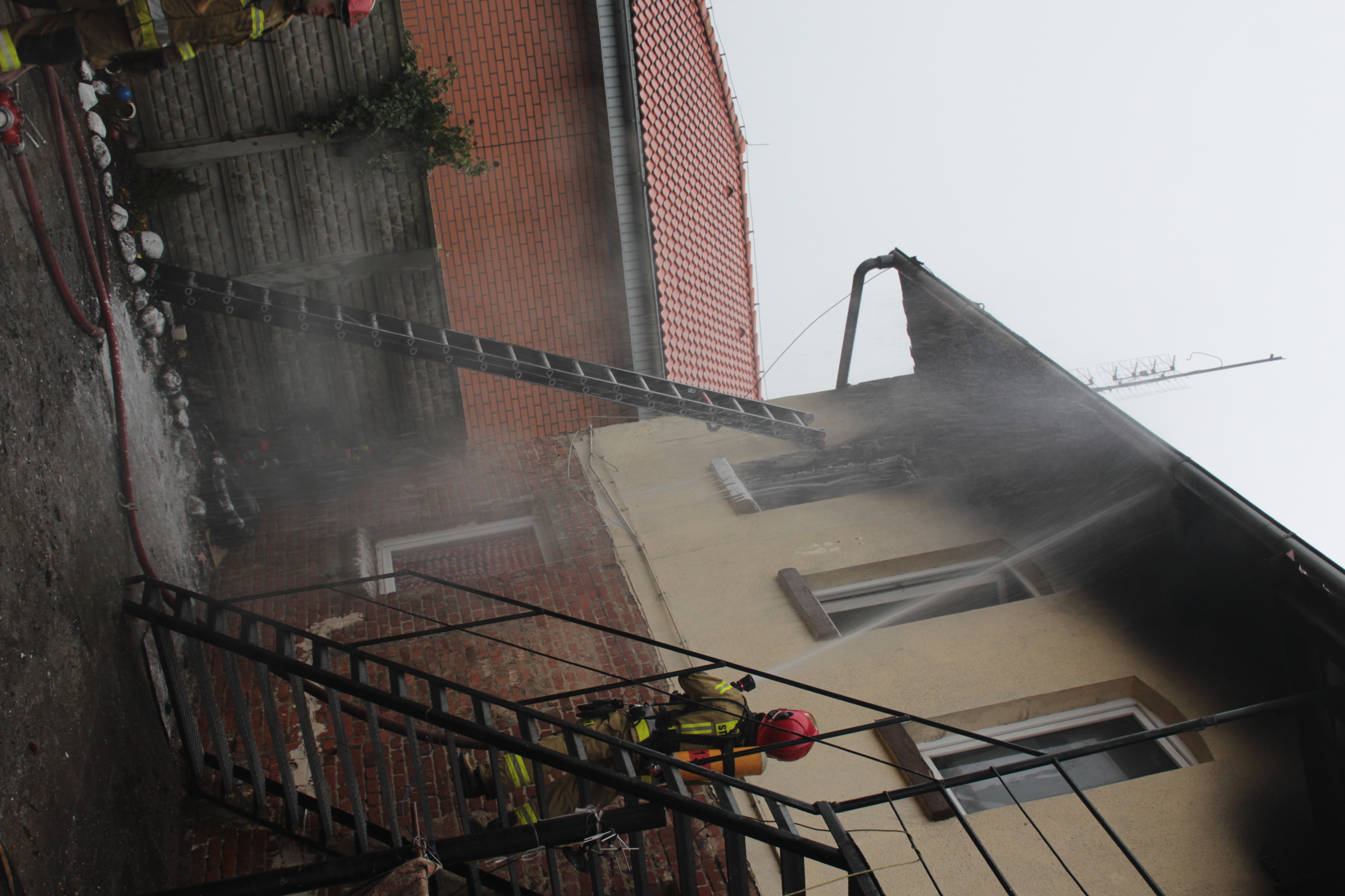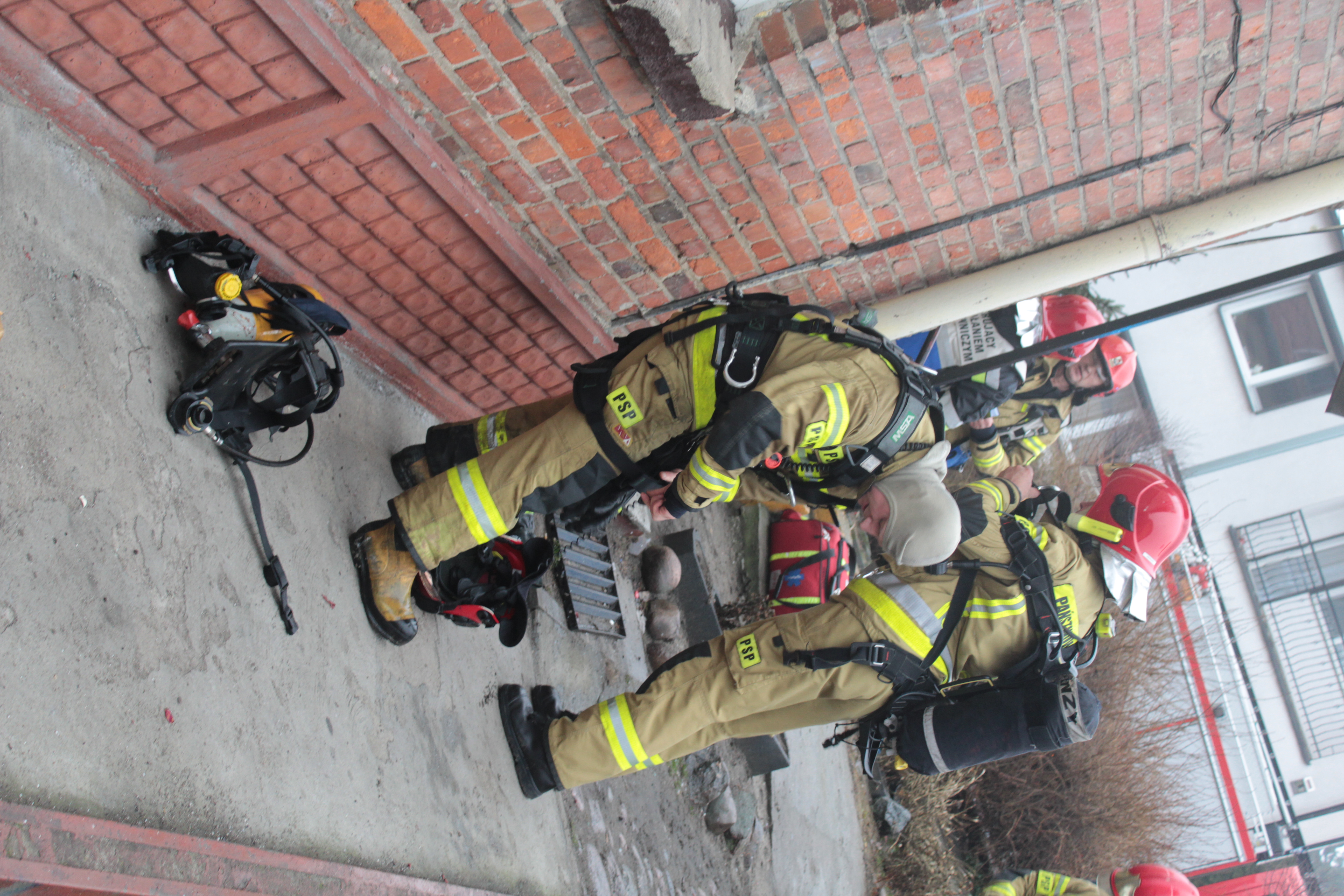 w obronie na pozostałą część budynku. Jednocześnie zabezpieczeni aparatami dróg oddechowych strażacy weszli do mieszkania i uratowali znajdujące się tam zwierzęta. Równolegle z działaniami gaśniczymi prowadzono przeszukanie wszystkich pomieszczeń domu aby upewnić się że pożar nie rozprzestrzenił się do wnętrza budynku . W celu całkowitego dogaszenia pożaru i upewnieniu się, że nie ma już ukrytych zarzewi ognia konieczna była rozbiórka nadpalonej elementów oraz wyniesienie