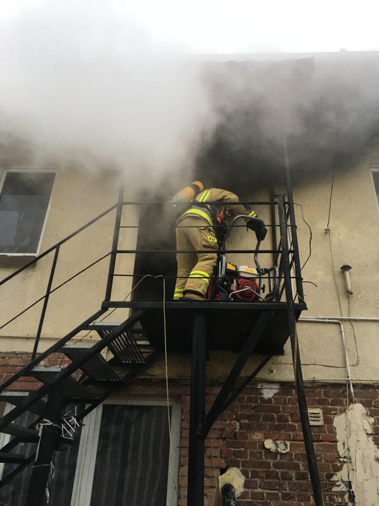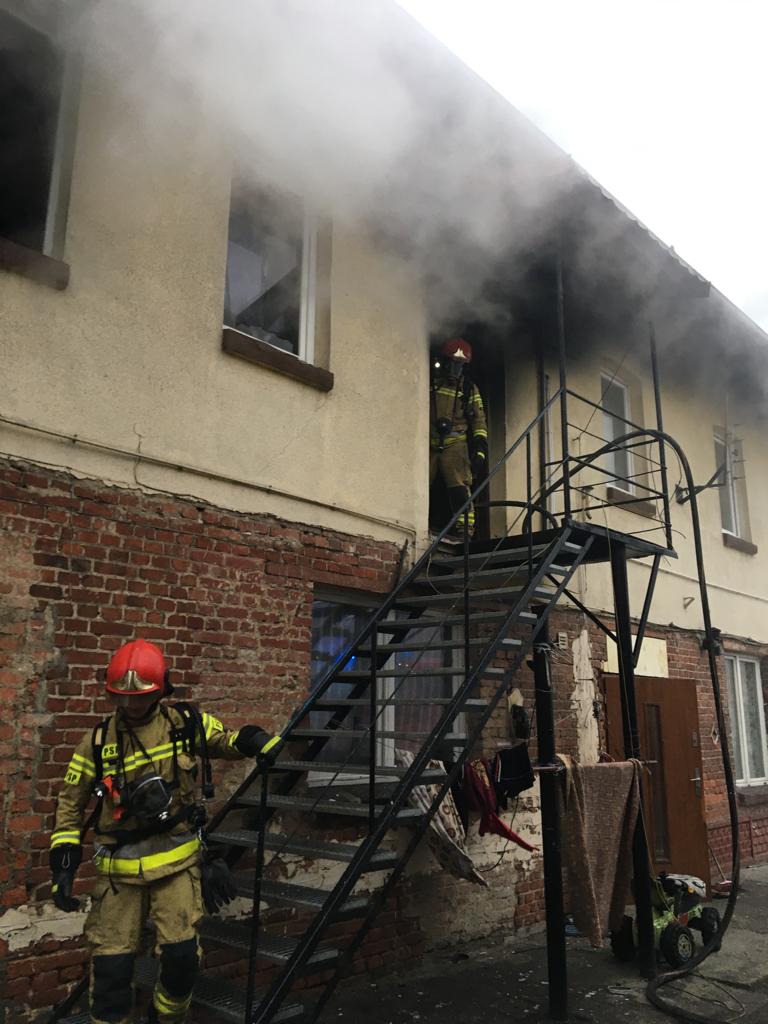 POŻAR BUDYNKU WIELORODZINNEGO W PLESZEWIE