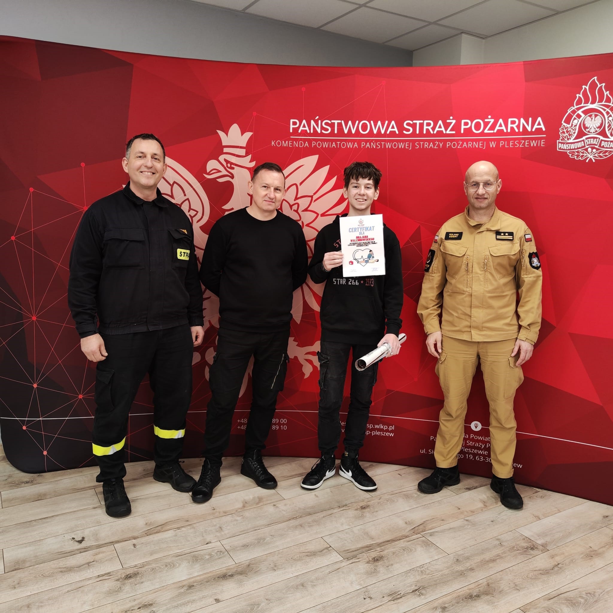 20 lutego 2024 r. Komendę Powiatową Państwowej Straży Pożarnej w Pleszewie odwiedził Brajan Walendowski ze swoim tatą Piotrem. Brajan to młody fascynat straży pożarnej, który wylicytował voucher podczas finału Wielkiej Orkiestry Świątecznej Pomocy.