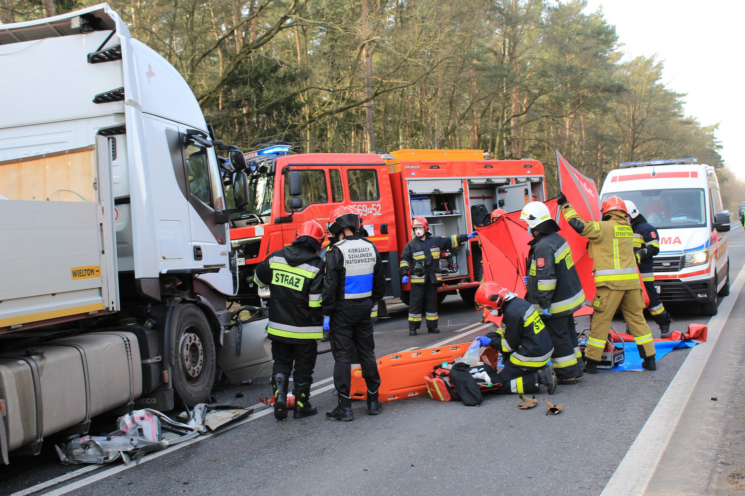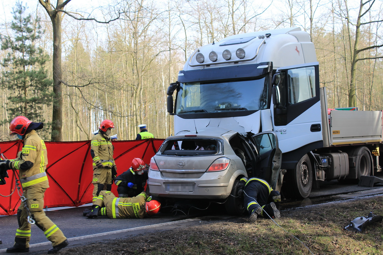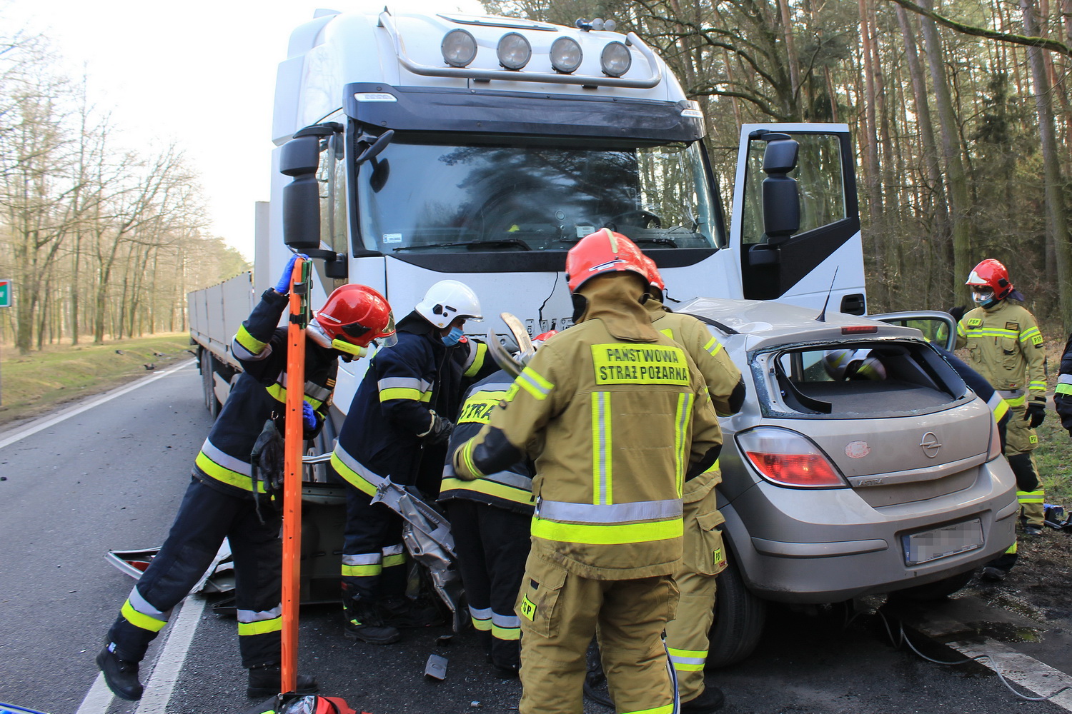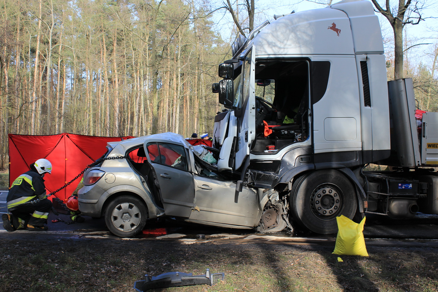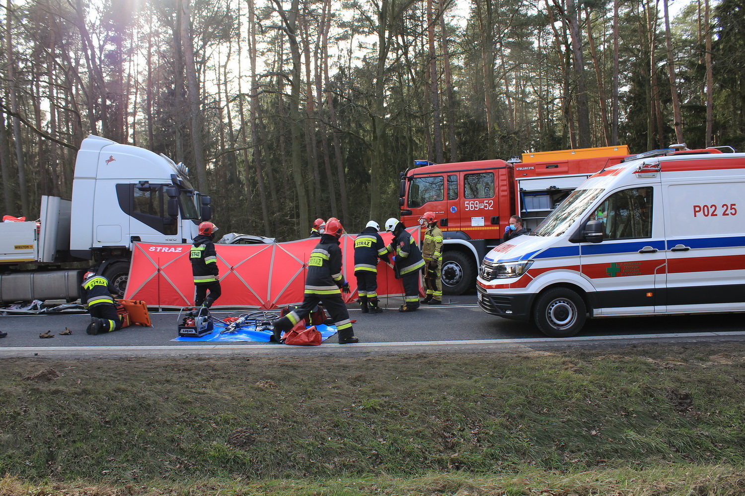 Na miejsce wypadku wyruszyły dwa zastępy strażaków z pleszewskiej Jednostki Ratowniczo – Gaśniczej PSP, zastęp Ochotniczej Straży Pożarnej z Gołuchowa oraz zespół ratownictwa medycznego i policja. Kiedy strażacy dotarli na miejsce wypadku okazało się, że w rozbitym oplu wciąż znajduje się jedna osoba. Jednak jej stan nie budził wątpliwości – osoba ta zginęła na miejscu. Przybyły na miejsce lekarz potwierdził zgon młodego mężczyzny. By wydobyć go ze zniszczonego auta strażacy musieli za pomocą sprzętu hydraulicznego usunąć elementy zniszczonego pojazdu i odsunąć go od ciężarówki. Działania ratownicze i usuwanie skutków wypadku trwały prawie osiem godzin, natomiast przyczyny tej tragedii ustala pleszewska policja i prokuratura.
