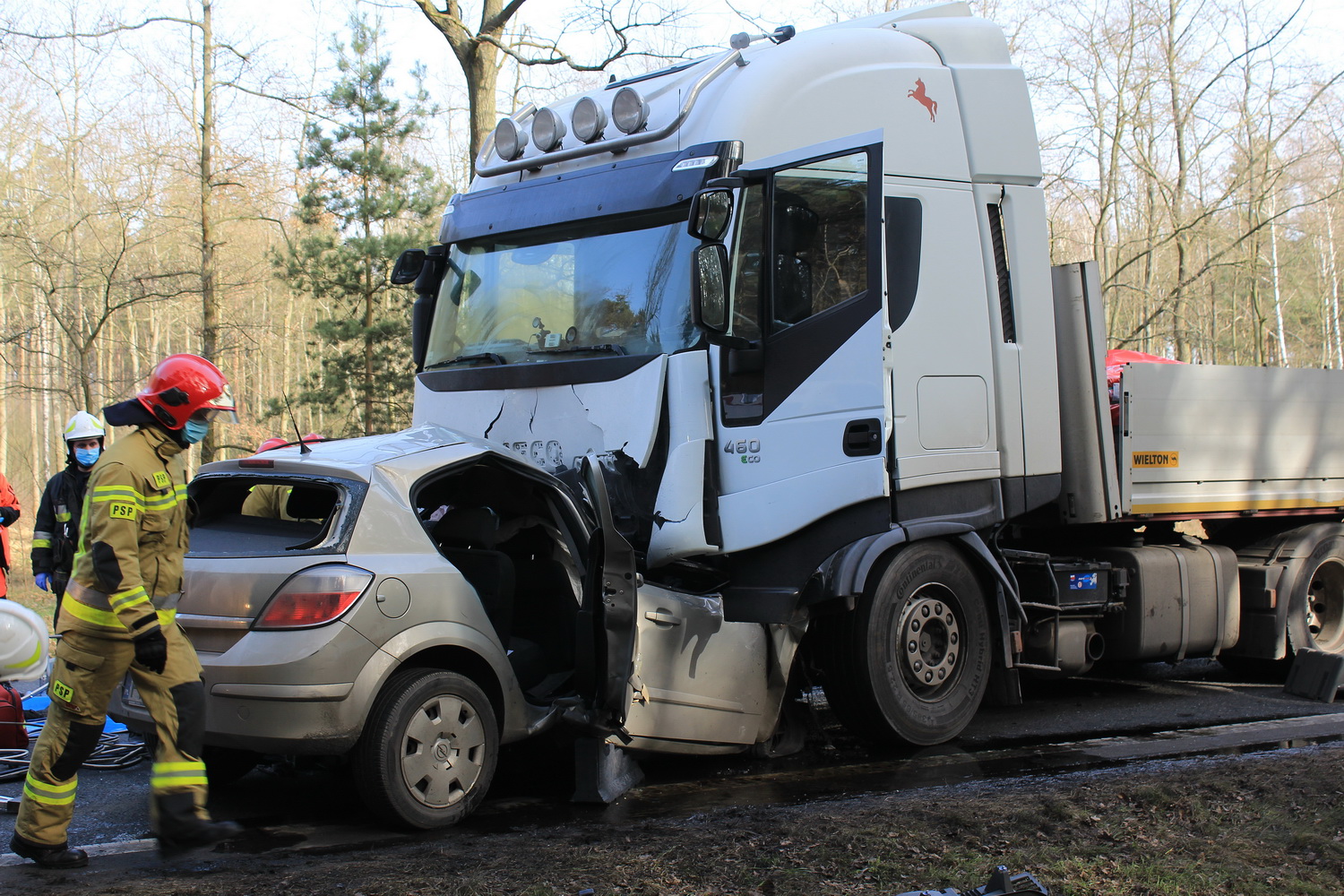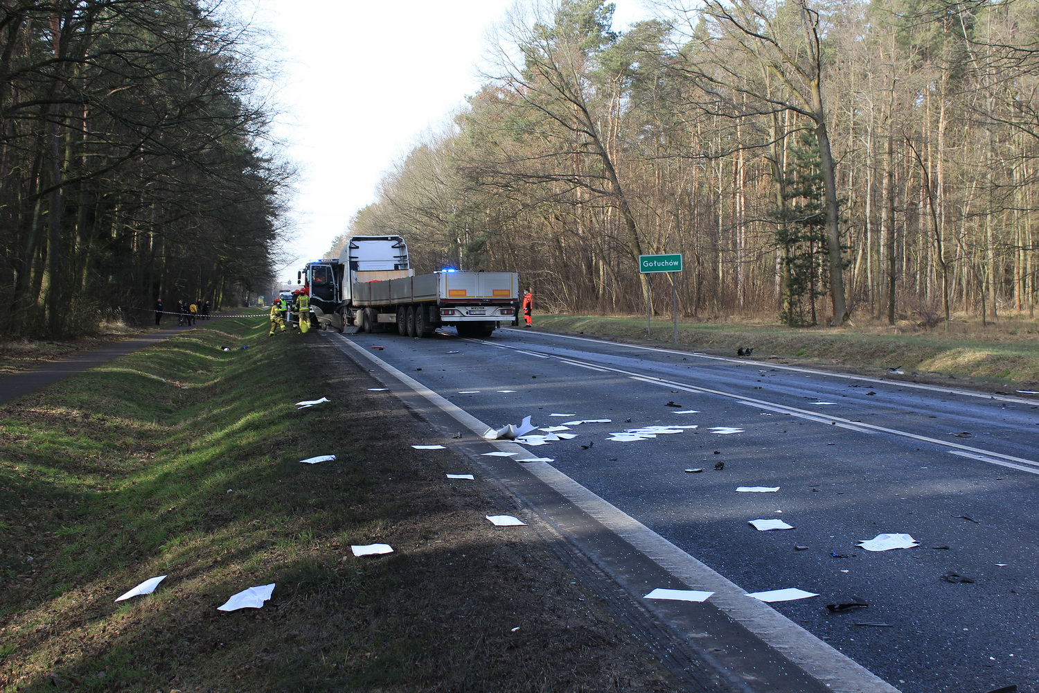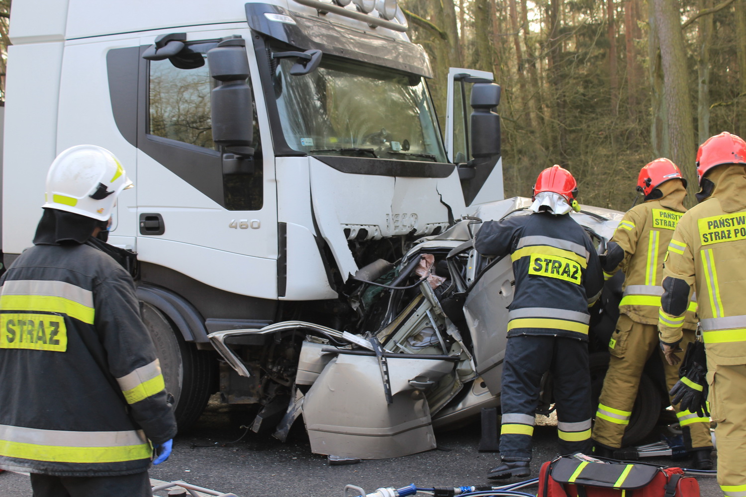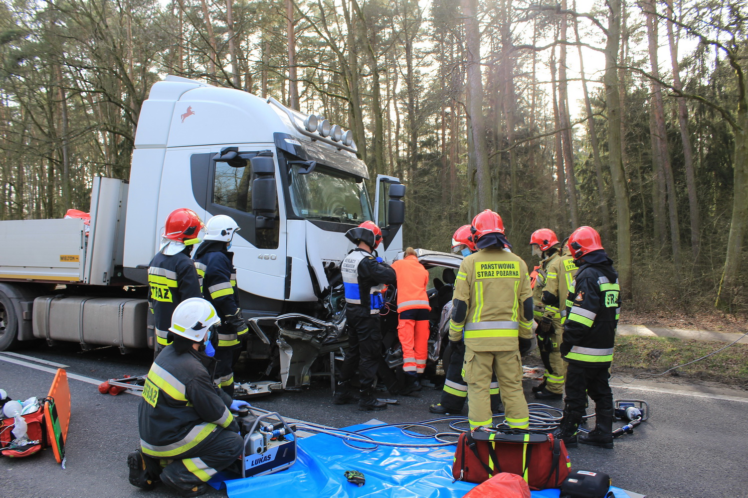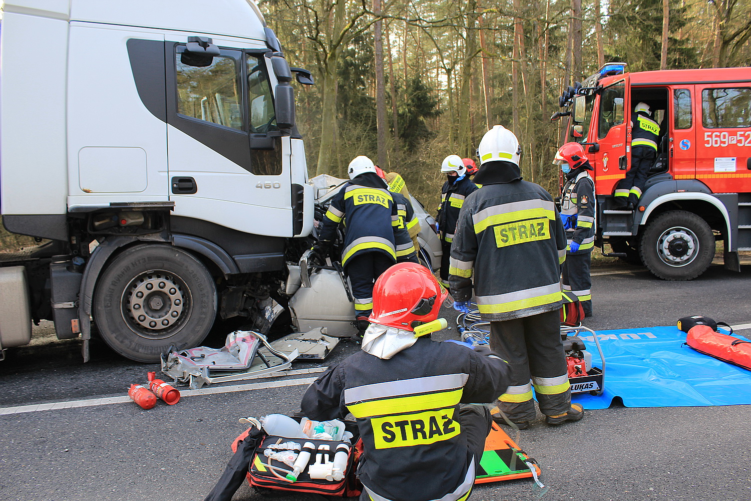 Na miejsce wypadku wyruszyły dwa zastępy strażaków z pleszewskiej Jednostki Ratowniczo – Gaśniczej PSP, zastęp Ochotniczej Straży Pożarnej z Gołuchowa oraz zespół ratownictwa medycznego i policja. Kiedy strażacy dotarli na miejsce wypadku okazało się, że w rozbitym oplu wciąż znajduje się jedna osoba. Jednak jej stan nie budził wątpliwości – osoba ta zginęła na miejscu. Przybyły na miejsce lekarz potwierdził zgon młodego mężczyzny. By wydobyć go ze zniszczonego auta strażacy musieli za pomocą sprzętu hydraulicznego usunąć elementy zniszczonego pojazdu i odsunąć go od ciężarówki. Działania ratownicze i usuwanie skutków wypadku trwały prawie osiem godzin, natomiast przyczyny tej tragedii ustala pleszewska policja i prokuratura.