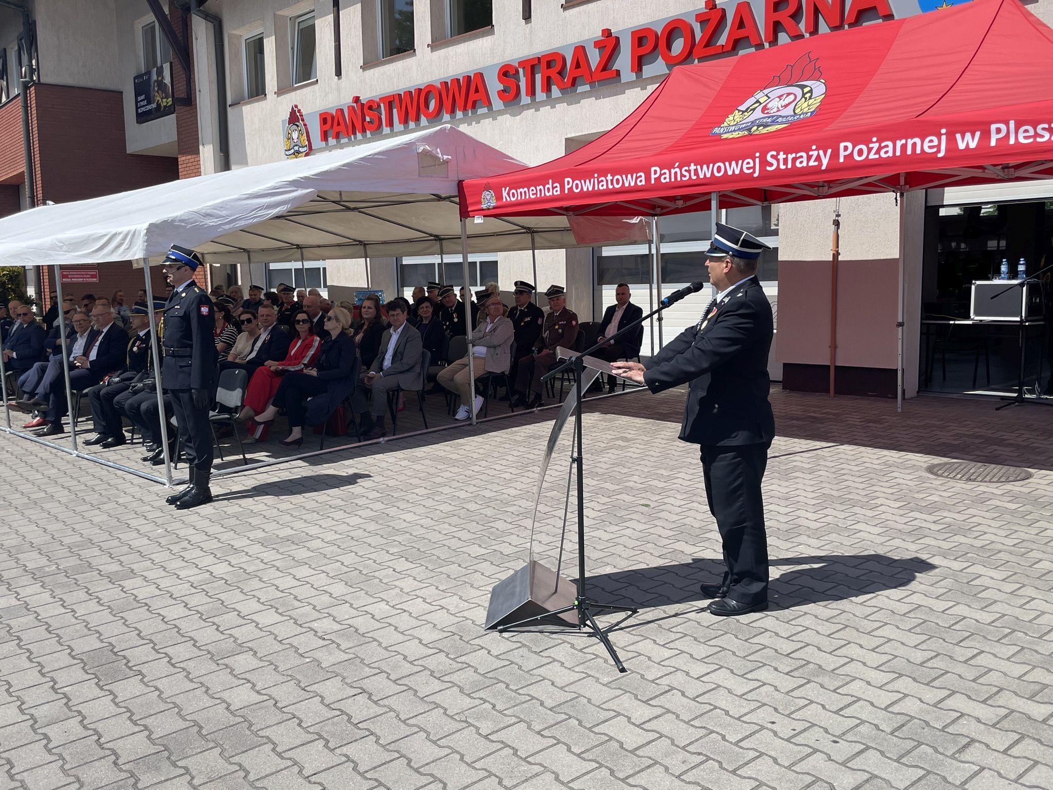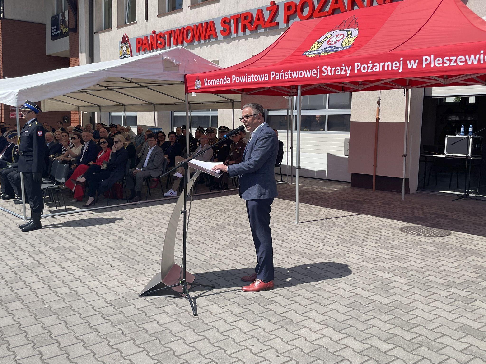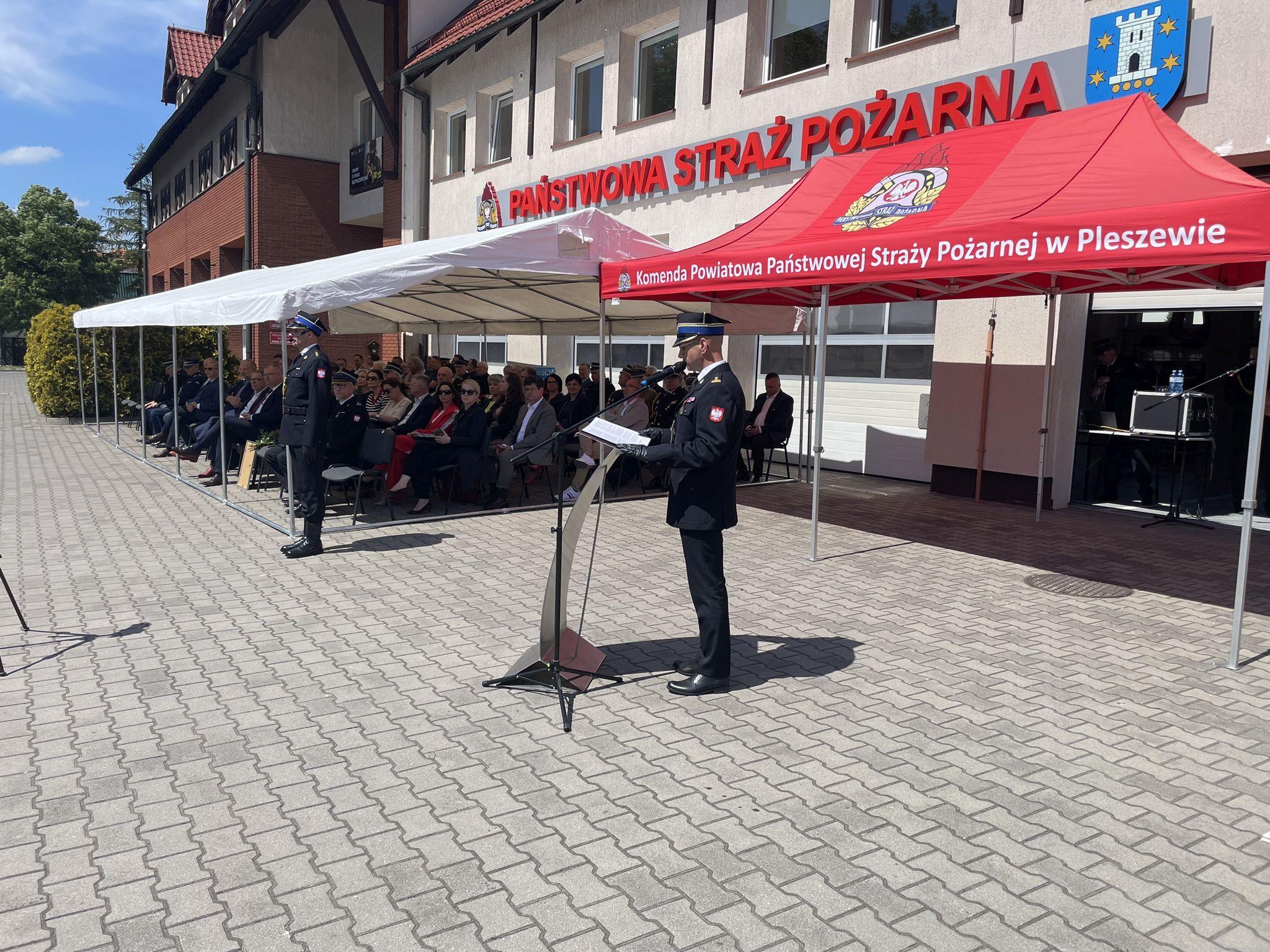 Przybyłych na uroczystość gości powitał bryg. Roland Egiert – Komendant Powiatowy PSP w Pleszewie, dziękując wszystkim za uczestnictwo w tym szczególnym dla pleszewskich strażaków dniu.