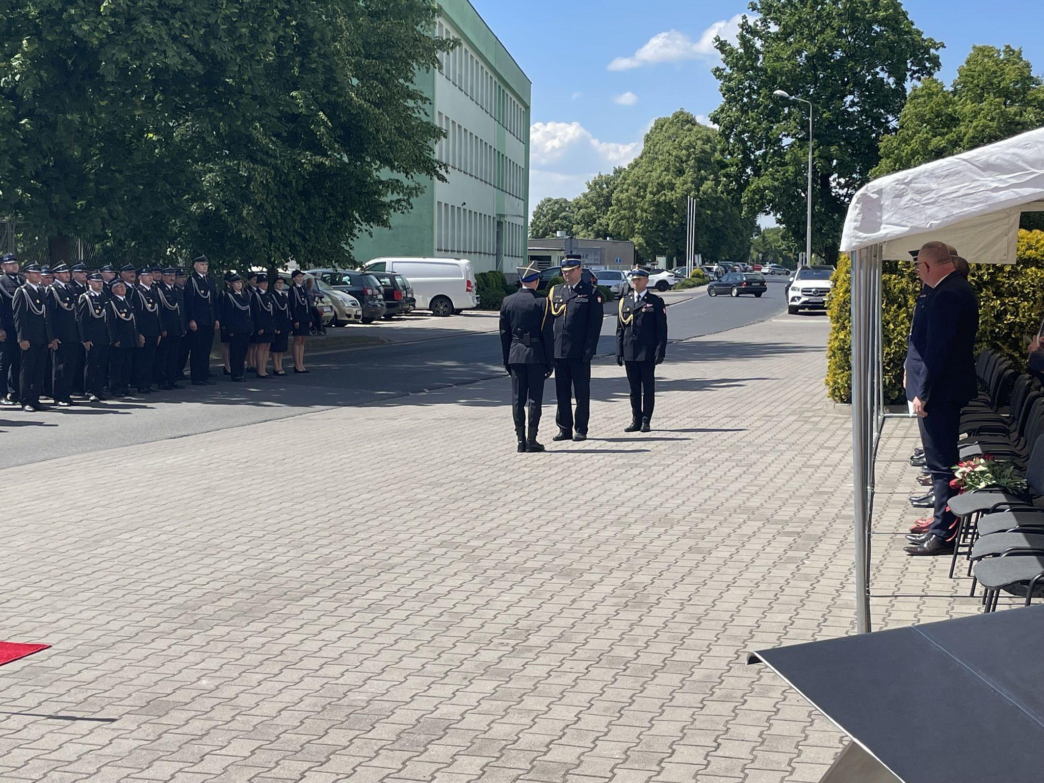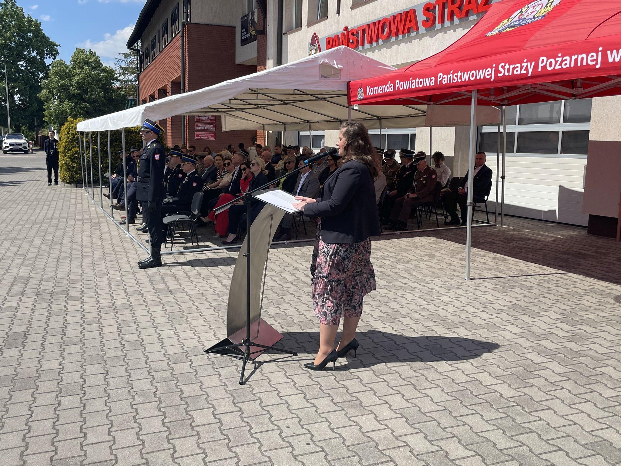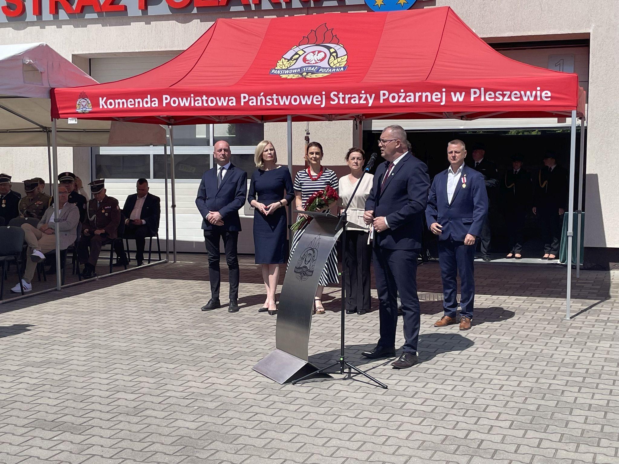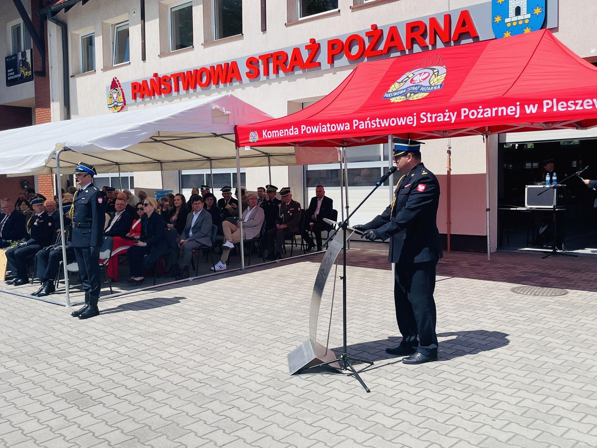 Przybyłych na uroczystość gości powitał bryg. Roland Egiert – Komendant Powiatowy PSP w Pleszewie, dziękując wszystkim za uczestnictwo w tym szczególnym dla pleszewskich strażaków dniu.
