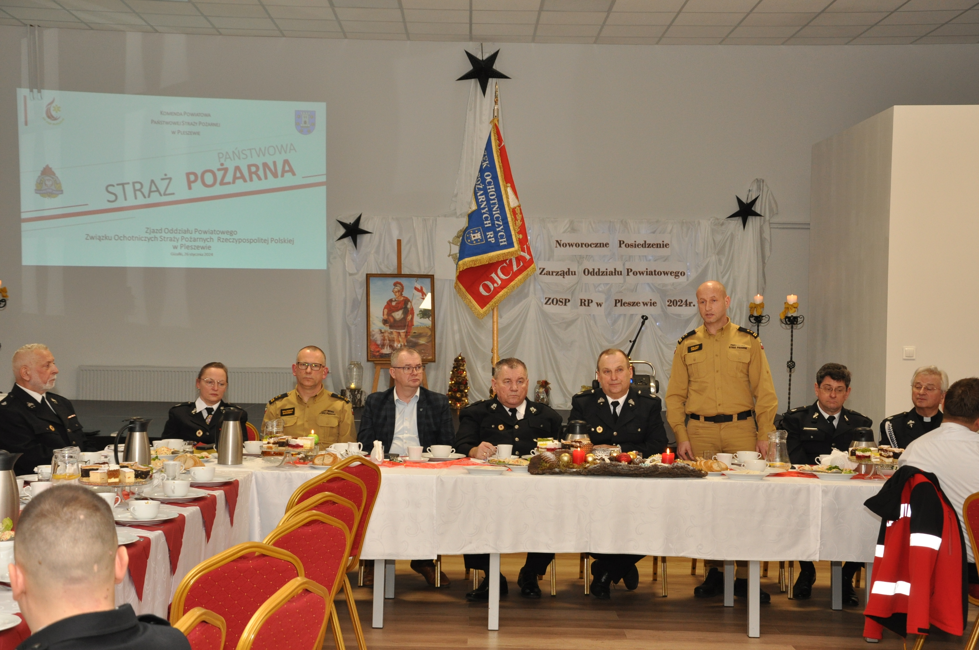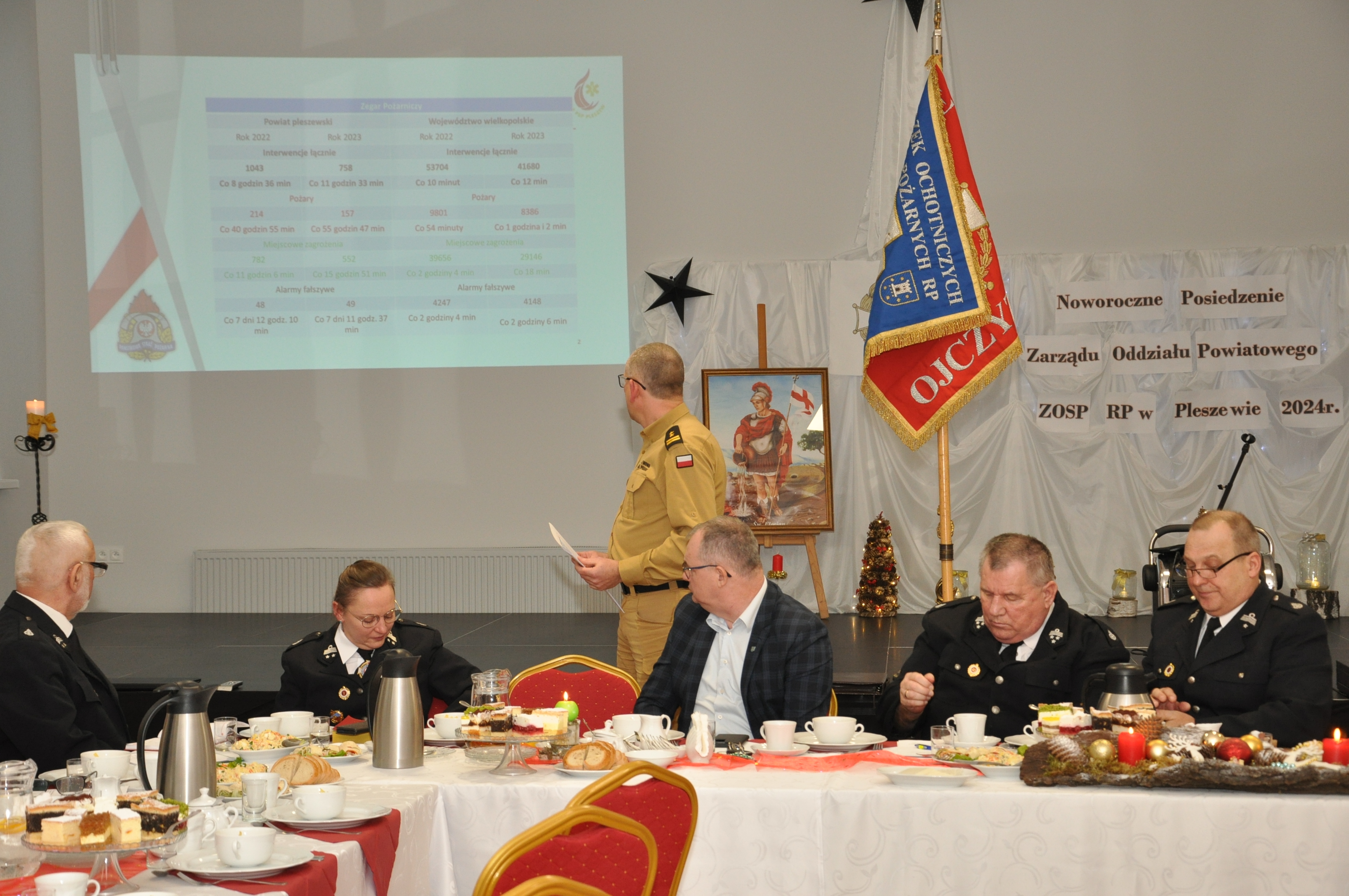 W zebraniu wzięli również udział: Komendant Powiatowy Państwowej Straży Pożarnej w Pleszewie bryg. Roland Egiert, jego zastępca – bryg. Waldemar Barański oraz st. kpt. Paweł Mimier - dowódca Jednostki Ratowniczo – Gaśniczej w Pleszewie. W swoim wystąpieniu Komendant Powiatowy Państwowej Straży Pożarnej podziękował wszystkim druhom za ogromne zaangażowanie i udział w akcjach ratowniczo – gaśniczych, ćwiczeniach oraz działaniach z zakresu prewencji społecznej. Natomiast jego zastępca przedstawił, w formie prezentacji multimedialnej, ubiegłoroczne i planowane działania pleszewskich strażaków.