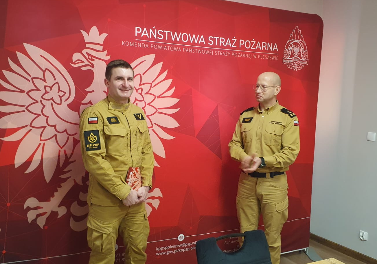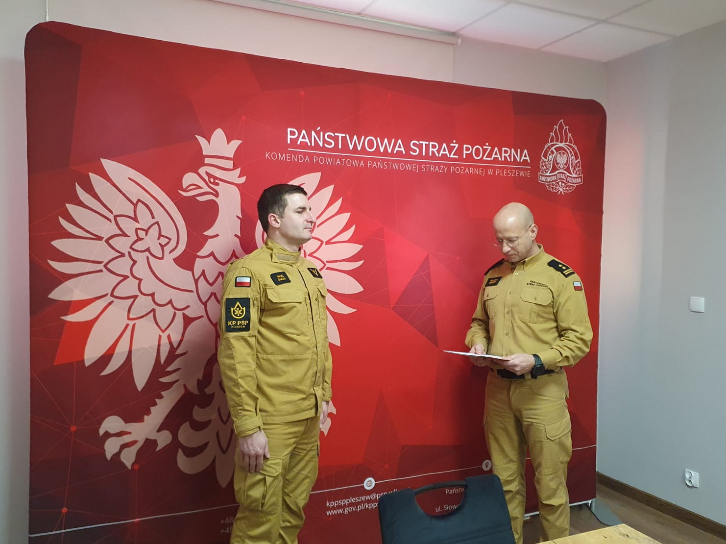Wręczając akt mianowania bryg. Roland Egiert, wraz z asystującymi mu: Zastępcą st. bryg. Waldemarem Barańskim, Dowódcą Jednostki Ratowniczo – Gaśniczej w Pleszewie st. kpt. Pawłem Mimierem, mł. asp. Mateuszem Grabarkiem – funkcjonariuszem pionu operacyjno-szkoleniowego oraz asp. Grzegorzem Wawrzyniakiem – Dowódcą II Zmiany Służbowej gratulowali wyróżnionemu mł. asp. Maciejowi Dajczakowi, życząc mu jednocześnie wielu sukcesów zawodowych na swoim stanowisku.