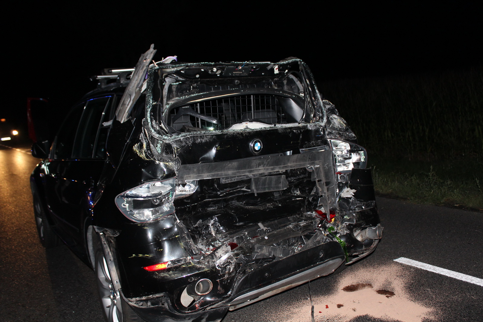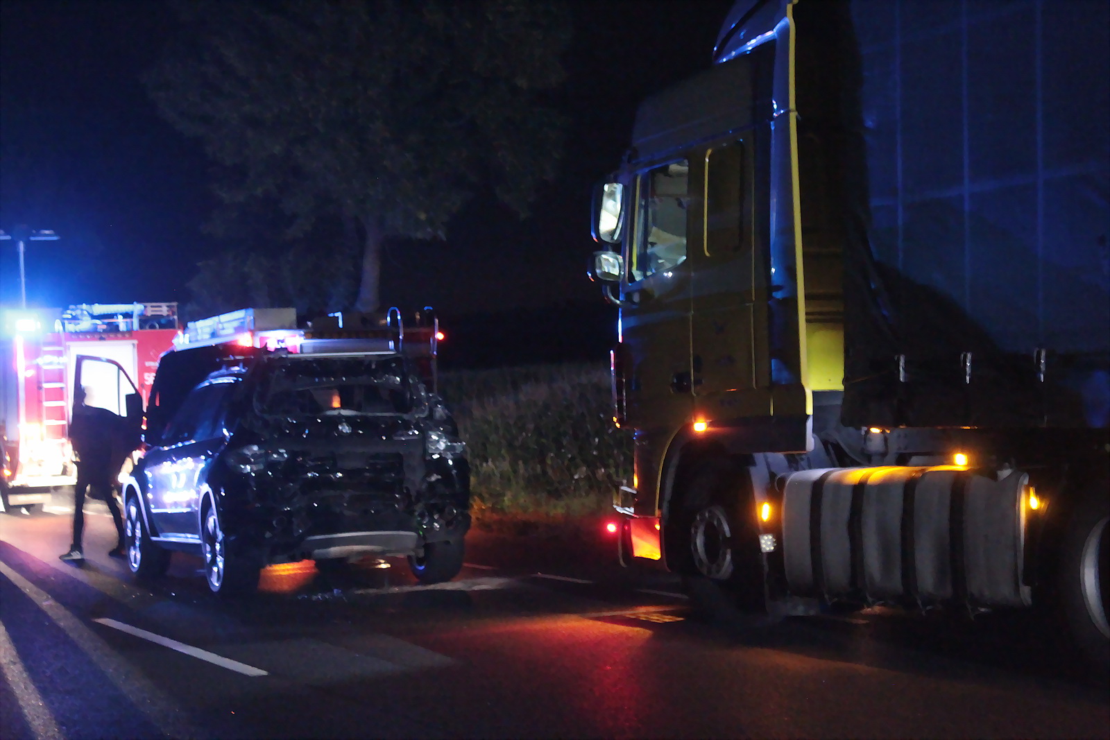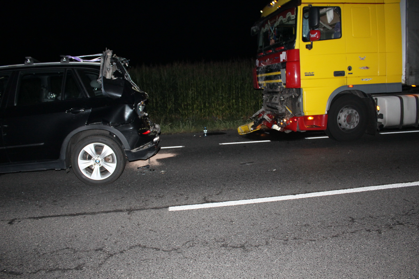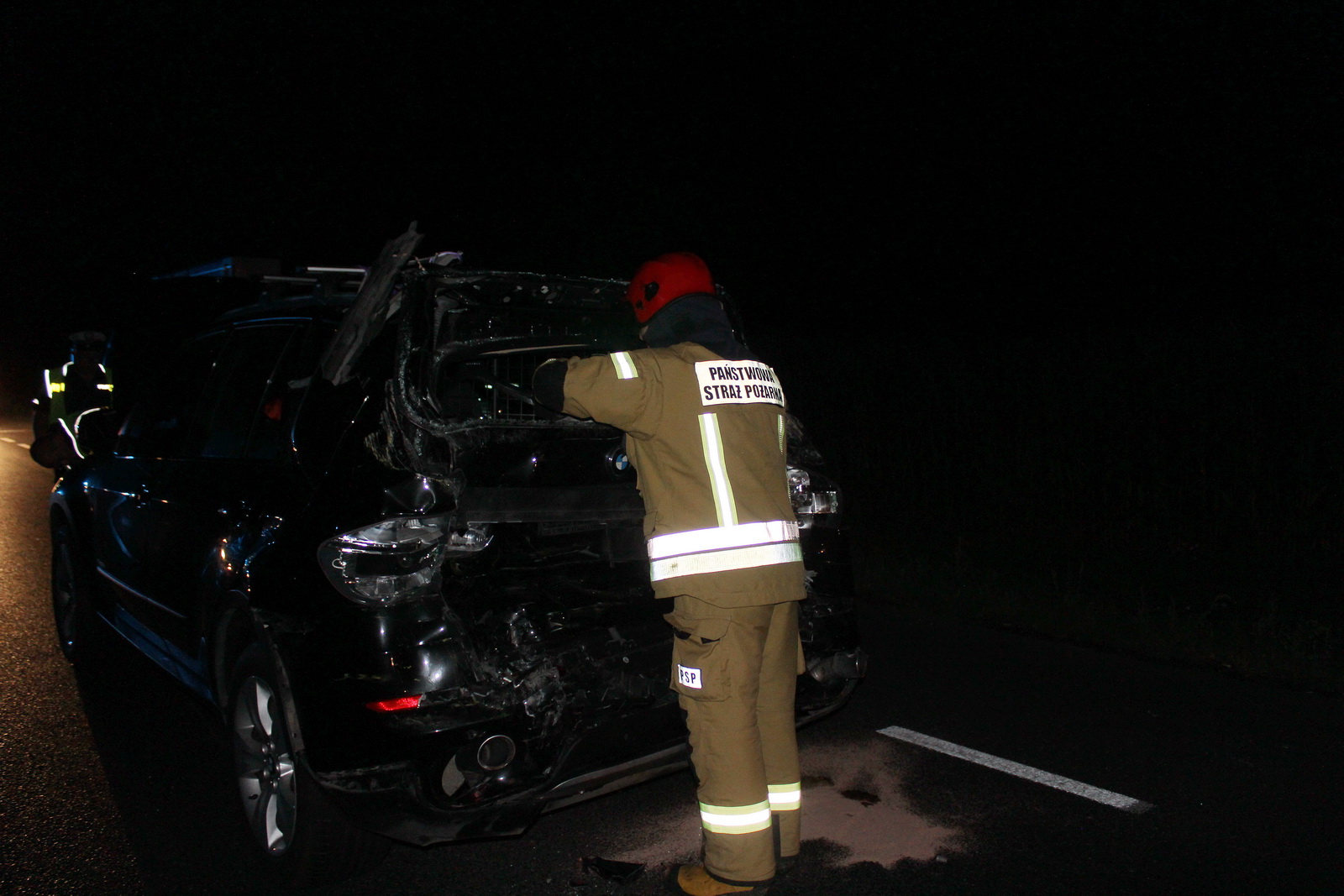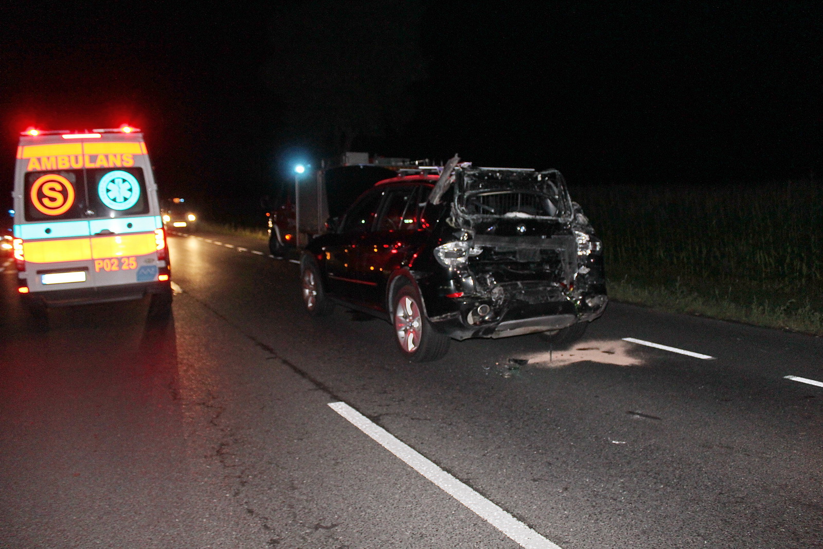 Około godziny 21:30 samochód ciężarowy DAF uderzył w tył osobowego BMW, którym jechało pięć osób, w tym dziecko. Na miejsce natychmiast zadysponowano dwa zastępy z Jednostki Ratowniczo – Gaśniczej w Pleszewie oraz po jednym zastępie z Ochotniczych Straży Pożarnych z Pleszewa, Gołuchowa i Krzywosądowa. Gdy strażacy dotarli na miejsce okazało się, że tył osobówki został całkowicie zniszczony. Na szczęście osoby jadące tym pojazdem zdołały go opuścić. Strażacy zabezpieczyli i oświetlili miejsce wypadku. Jednocześnie wszystkim uczestnikom udzielono pierwszej pomocy, a następnie przekazano ich przybyłym na miejsce zespołom ratownictwa medycznego. Wszystkie osoby jadące osobówka trafiły do szpitala. Więcej szczęścia miał jadący ciężarówką, który nie odniósł poważniejszych obrażeń.
