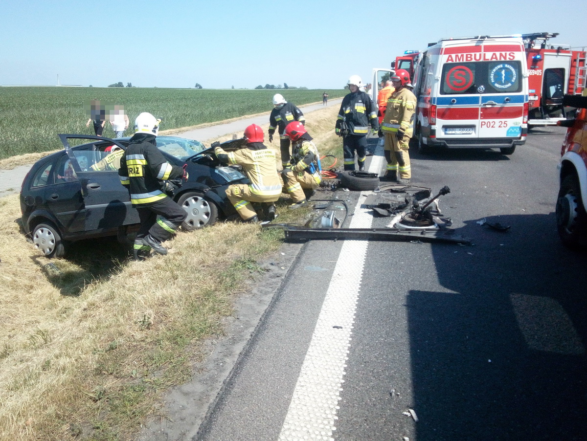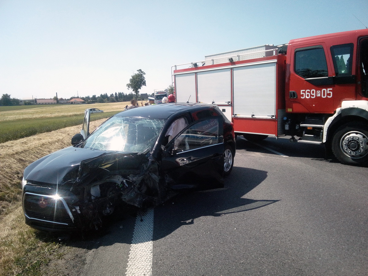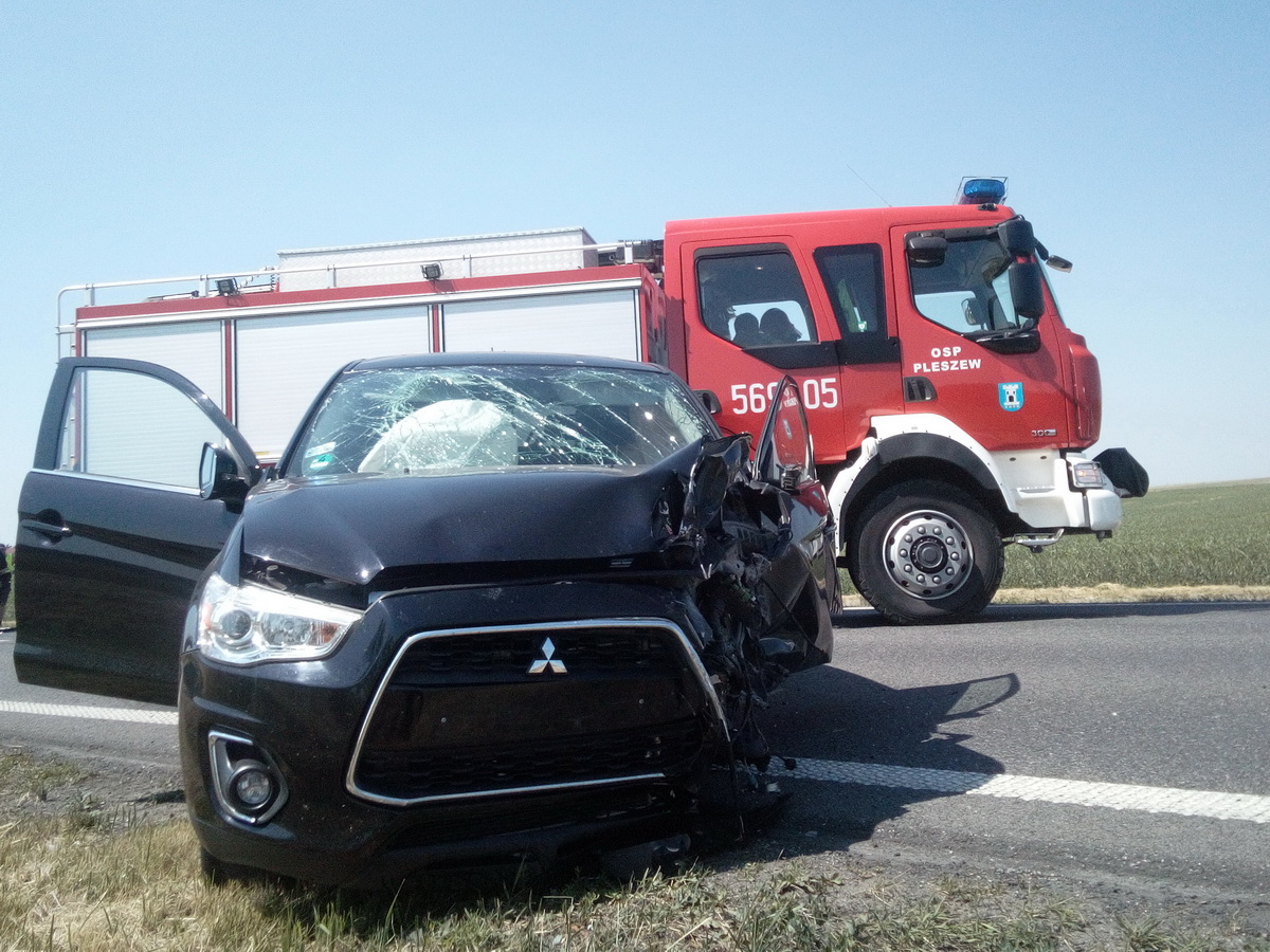Kilka minut po godzinie czternastej zderzyły się tam czołowo dwa samochody osobowe marki Mitsubishi i Opel Corsa. Na pomoc ofiarom wypadku natychmiast wyruszyły dwa zastępy strażaków z pleszewskiej Jednostki Ratowniczo - Gaśniczej, zastęp strażaków – ochotników z OSP w Pleszewie, zespoły ratownictwa medycznego oraz policja. Na miejscu okazało się, że dwie biorące udział w zdarzeniu osoby zdołały opuścić rozbite auto. Niestety, we jednym wraku wciąż znajdowała się poszkodowana kobieta. Dopiero przy użyciu sprzętu hydraulicznego strażacy usunęli część karoserii, dostali się do rannej i wspólnie z zespołem ratownictwa medycznego, przenieśli ją do karetki. Następnie zabezpieczono wycieki płynów eksploatacyjnych i usunięto elementy rozbitych pojazdy. Działania ratownicze i usuwanie skutków tego wypadku trwały ponad cztery godziny.
