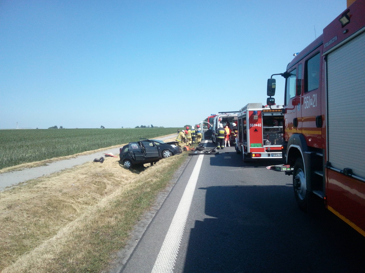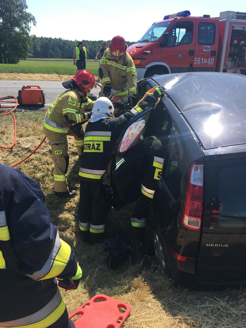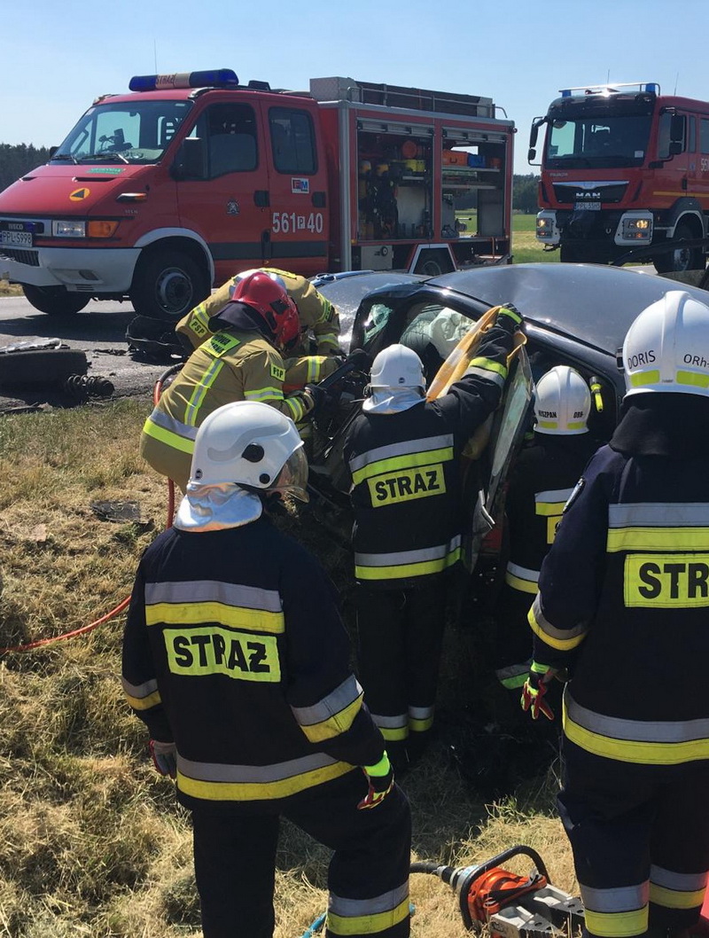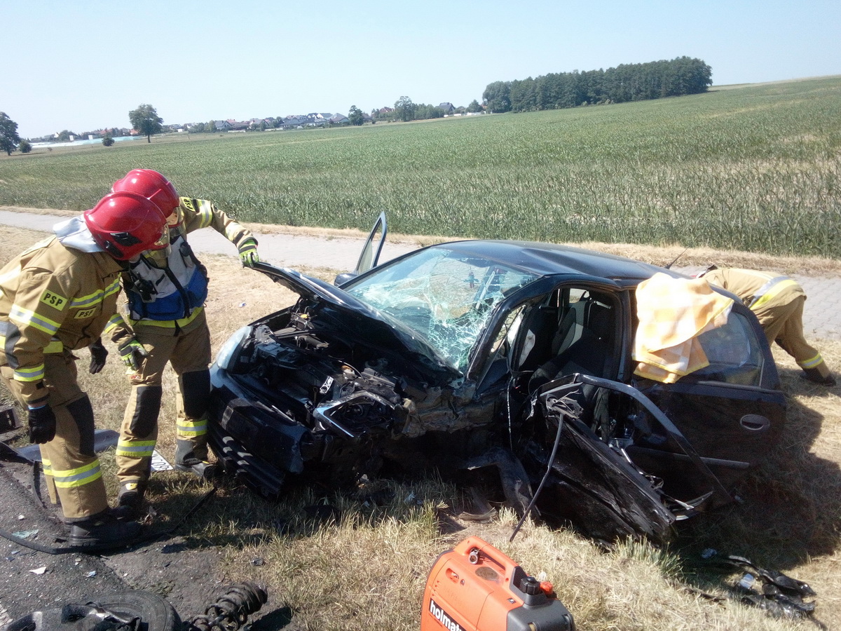 Kilka minut po godzinie czternastej zderzyły się tam czołowo dwa samochody osobowe marki Mitsubishi i Opel Corsa. Na pomoc ofiarom wypadku natychmiast wyruszyły dwa zastępy strażaków z pleszewskiej Jednostki Ratowniczo - Gaśniczej, zastęp strażaków – ochotników z OSP w Pleszewie, zespoły ratownictwa medycznego oraz policja. Na miejscu okazało się, że dwie biorące udział w zdarzeniu osoby zdołały opuścić rozbite auto. Niestety, we jednym wraku wciąż znajdowała się poszkodowana kobieta. Dopiero przy użyciu sprzętu hydraulicznego strażacy usunęli część karoserii, dostali się do rannej i wspólnie z zespołem ratownictwa medycznego, przenieśli ją do karetki. Następnie zabezpieczono wycieki płynów eksploatacyjnych i usunięto elementy rozbitych pojazdy. Działania ratownicze i usuwanie skutków tego wypadku trwały ponad cztery godziny.