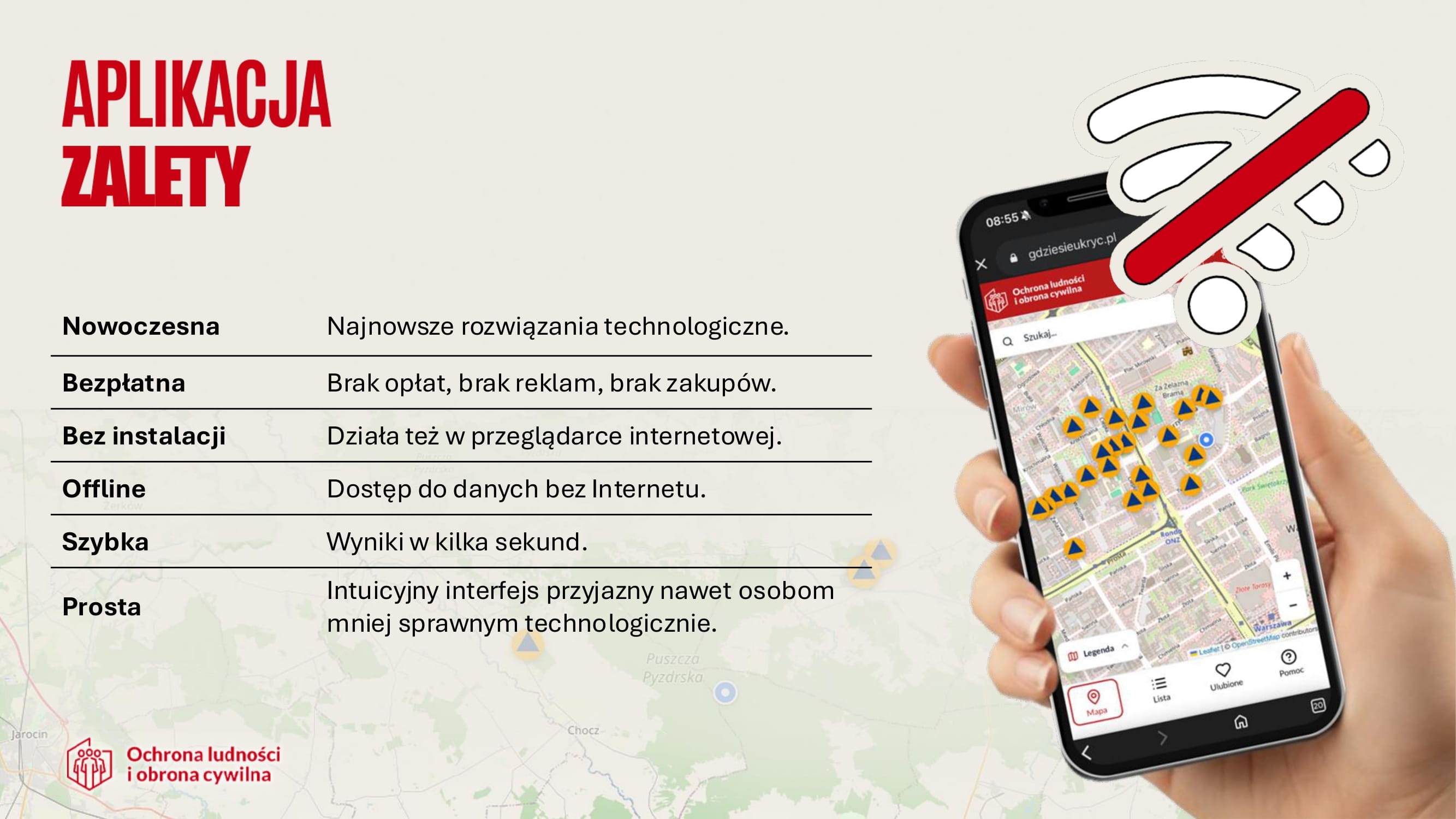 • Dostępny całodoboweo (24h) - punkty oznaczone dodatkową zieloną obwódką wokół znaku obrony cywilnej,