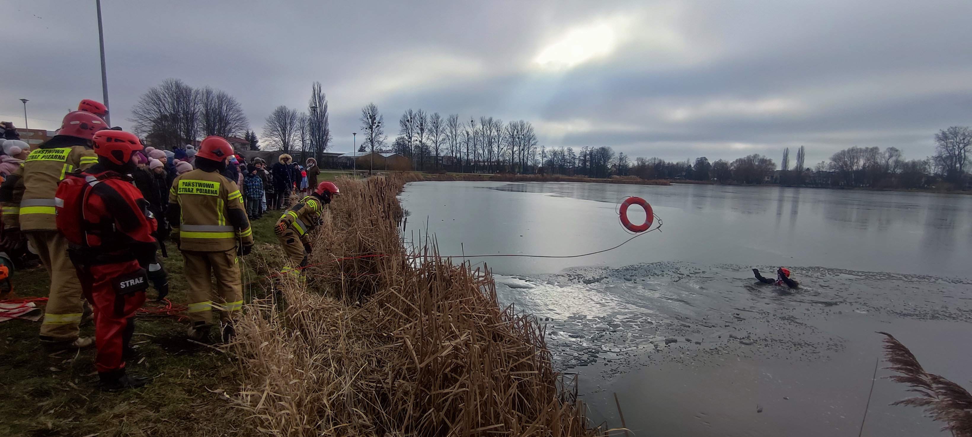 Ćwiczono zasady bezpiecznego poruszania się po lodzie przy użyciu sprzętu będącego na wyposażeniu Państwowej Straży Pożarnej, techniki asekuracji i zabezpieczenia ratowników, a także udzielanie kwalifikowanej pierwszej pomocy osobom znajdującym się w stanie hipotermii.