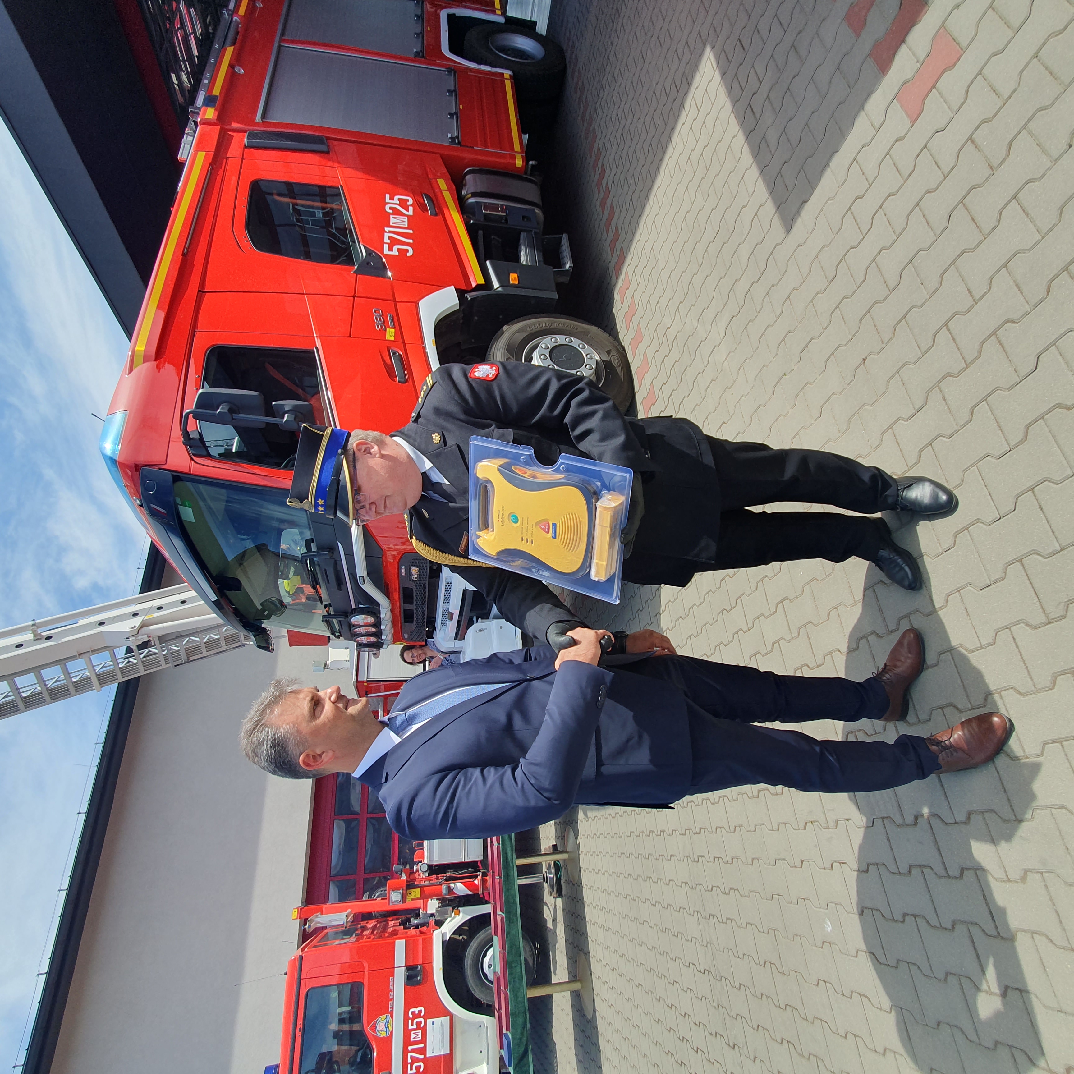 Podczas uroczystości strażacy z KP PSP w Płońsku otrzymali z rąk Prezesa Zarządu Banku Spółdzielczego w Płońsku Pana Dariusza Konofalskiego prezent w postaci defibrylatora AED.