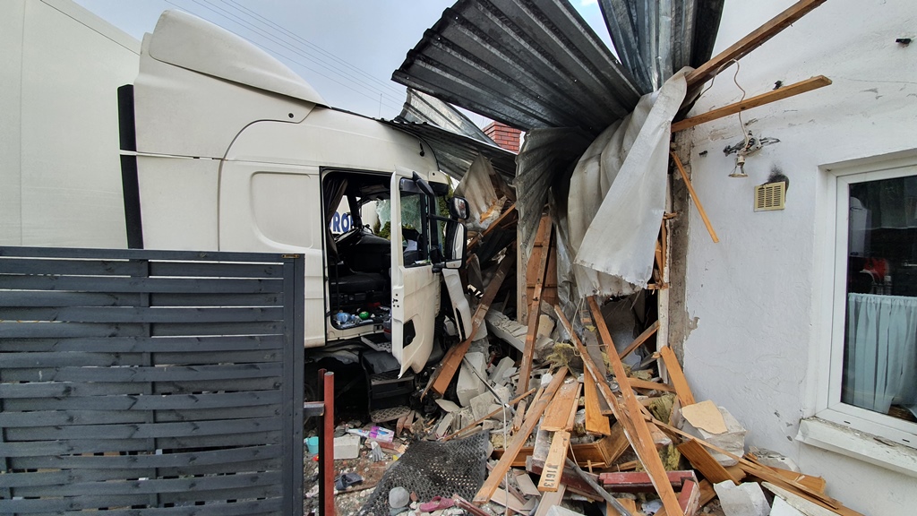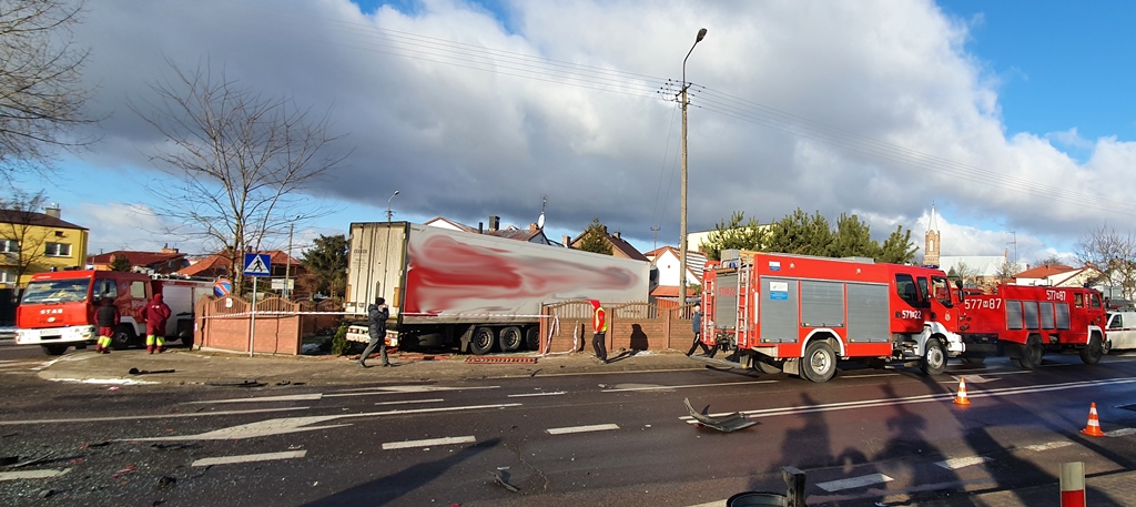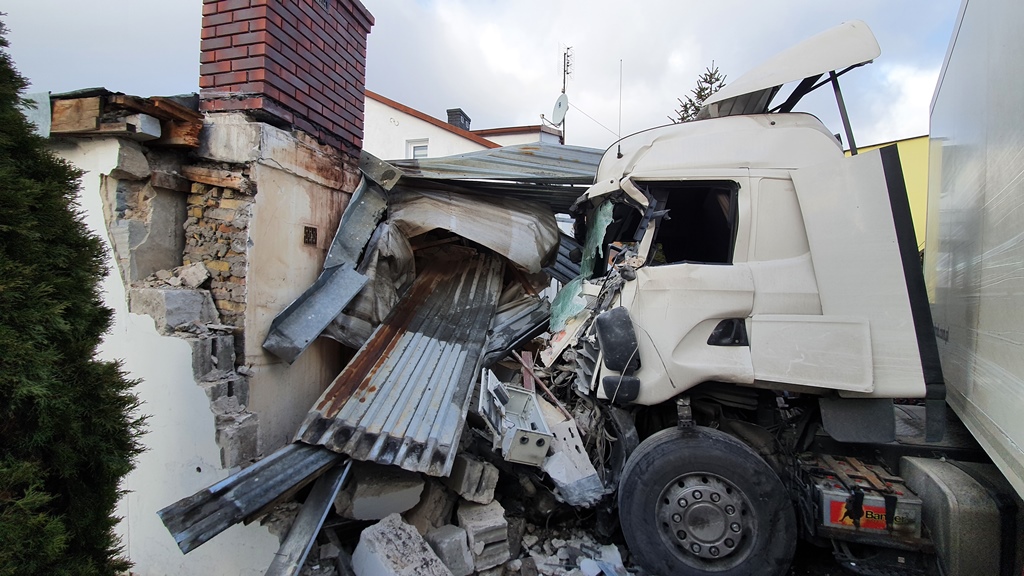 Kierujący samochodem ciężarowym zjechał z drogi krajowej nr 50 przecinając przeciwległy pas, wjechał na prywatną posesję i uderzył w budynek mieszkalny, uszkadzając go. W zdarzeniu brał również udział, poruszający się drogą samochód osobowy. Ranny kierowca ciężarówki został zabrany do szpitala. Dwie osoby przebywające w budynku mieszkalnym oraz kierowca samochodu osobowego nie odniosły obrażeń.