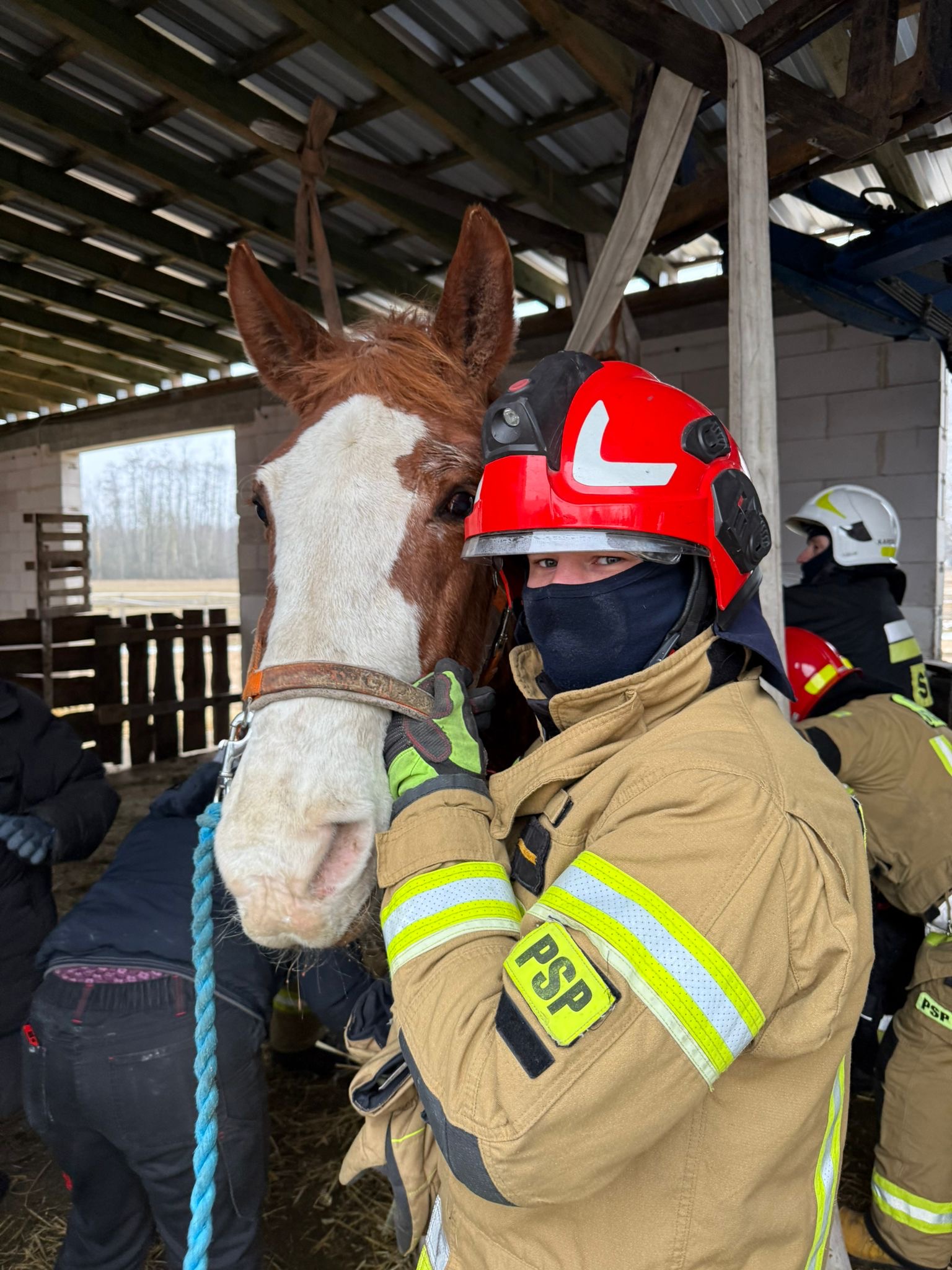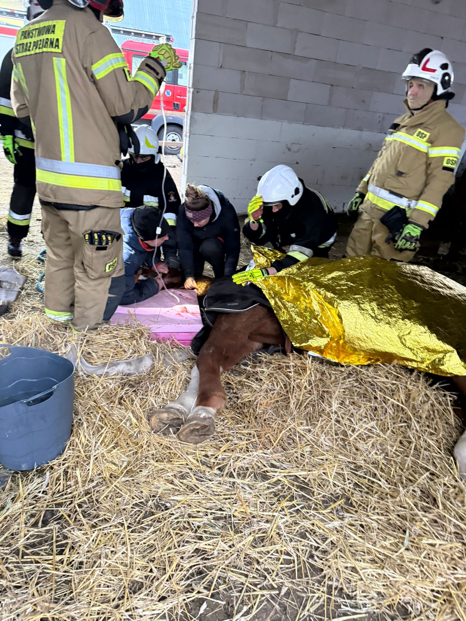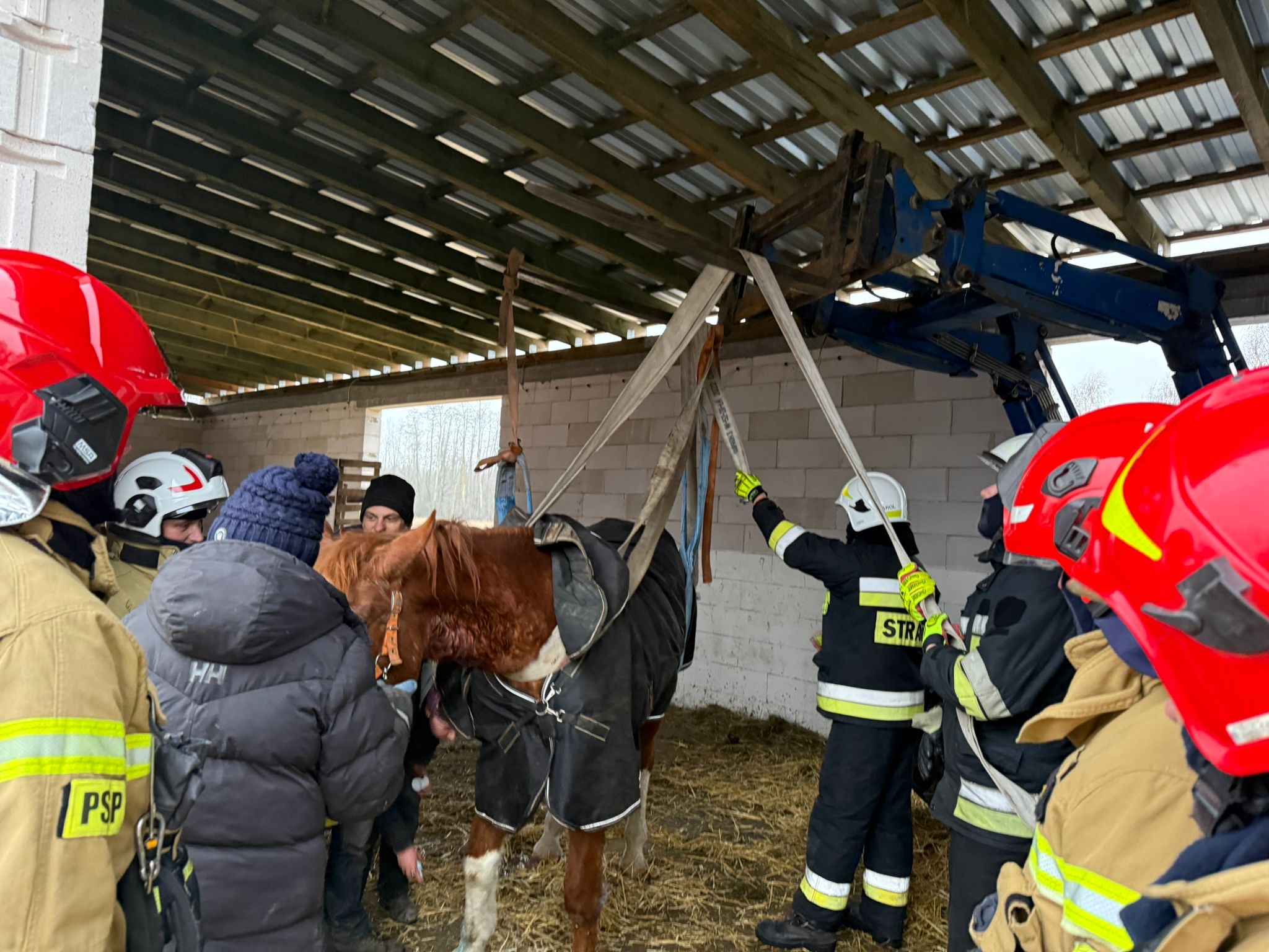 30.01.2026 r. o godz. 6.01 do Stanowisko Kierowania Komendanta Powiatowego Państwowej Straży Pożarnej w Poddębicach wpłynęło zgłoszenie o potrzebie pomocy koniowi, który się przewrócił i nie potrafi się podnieść. Strażacy po przyjeździe na miejsce zdarzenia – stadniny Fundacji pod której opieką był koń zastali zwierzę, które nie było w stanie samodzielnie stanąć na nogi. Podjęte działania strażaków wraz z właścicielami w asyście lekarza weterynarii doprowadziły do postawienia konia na kopyta i jego naturalnej postawy. Akcja zakończyła się powodzeniem, a koń wrócił do normalnego funkcjonowania. Zwierzę zostało przekazane opiekunom i lekarzowi weterynarii.