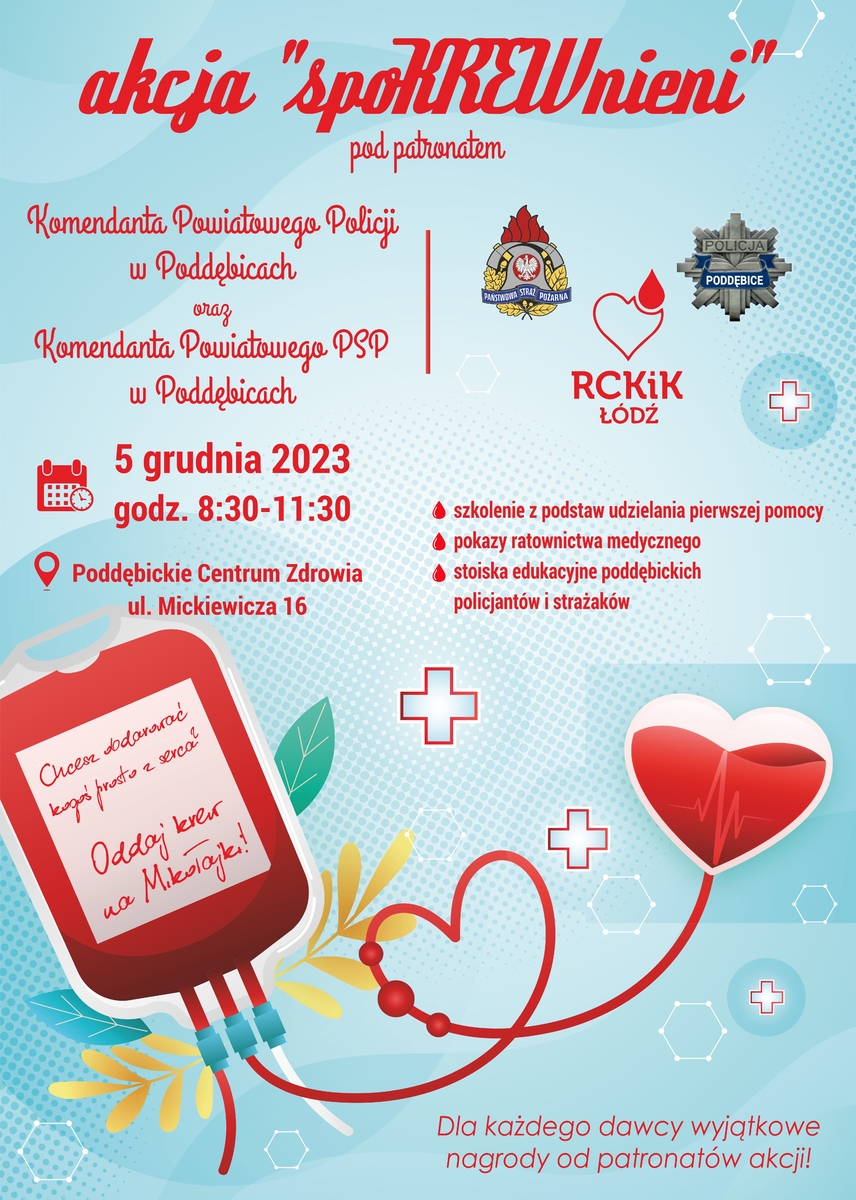 Zapraszamy do wzięcia udziału w mikołajkowej akcji "spokrewnieni”, którą patronatem objęli Komendant Powiatowy Policji w Poddębicach oraz Komendant Powiatowy Państwowej Straży Pożarnej w Poddębicach. Wydarzenie odbędzie się 5 grudnia w godzinach 8:30-11:30 na parkingu Poddębickiego Centrum Zdrowia.