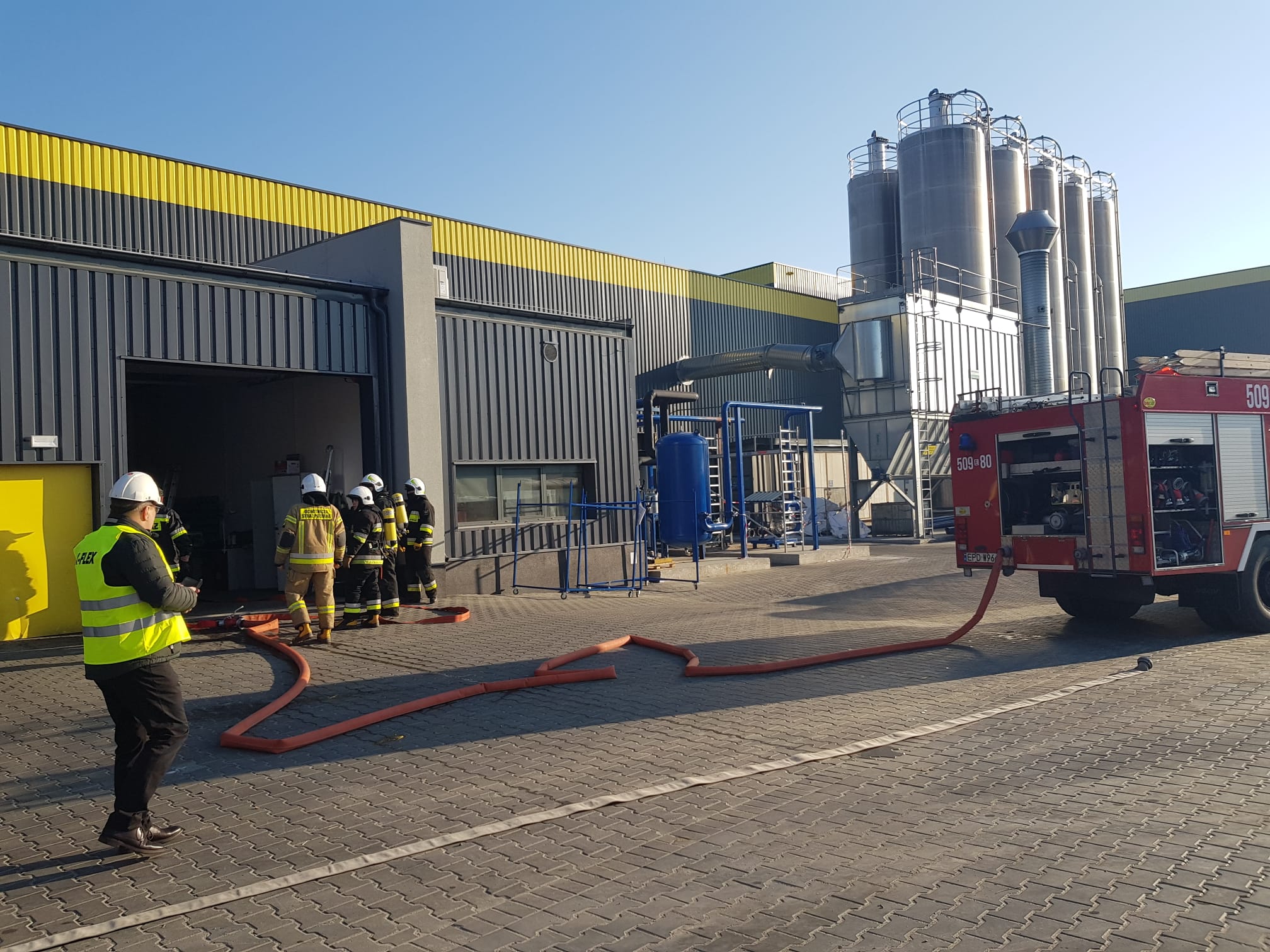 Podczas ćwiczeń strażacy mieli możliwość zapoznania się z zakładem i specyfiką produkcji. Działania te mają ogromne znaczenie przy wystąpieniu ewentualnego zagrożenia i podjęciu akcji ratowniczej. Kolejnym elementem przeprowadzonych cwiczeń było praktyczne zaznajomienie pracowników zakładu z zasadami gaszenia przy użyciu gaśnic proszkowych. Dokonano sprawdzenia skuteczności środków daśniczych wykorzystywanych w zakładzie poprzez praktyczne gaszenie półproduktów i wyrobów gotowych wytwarzanych w procesie produkcji.