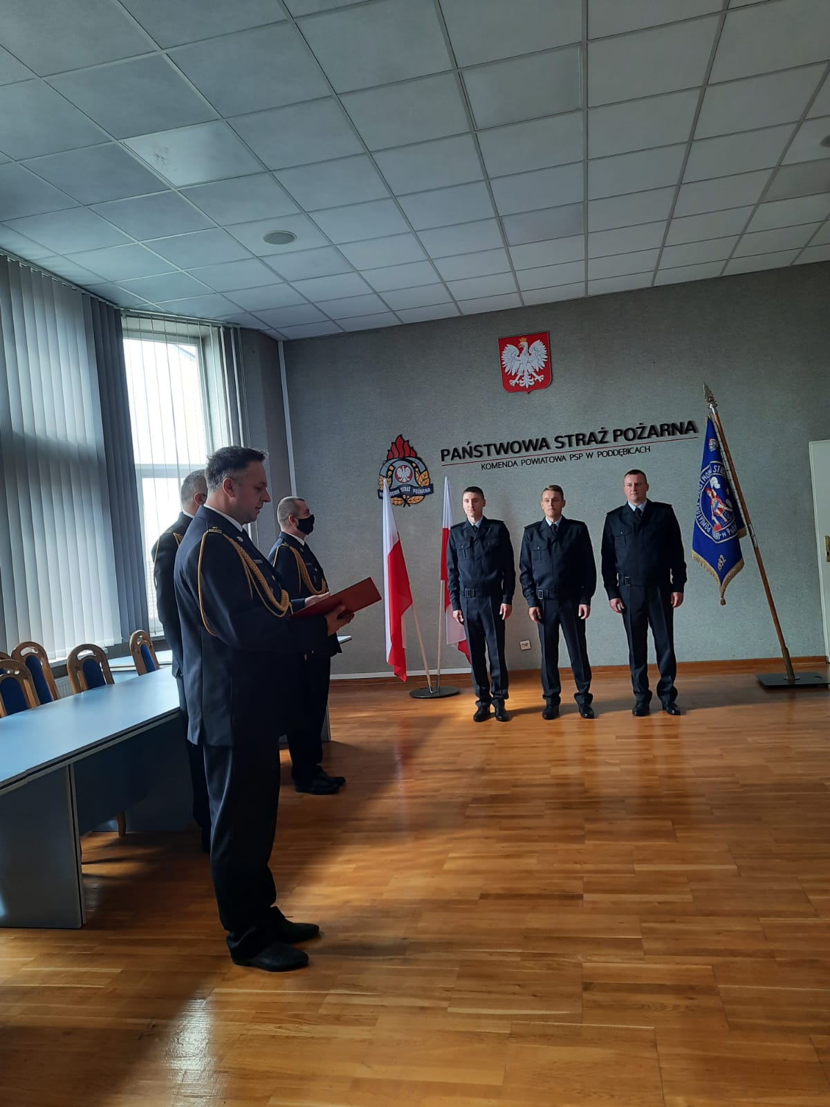 Z dniem 01 września 2021 roku służbę w Komedzie Powiatowej PSP w Poddębicach rozpoczęło pięciu funkcjonariuszy. Dwóch z nich to absolwenci Centralnej Szkoły PSP skierowani do służby przez Komendanta Głównego. Pozostali trzej zostali wyłonieni w drodze naboru i w dniu wczorajszym złożyli ślubowanie. Po wypowiedzeniu słów roty zaprzysiężeni funkcjonariusze otrzymali akty ślubowania oraz akty nadania stopnia służbowego.