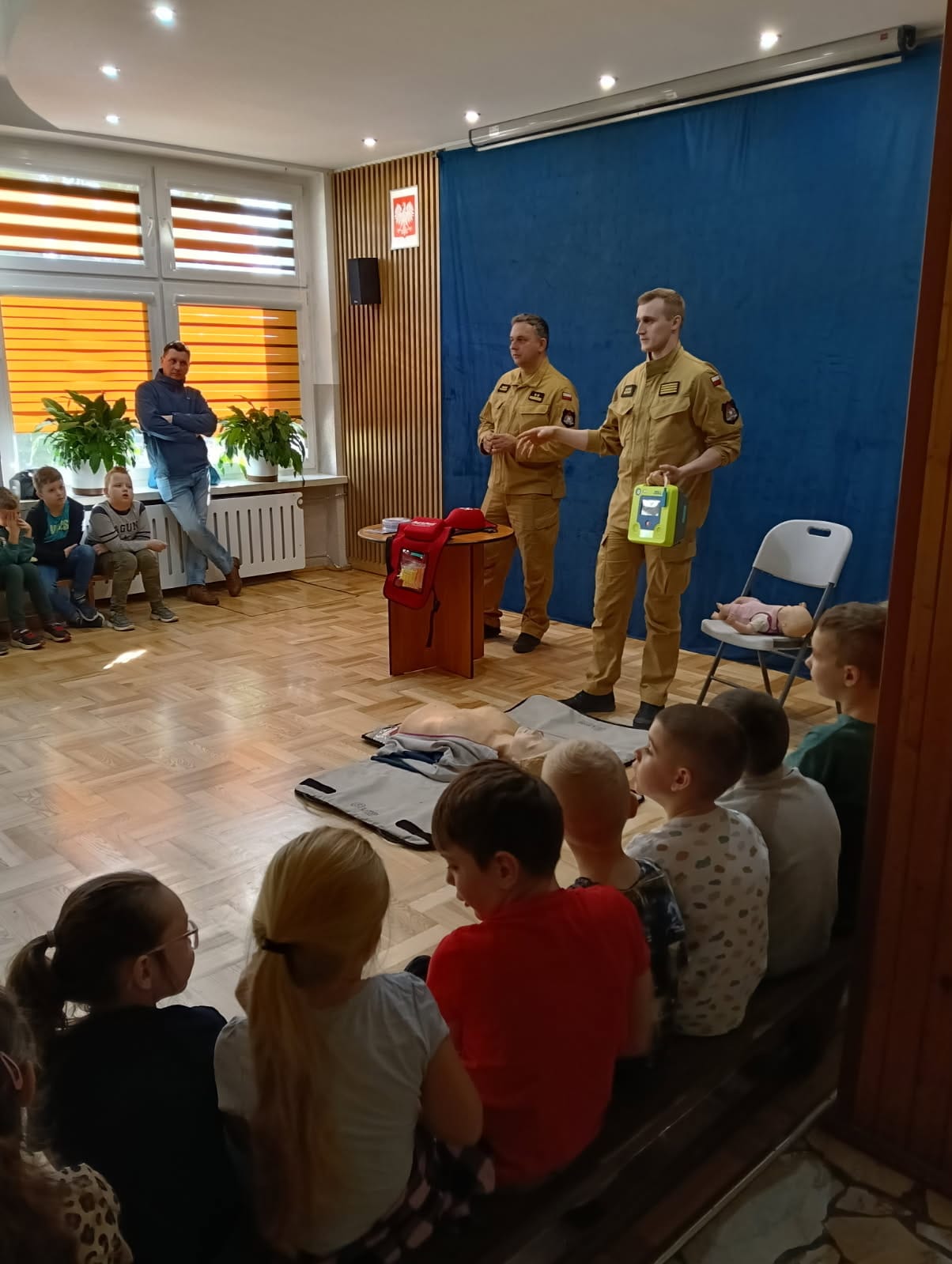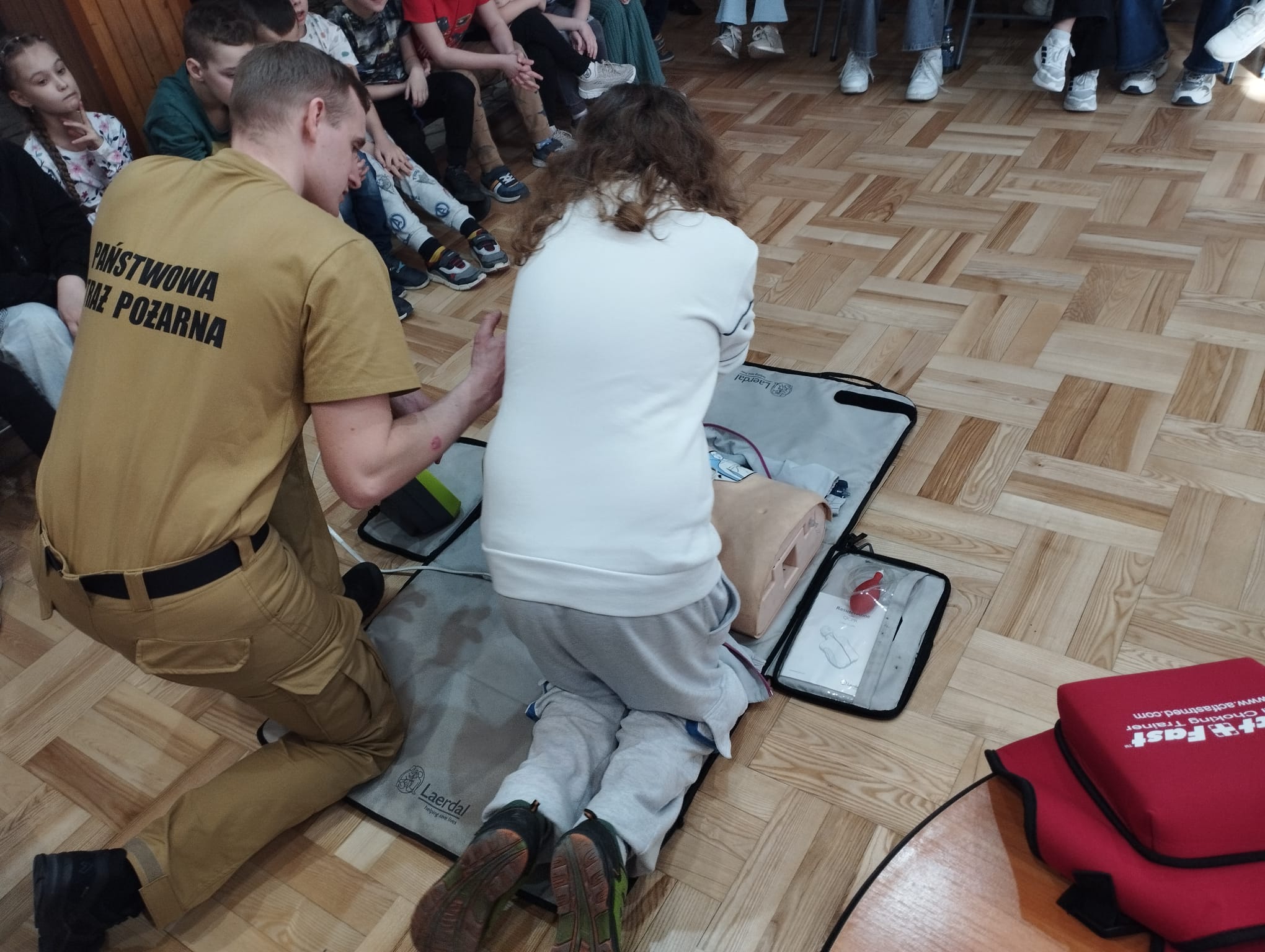 Ponadto przygotowano dla dzieci instruktaż pierwszej pomocy, gdzie uczniowie mogli zaznajomić się z podstawami resuscytacji krążeniowo-oddechowej. Na spotkaniu omówiono także korzystanie z defibrylatora AED oraz pomoc poszkodowanym przy zadławieniach oraz ułożenie w pozycji bezpiecznej.