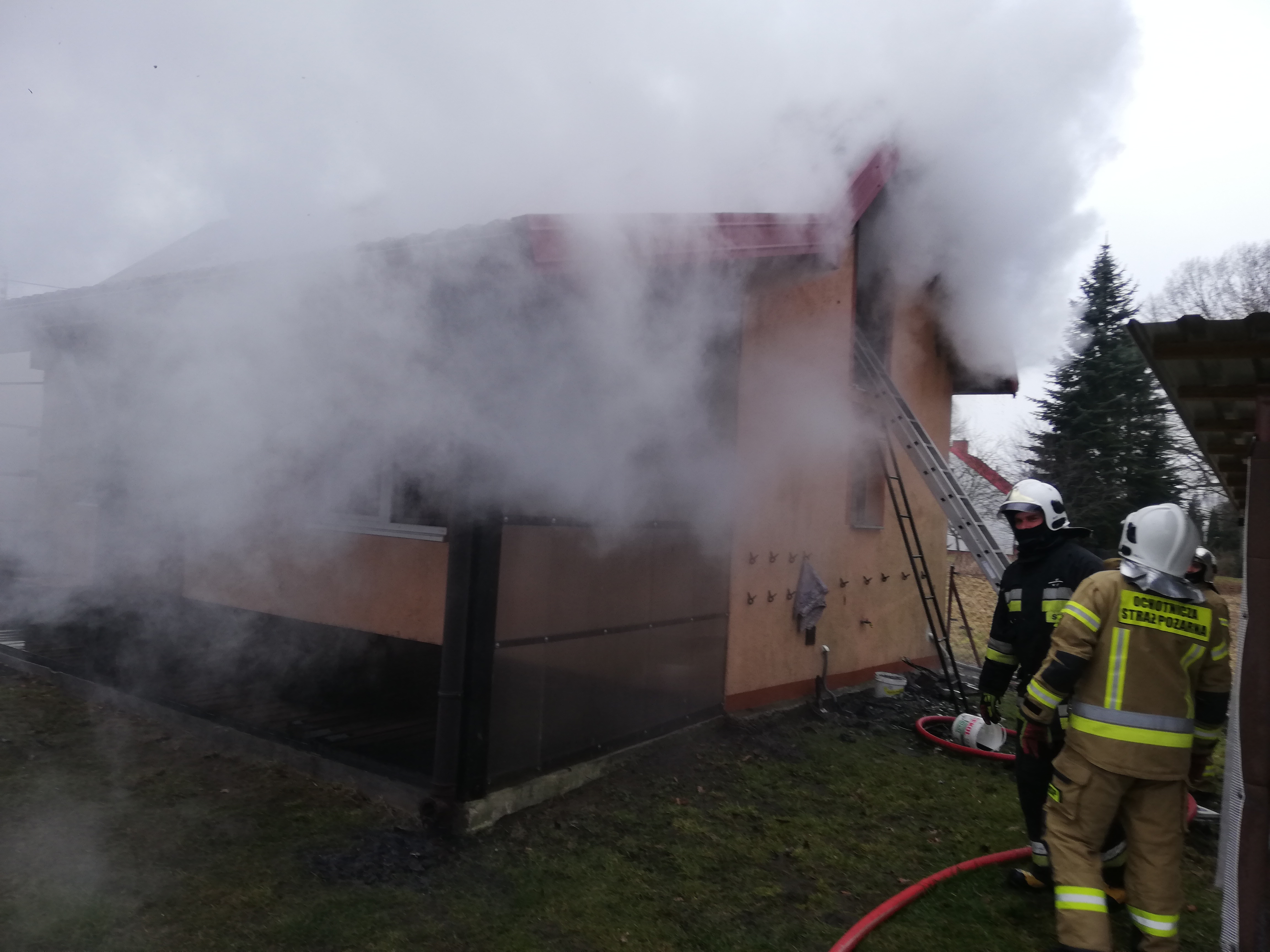 Po przyjeździe na miejsce zastano budynek mieszkalny z poddaszem użytkowym, które było objęte pożarem. Działania straży polegały na zabezpieczeniu miejsca zdarzenia, odłączeniu dopływu energii elektrycznej, podaniu 4 prądów wody w natarciu, otwarciu okien i drzwi w obiekcie celem oddymienia, sprawdzeniu pogorzeliska przy pomocy kamery termowizyjnej. W zdarzeniu żadna z osób nie została poszkodowana.