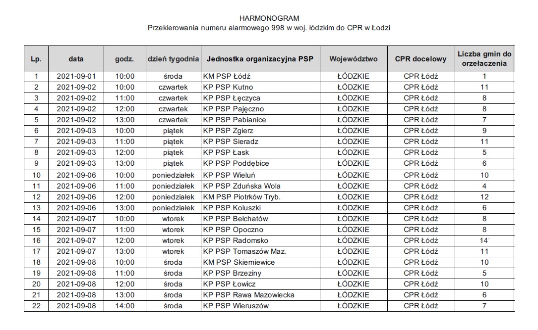 Harmonogram przełączania numerów alarmowych 998 obsługiwanych dotychczas przez komendy powiatowe/miejskie PSP do CPR przedstawia zdjęcie w galerii.