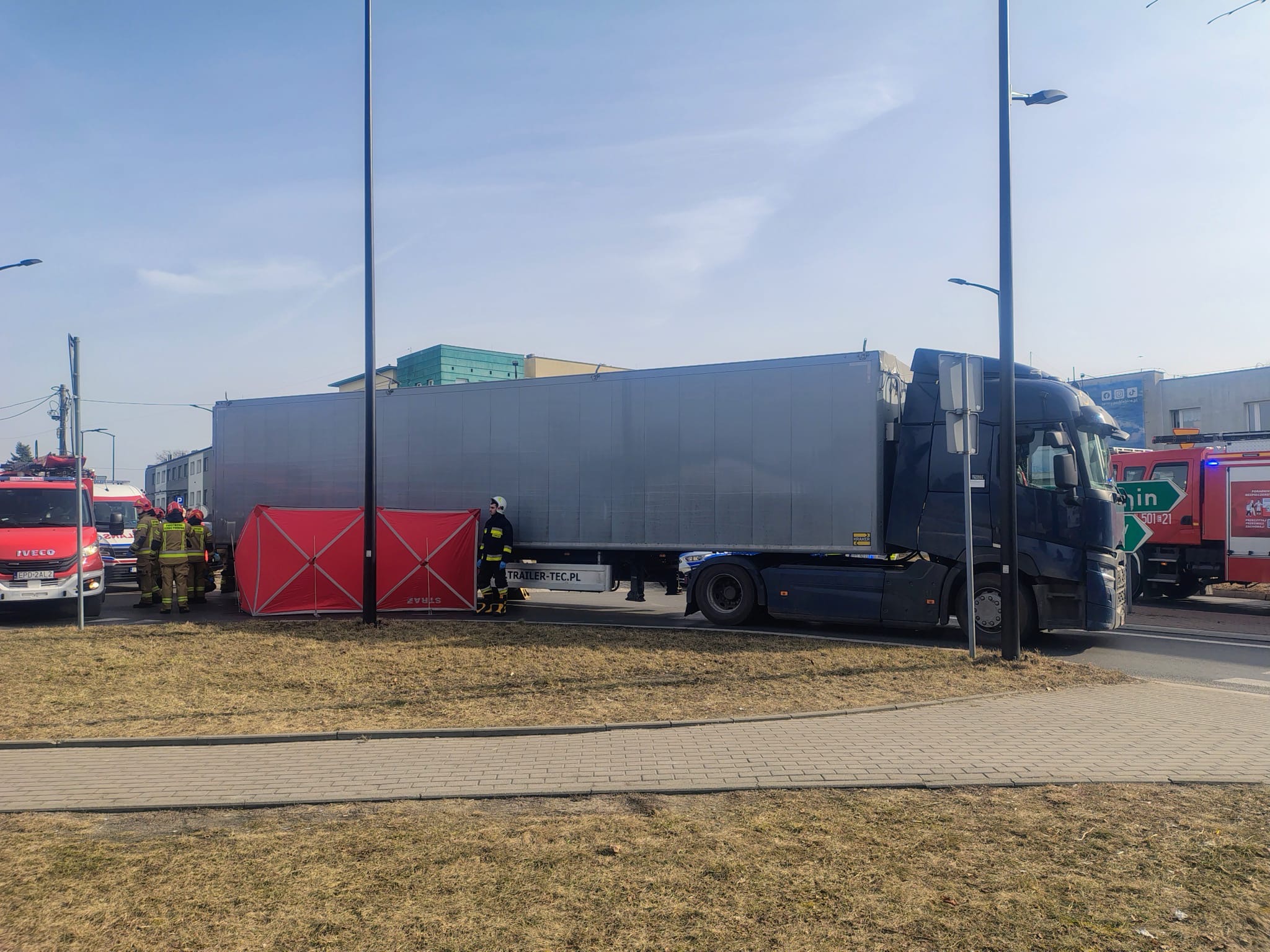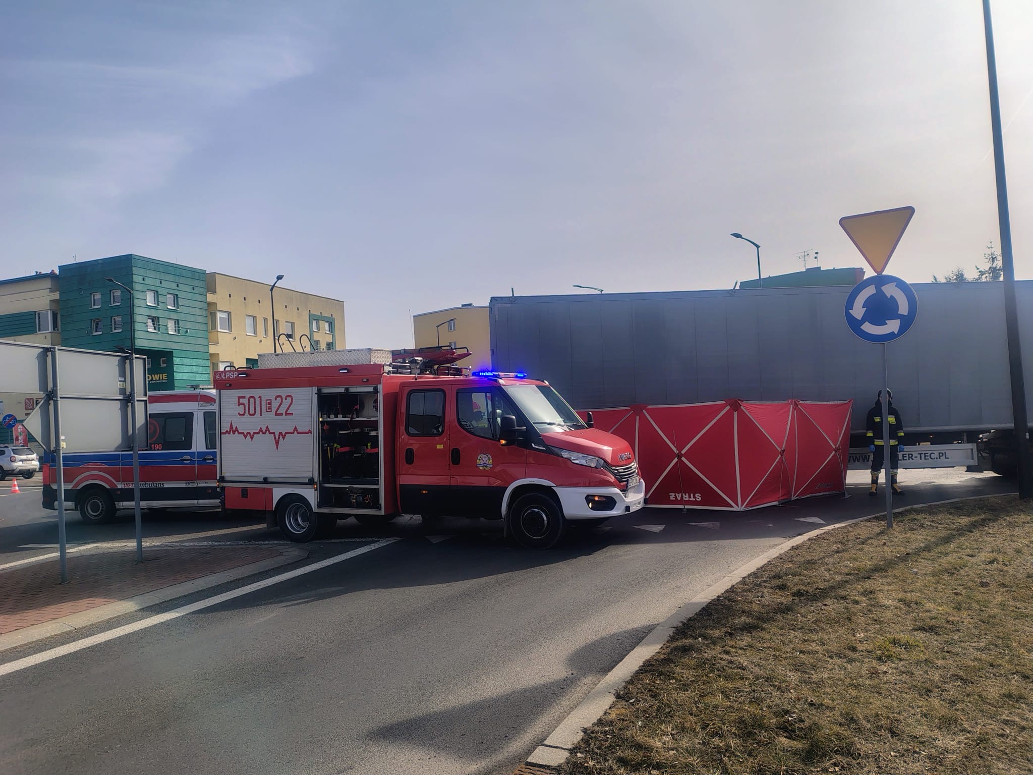 27.02.2026 roku o godz.12.27 Stanowisko Kierowania Komendanta PSP w Poddębicach otrzymało informację z CPR Łódź o zdarzeniu na rondzie drogi krajowej nr 72 w Poddębicach. Osoba piesza z nieustalonych przyczyn dostała się pod koła samochodu ciężarowego, w wyniku czego mężczyzna poniósł śmierć na miejscu.