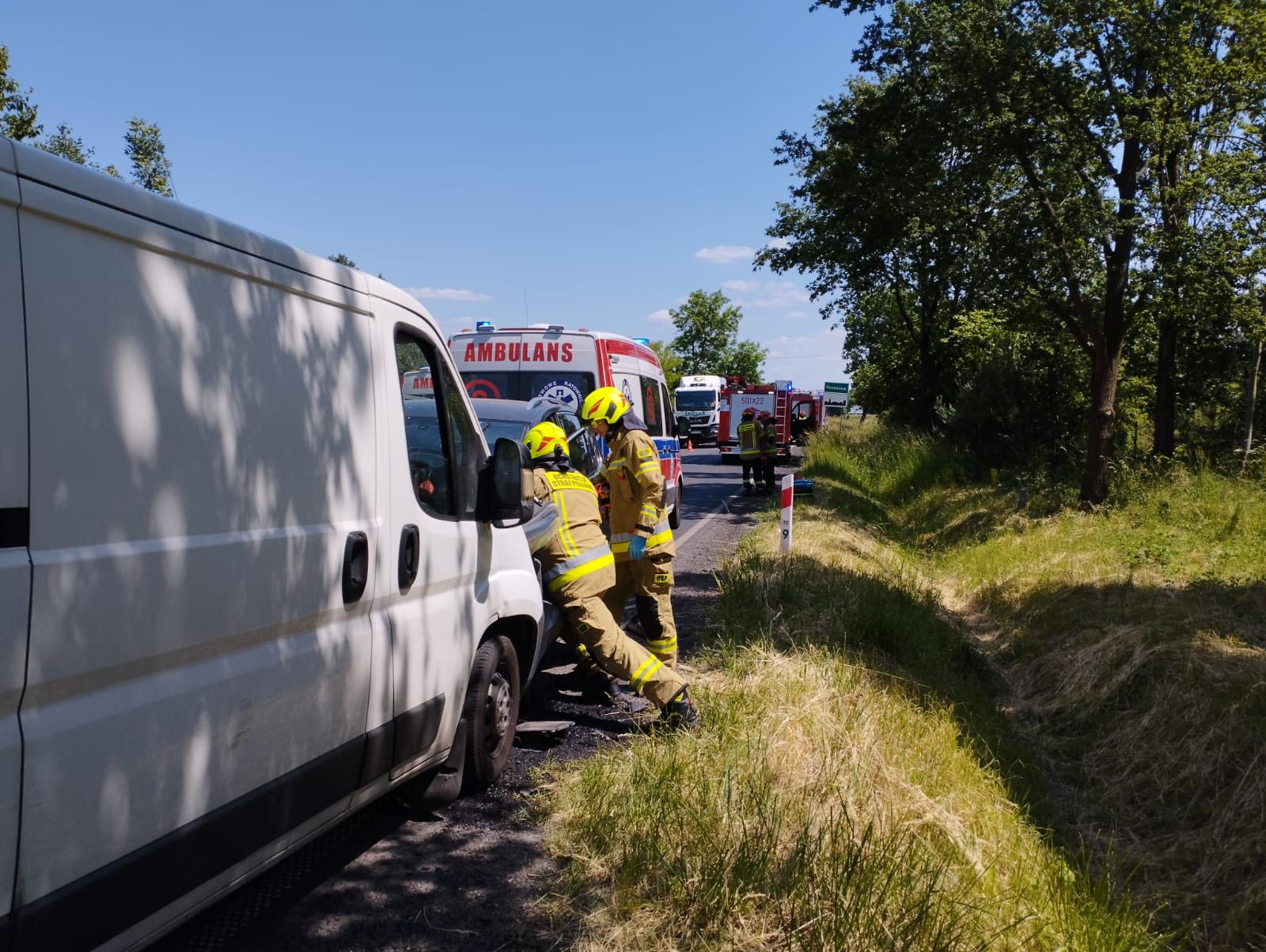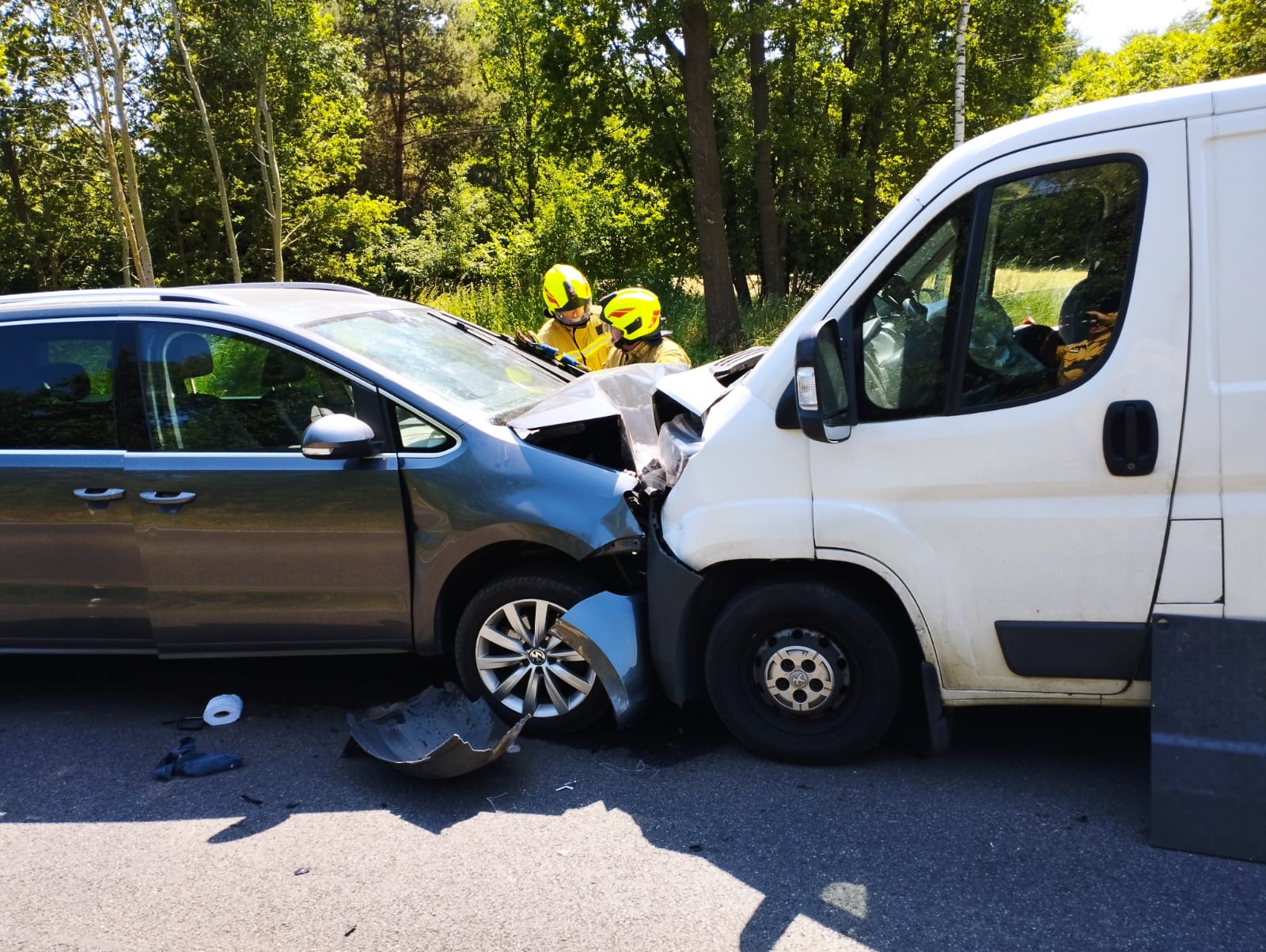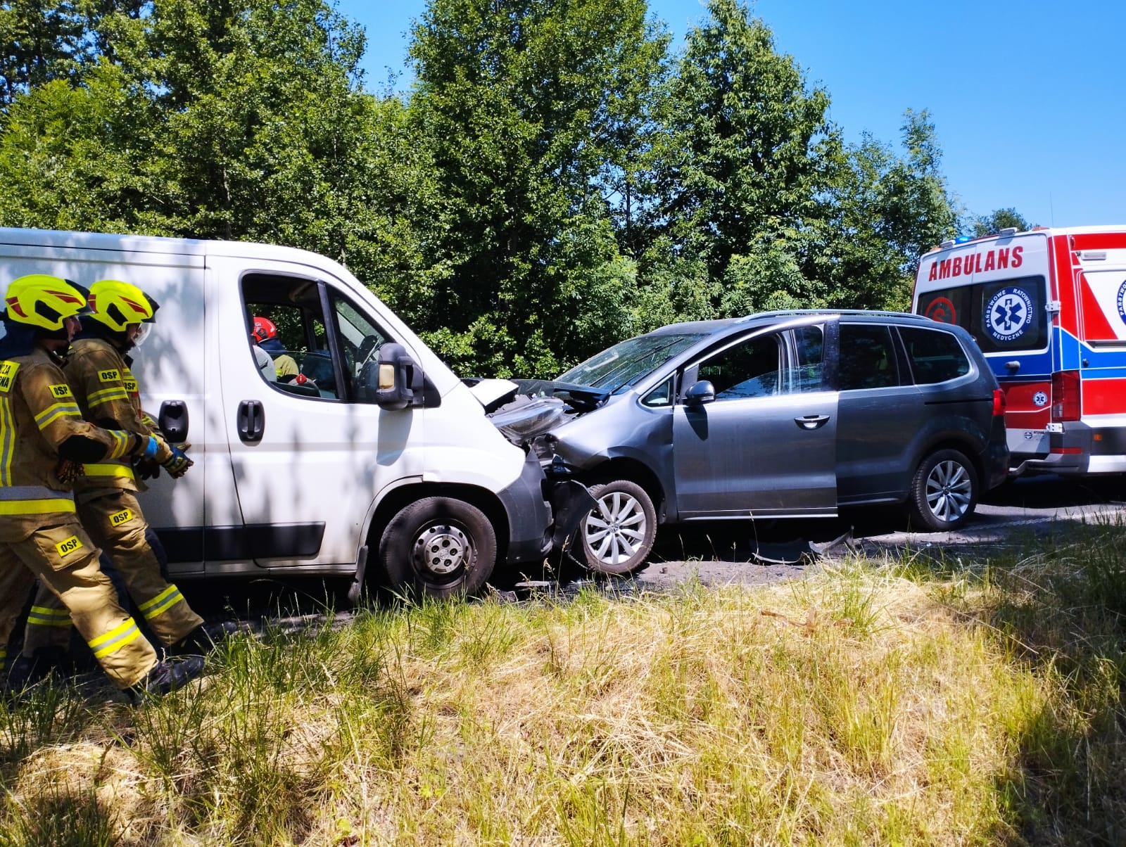 12.06.2023 r. o godzinie 13.16 Stanowisko Kierowania Komendanta PSP w Poddębicach otrzymało informację z CPR Łódź o wypadku komunikacyjnym ( zderzenie dwóch pojazdów) na drodze krajowej DK72 w miejscowości Józefka..W zgłoszeniu była również zawarta informacja o 2 osobach poszkodowanych. Po przybyciu na miejscu zdarzenia zastano dwa uszkodzone samochody osobowy i dostawczy uczestniczące w zdarzeniu, które blokowały jeden pas ruchu, osoby podróżujące znajdowały się poza pojazdami. W wyniku zdarzenia dwie osoby zostały poszkodowane (kierowca lat 69 i pasażerka lat 64 samochodu osobowego). Strażacy udzielili kwalifikowanej pierwszej pomocy poszkodowanym, a następnie przekazali ich przybyłym na miejsce Zespołom Ratownictwa Medycznego, które udzieliły medycznych czynności ratowniczych, a następnie obie osoby zostały przetransportowane do szpitala.