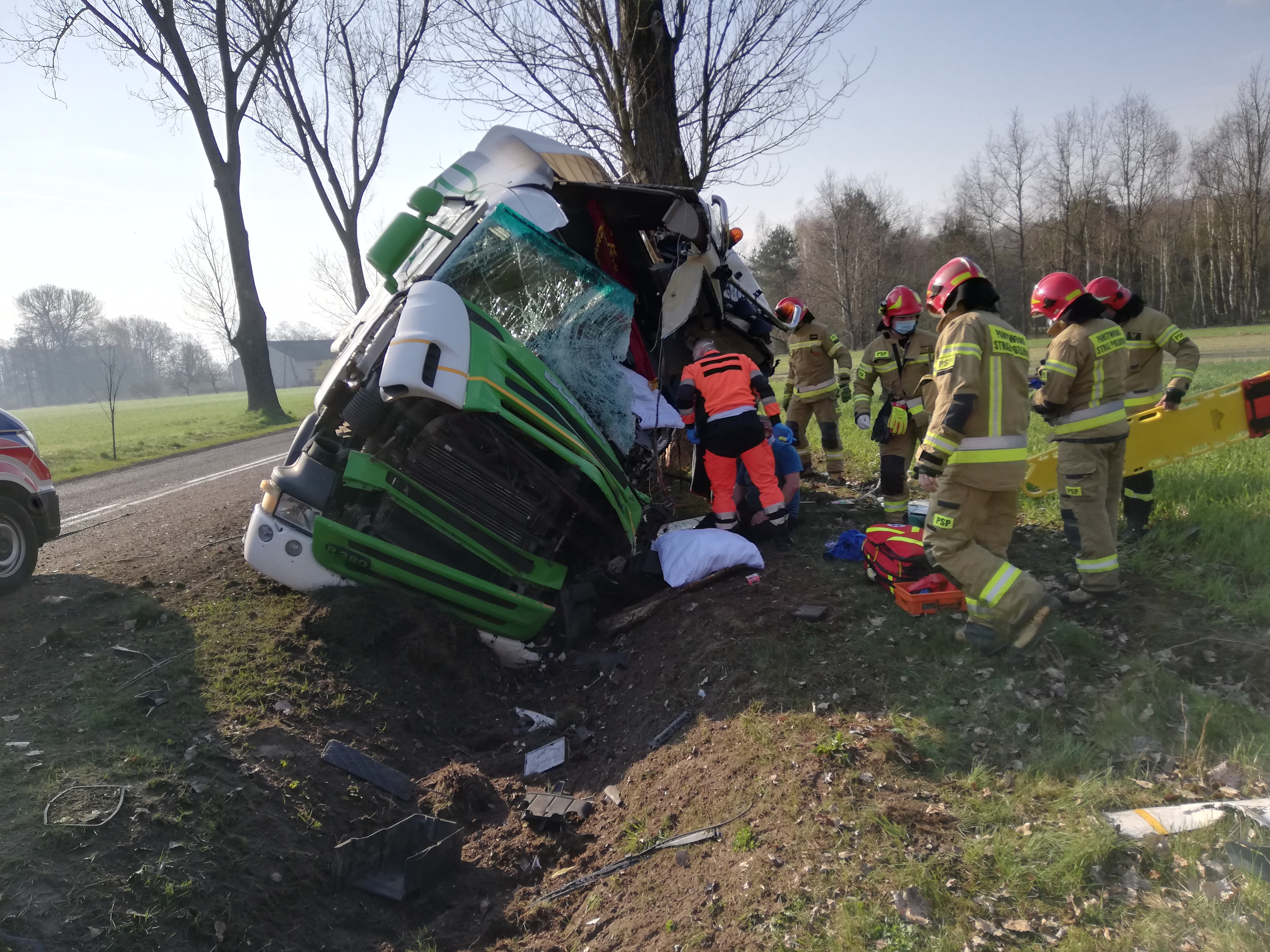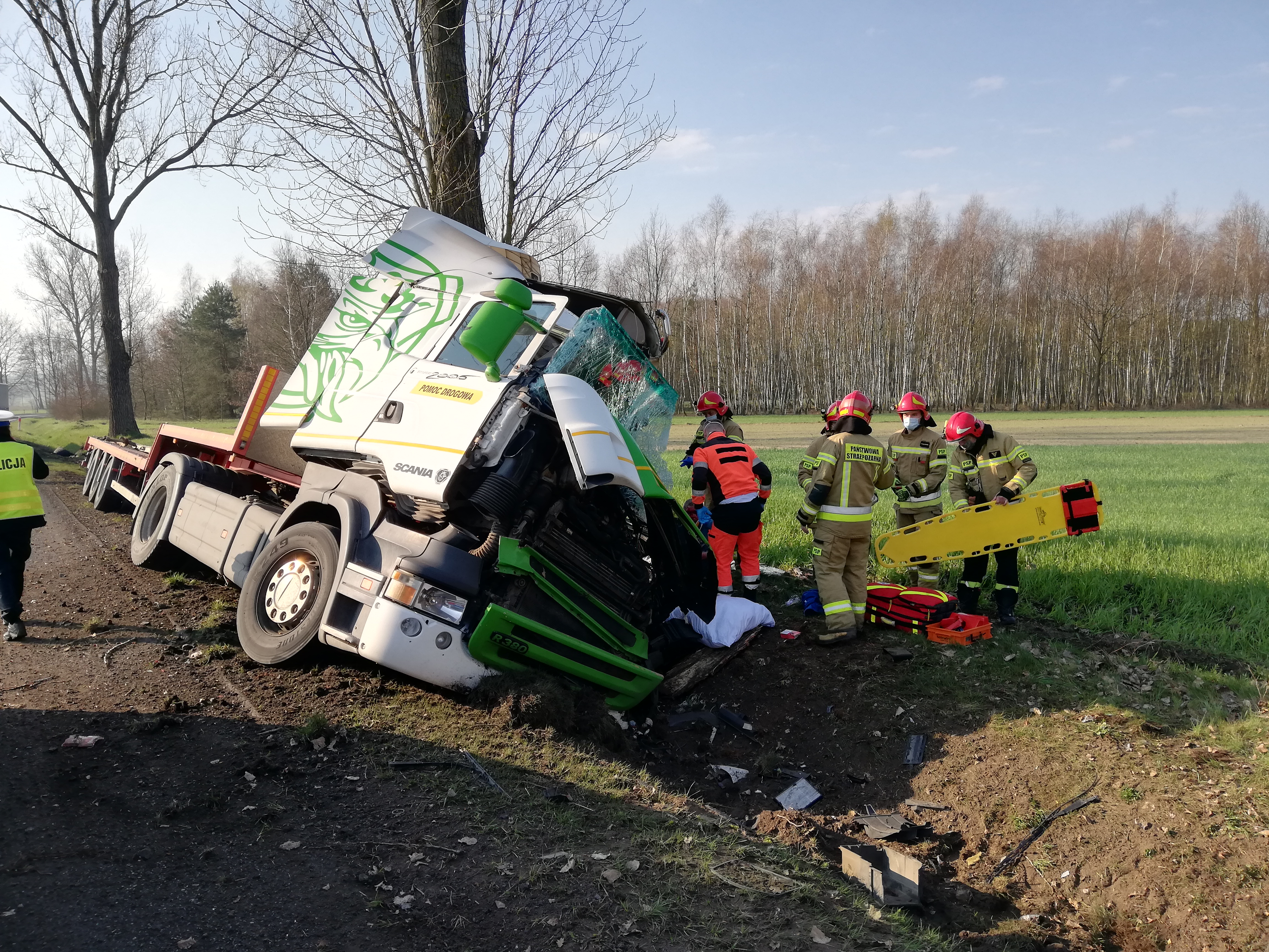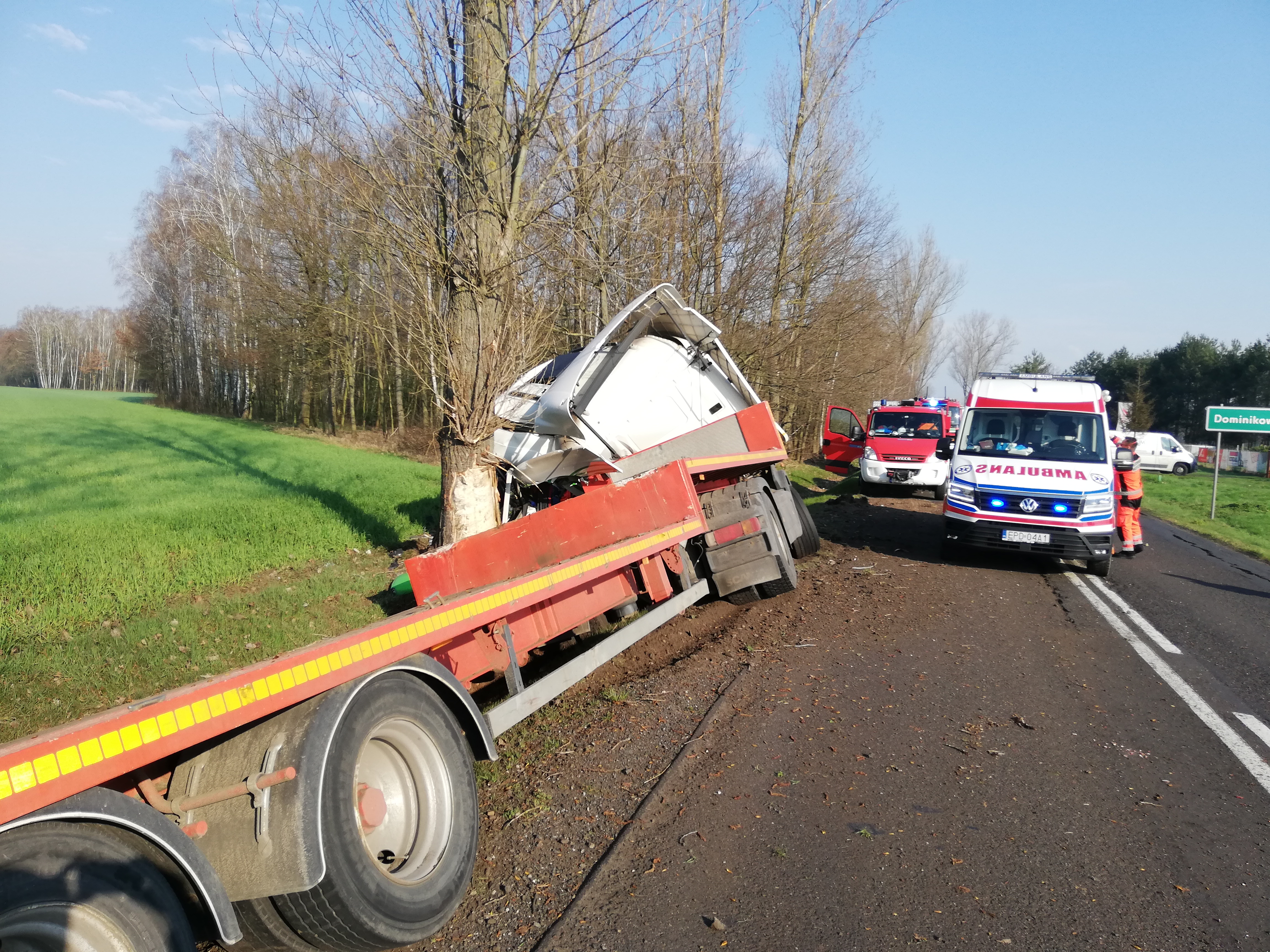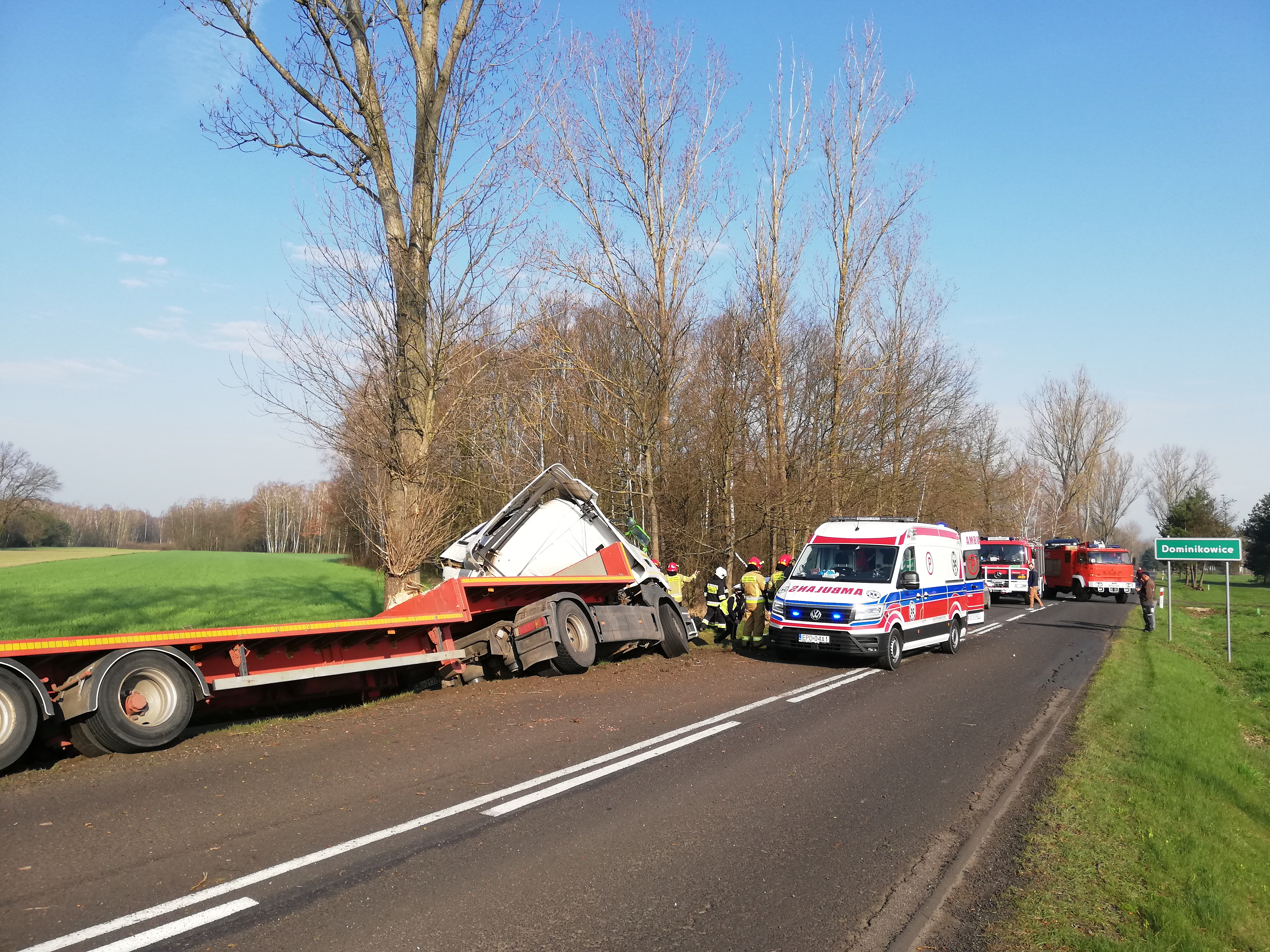 O godz. 08.05 dyżurny Stanowiska Kierowania Komendanta Powiatowego PSP w Poddębicach otrzymał informację od operatora CPR o zdarzeniu z udziałem pojazdu ciężarowego na drodze wojewódzkiej 473 w miejscowości Dominikowice, gm. Poddębice w wyniku, którego została poszkodowana jedna osoba. Zgodnie z obowiązującymi procedurami do działań zadysponowano całą obsadę Jednostki Ratowniczo-Gaśniczej w Poddębicach oraz najbliższe OSP. Po przyjeździe na miejsce zastano samochód ciężarowy wraz z naczepą, który po uderzeniu w drzewo znajdował się w przydrożnym rowie, osoba poszkodowana (kierowca) znajdował się poza pojazdem. Po udzieleniu kwalifikowanej pierwszej pomocy poszkodowanemu przez ratowników z JRG Poddębice, został on przekazany przybyłemu na miejsce zdarzenia Zespołowi Ratownictwa Medycznego.